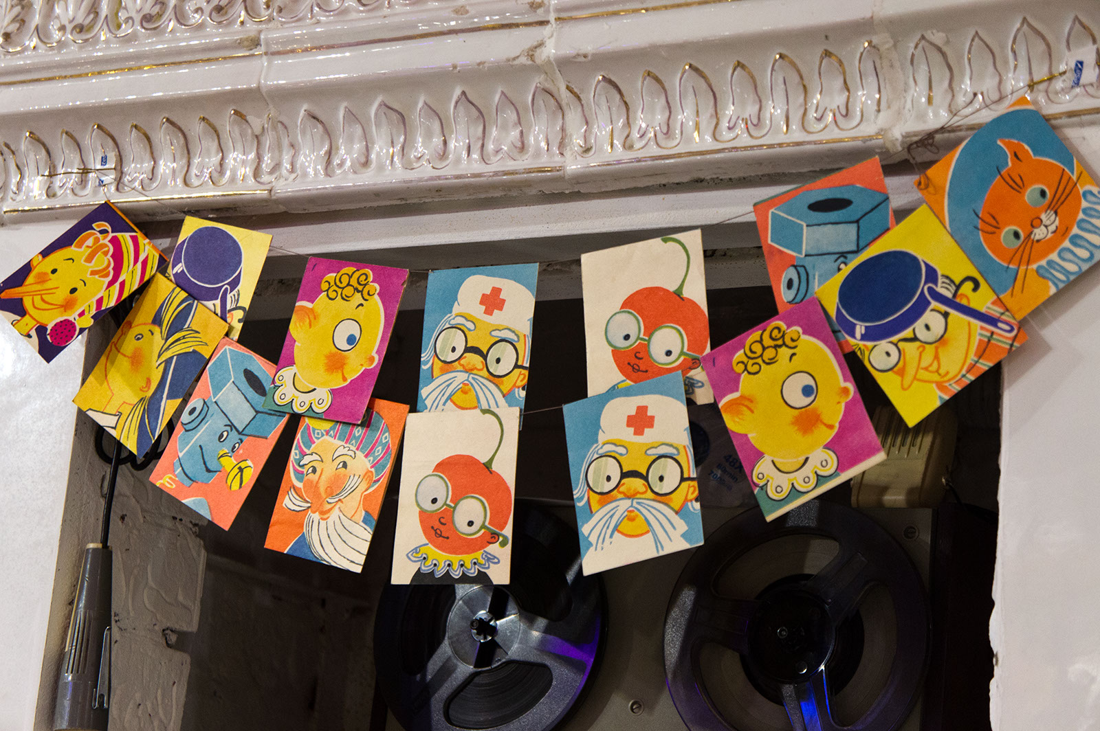 Фото №89100. Гирлянда из бумажных флажков, на которых изображены герои сказокВ 1950-х годах появилась серия «Доктор Айболит», Красная Шапочка и Кот в Сапогах, Буратино, колобок, конек-горбунок, избушки на курьих ножках, баба-Яга, костяная нога.