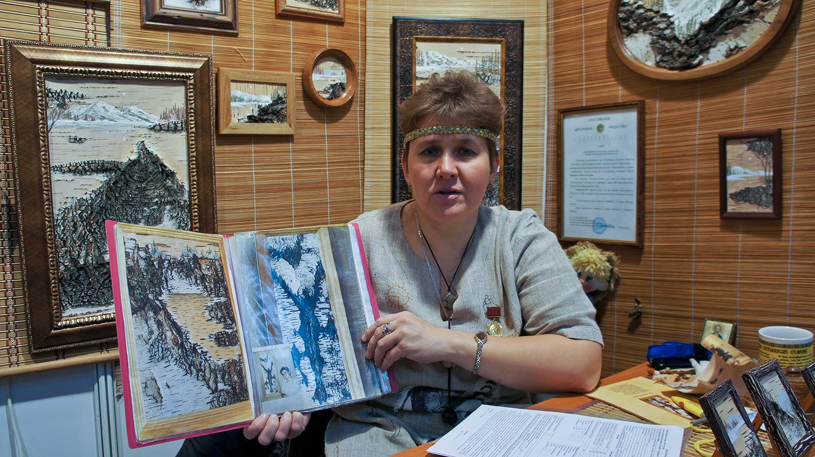 Фото №89933. Любовь Каркавина, "Березовая Русь", г. НовокузнецкЛюбовь Каркавина, "Березовая Русь", г. Новокузнецк. Берестой занимается девятнадцать лет. Картины из бересты экспонировала в 53 странах мира. Любовь Каркавина о породах берез, бересте кажется знает все. - Береста хранится очень долгое время. Раньше, как защиту от плесени и влаги, бересту клали под нижние венцы в избе - Рассказывает Любовь Каркавина. Береза много несет в себе информации. По наростам на коре Любовь определяет в какой местности произрастала та, или иная береза.