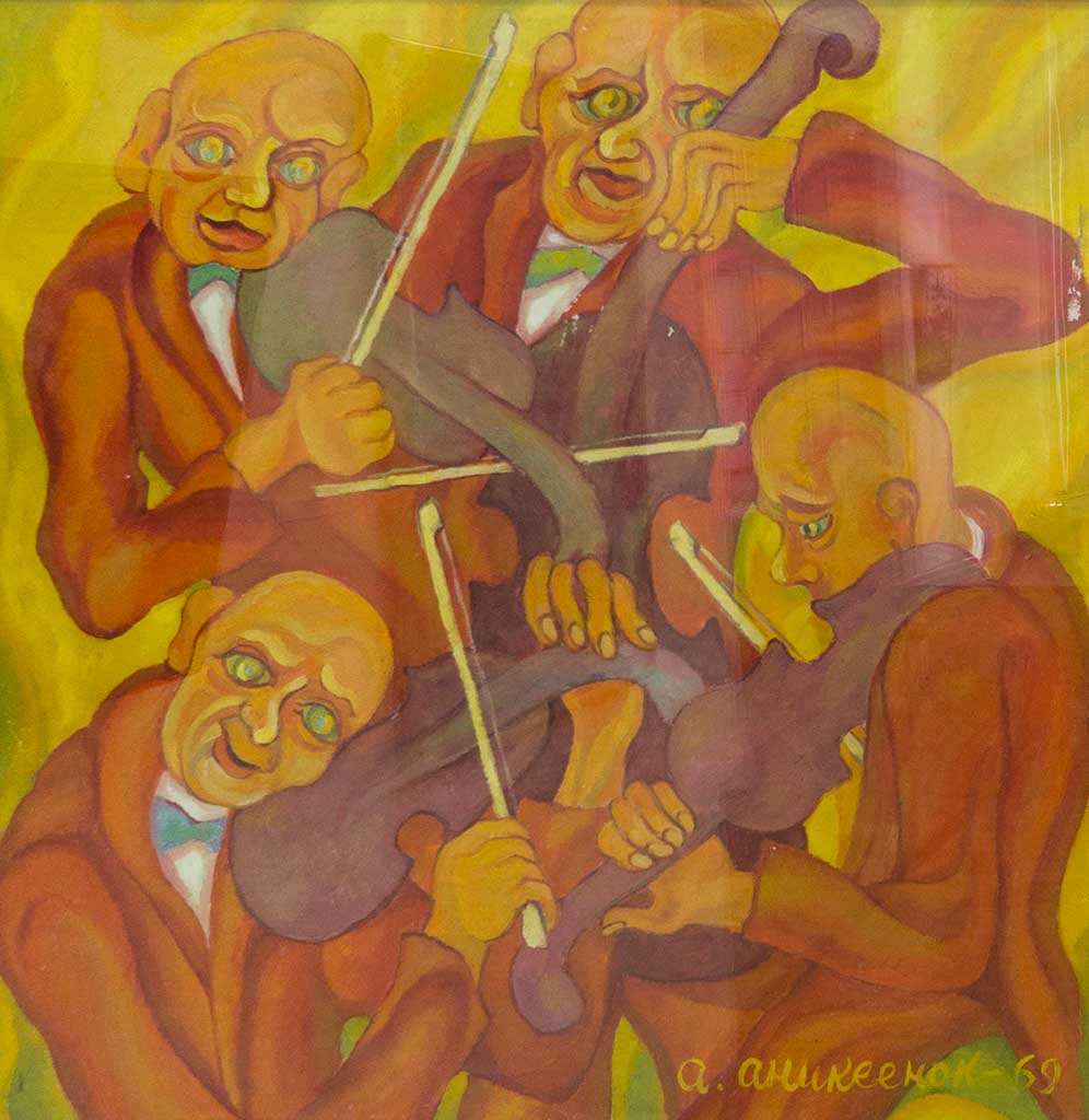 Фото №94025. Четыре музыканта. 1968 Аникеенок А.А. 1925-1984холст, масло; частное собрание. Персональная выставка Аникеенка А,А. в \"Хазинэ\", 17.02.2012Перед собравшимися на торжество, посвященное презентации книги и открытию выставки выступила директор ГМИИ РТ, Розалия Миргалимовна Нургалеева. Она отметила, что это знаменательное событие, прежде всего “возврат имени кем-то забытого, но не галереей, не художественным сообществом, художника”. - Удивляешься, возмущаешься, страдаешь, когда читаешь эту книгу. Но там все правда. Произведения Алексея Авдеевича Аникеенка снимали с выставок, критиковали, а они живут и несут в себе свет его души, - передала свои впечатления от прочитанного Розалия Нургалеева и продолжила - Аникеенок жил в другом месте и там был успешен, но всегда вспоминал Казань. Рисовал ее по старым своим эскизам, завершал картины, когда-то начатые еще в Казани.
