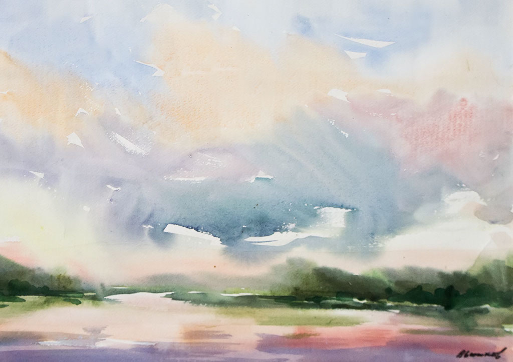 Фото №96906. Утренние краски неба. 2010. Вьюшков В.В., пос. Васильевобумага, акварель— Акварель нравится тем, что она очень сочная, маслом так не сделать — делится своими соображениями Виктор Васильевич Вьюшков — Утром, когда все спят, пришел на озеро, стал писать. Картина родилась за 10 минут, — вспоминает В.Вьюшков — Старался написать пока воздух свежий и прозрачный. Когда солнце светит и жарко, так не написать. Прим. автора: эта работа обошлась Виктроу Васильевичу в 2000 рублей, оштрафовали, за нахождение в заповеднике.