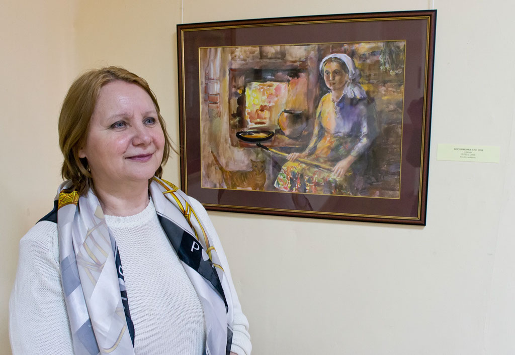 Фото №97038. Бердникова Т.М.Открытие Второй республиканской выставки акварели, 6 апреля 2012, ГСИ ГМИИ РТ.— Мне хотелось подойти к этой работе, еще раз посмотреть, чтобы ко мне опять вернулось настроение, которое я ощущаю всегда, когда думаю о маме, — рассказывает Татьяна Михайловна — создавая работу, я думала о своей маме. Это ее собирательный образ мамы. Хотя моя мама врач, современная женщина, я ее нарисовала около печки, где тепло, вкусно пахнет. Написала картину, после смерти мамы (она умерла старенькой, ей было 77 лет). На моей картине мама — молодая. Такой мне ее хотелось запечатлеть.