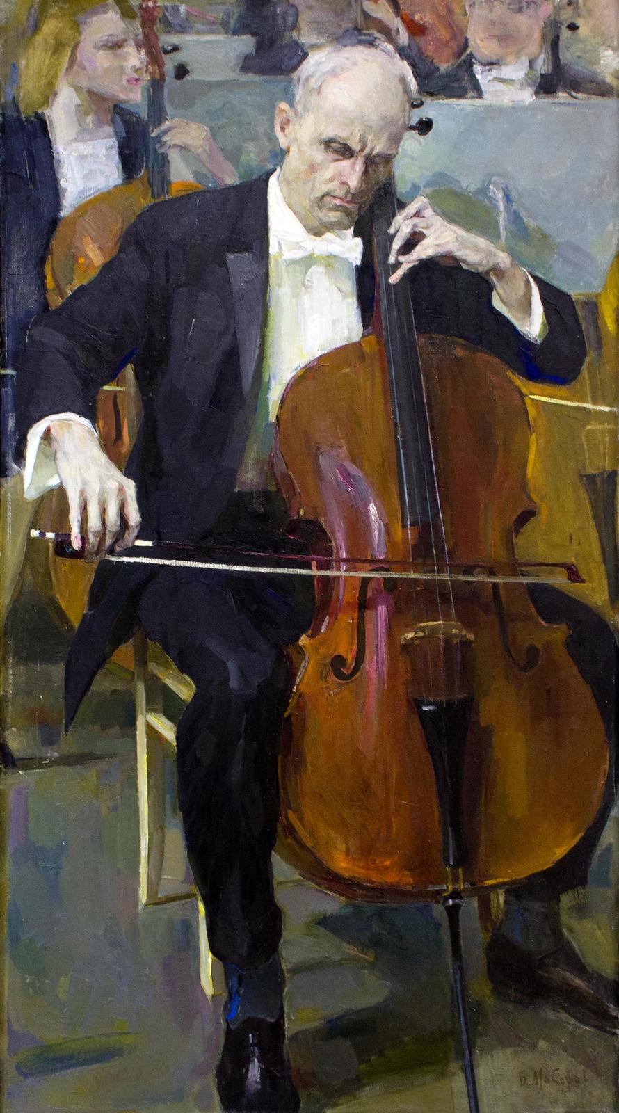 Фото №97093. Портрет виолончелиста. 1967. Майоров Б.И.(1931-1991)холст, масло; Собрание ГМИИ РТ.Хабибуллин Айрат Габдуллович, преподаватель КХУ, вспоминая свои годы учебы в училище рассказывает: — Мы, когда поступили в училище, очень завидовали тем, кто учился у Б. И. Майорова. Нам разрешалось показывать свои работы, и он смотрел, давал советы. Это было большой школы. О «Серебристой живописи» мы слышали еще обучаясь в художественной школе. Мы хотели уметь это делать, писать так как Майоров: импасто, вкусно, толстым слоем». Живопись Бориса Ивановича Майорова сегодня особенно востребована своей искренностью, глубиной, живописной культурой, основанной на самых лучших традициях. — Мы помним Бориса Ивановича. На долгие годы он будет с нами, потому что вот эти работы наполнены его энергией, — делится своими мыслями Татьяна Голубцова — никогда не надоедает смотреть, смотришь и каждый раз получаешь импульс. Проходя мимо работ замечаешь, что они уже отстранились от художника, они сами по себе существуют. Пока живо дело человека, он не умрет. Ольга Гильмутдинова, искусствовед, преподаватель Казанского художественного училища им. Н.И.Фешнна, призвала всех присутствующих к внимательному знакомству с произведениями Бориса Ивановича Майорова: — В наше стремительное время, когда мы всегда бежим, торопимся, у нас не хватает пяти минут, иногда минуты. На этой выставке у нас есть уникальная возможность остановиться и посмотреть вокруг себя: на уголки природы, на тихие места: Макарьевский монастырь, Владимирский собор, Суздаль. Посмотреть на мир вещей, вглядеться в лица людей. Если мы говорим о портрете, то можно попытаться понять, как же художник создавал эти портреты. Портрет Бориса Ивановича — это идея, сюжет и действие (динамическая композиция). В этих портретах заключены все эти три понятия. Посмотрите на портрет, вы нигде не увидите человека, который просто стоит, или сидит. Вы как-будто застали его за каким-то действием. Он что-то делает. Просто он ненадолго оглянулся на вас, или даже не оглянулся, как, например, «Виолончелист», или «Старушка за чтением».