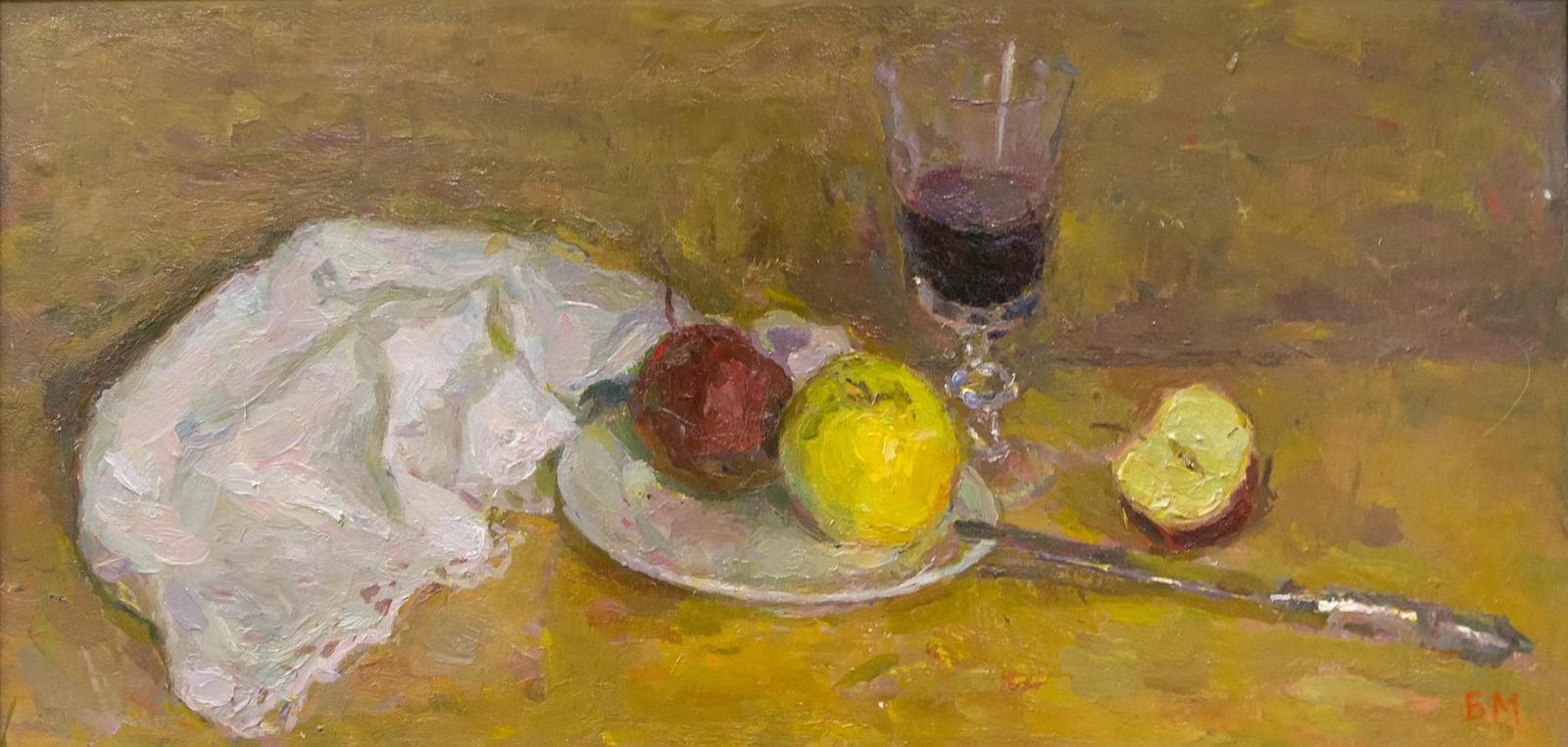Фото №97257. Яблоки и ивино. 1989. Майоров Б.И.(1931-1991)картон, масло; собрание семьи художника.Вагапов Махмут Ахатович, директор Казанского художественного училища имени Н. И. Фешина, директор филиала Московского государственного академического художественного института им. В. И. Сурикова в Казани, на открытии выставки с гордостью отметил, что носит «самое для себя дорогое звание „Ученик Бориса Ивановича Майорова“. — Мы, будучи еще совсем маленькими, юными студентами некоторые работы, которые сейчас висят в экспозиции, видели, на них учились, росли, — рассказывает М. А. Вагапов — особенно „Виолончелист“, „Портрет пожилой женщины за чтением“, „Кошка“ и ряд других произведений, которые мы всегда могли видеть в залах Государственного музея изобразительных искусств РТ. Для нас это огромная школа. Одно дело, когда мастер говорит, назидая, другое, когда ты видишь работы мастера, учишься на его полотнах…. Это не только прекрасный урок живописной грамоты, но и отношения к своему ремеслу, к своим студентам, к своей профессии».