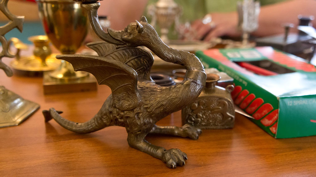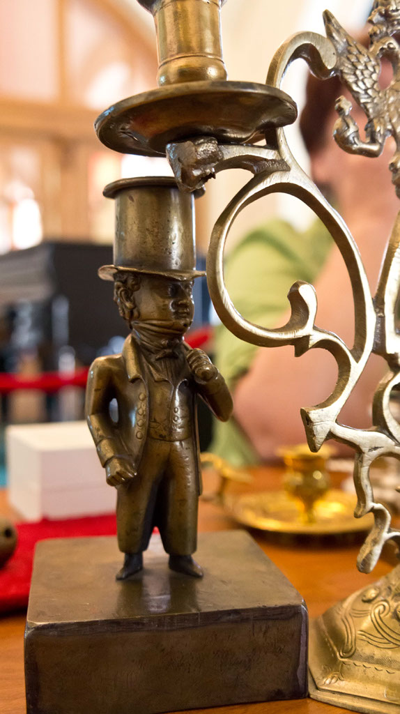 Фото №99475. Фондовый показ. ПодсвечникВ середине XIX века очень популярными были подсвечники в виде фигурок животных и людей. На столе стоит подсвечник в виде джентльмена с цилиндром на голове. В цилиндр и ставилась свеча. Привлекли мое внимание маленькие ножнички со специальной коробочкой, как оказалось, они использовались для снятия нагара со свечи.