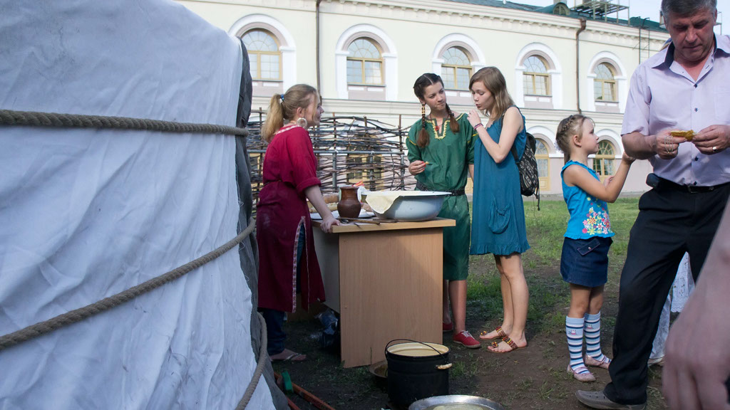 Фото №99607. До окончания праздника дошли не все Здесь же во во дворе, в юрте было организовано восточное чаепитие. Сладости и лепешки готовили возле юрты юные стряпухи нимфы. Лепешки получились очень вкусные.