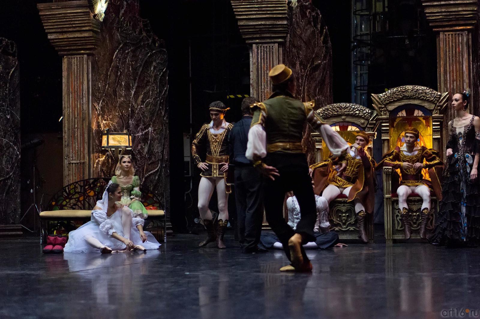 Фото №102412. Art16.ru Photo archiveАндрей Злобин, художник из Киева подготовил эскизы декораций к спектаклю. Владимир Самохин, художник ТГАТОиБ, расписал задник и кулисы, жесткие конструкции заказали в Москве. Для спектакля было сшито 150 костюмов, из них 45 пачек и 4 свадебных платья. Их изготовили по эскизам Анны Ипатьевой (Киев) и технологической карте пошива костюмов Златы Стога.