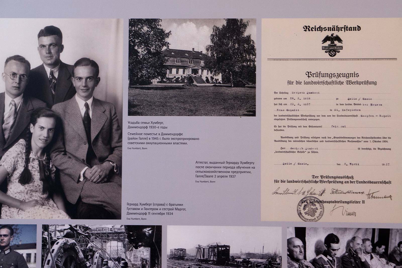 Фото №105439. Герхард Хумберт с братьями и сестрой /усадьба семьи Хумберт / Аттестат Г.ХумбертаНа выставочных стендах — фотографии, документы, письма людей, вовлеченных волею судьбы, в театр военных действий. Их судьбами написана история. Всего 24 биографий немецких и советских граждан: военный; женщина, вышедшая во время войны замуж за солдата и ставшая вдовой; подросток, отправленный на принудительные работы; военнопленный и узник концлагеря; депортированный поволжский немец; еврейка и мн. др.