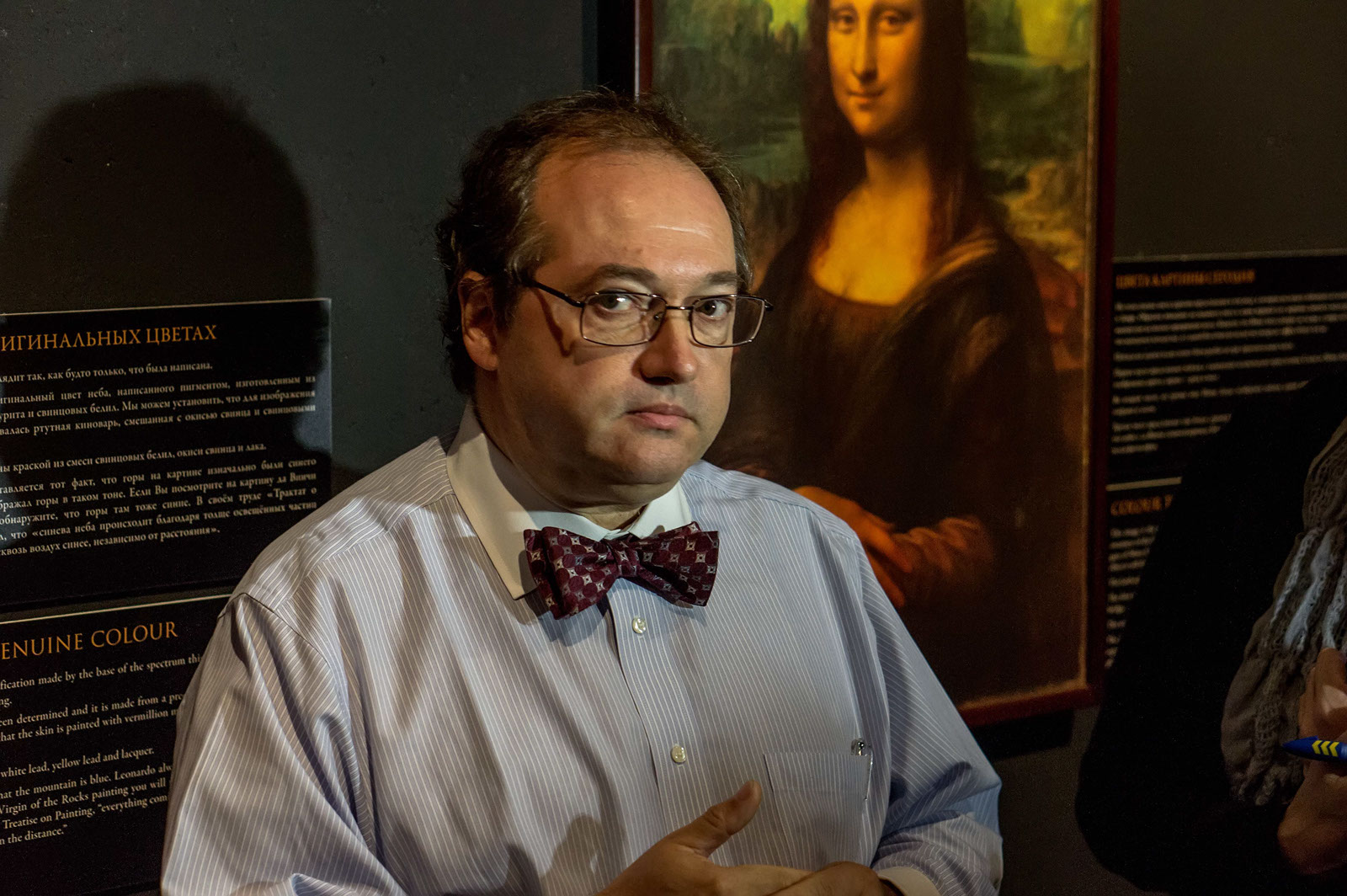 Паскаль Котте, создатель проекта «Секреты Моны Лизы» французский инженер-оптик изобрел мультиспектральную 240-мегапиксельную фотокамеру с уникальной линзой. Именно ему, Лувром и Министерством культуры Франции было предоставлено эксклюзивное право, снимать «Мону Лизу» без стекла. На выставке представленмы видим синтез результата его работы. Паскаль Котте начинает рассказ о своем проекте.