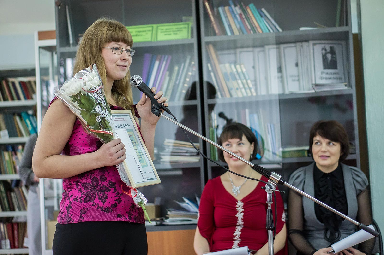 Фото №116622. Рина Бадриева (вторая слева)Премии вручали именитые гости. Следует отметить, что по дороге из Казани в Арск, писатели и журналисты посетили местное кладбище, возложили цветы на могилу классика татарской литературы и его жены. Затем прибыли в библиотеку.
