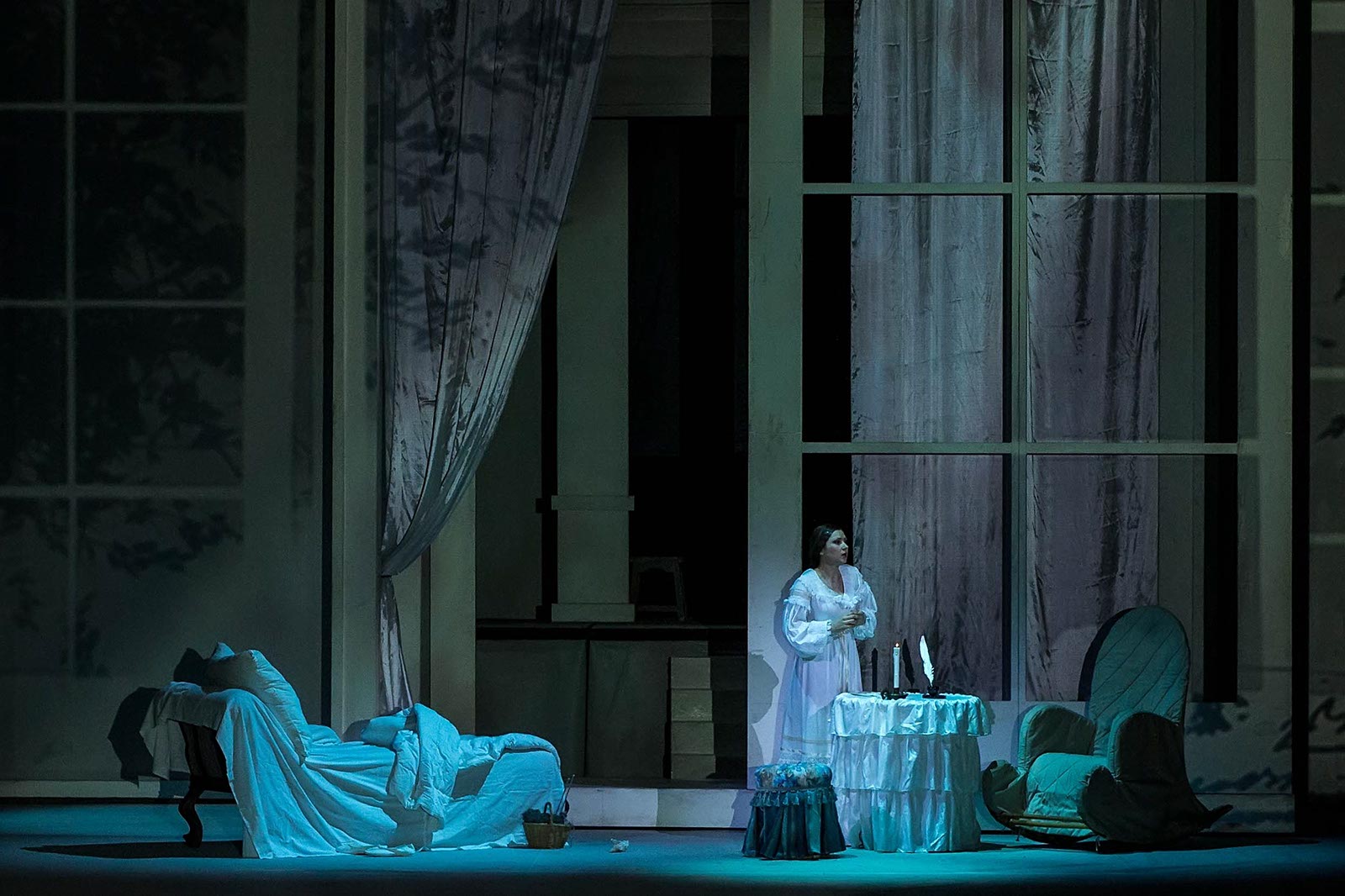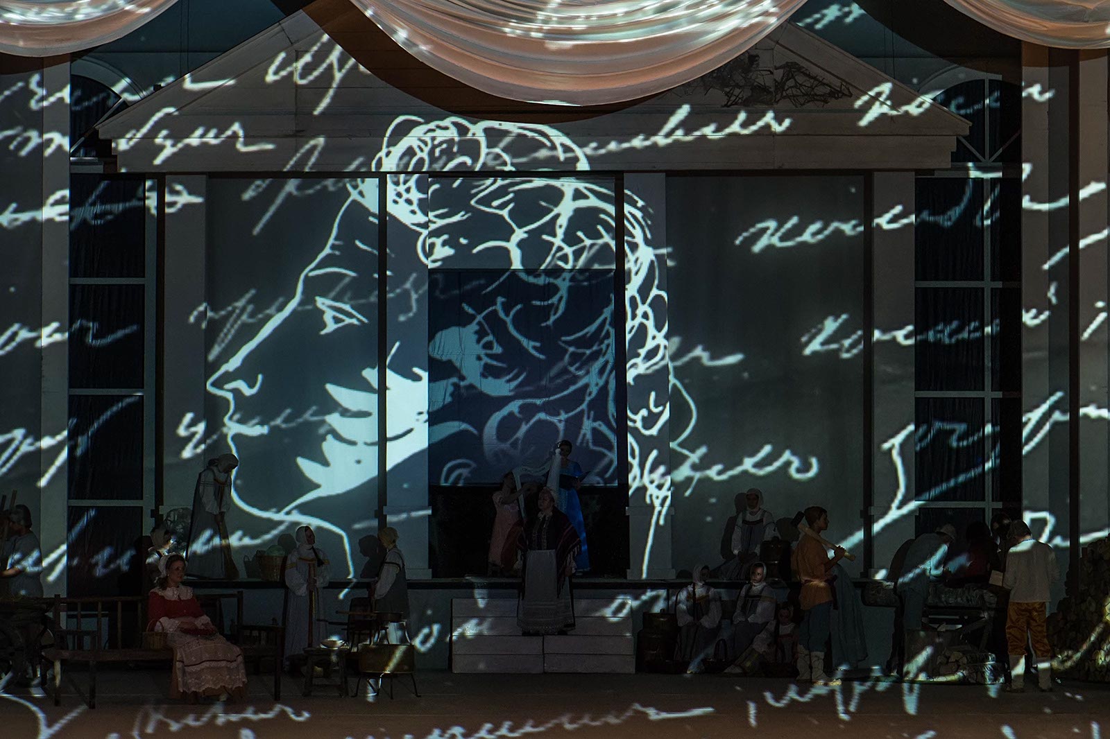 Фото №133979. Усадьба Лариных; помещичий дом с террасой, выходящей в старый запущенный садОпера "Евгений Онегин". 1-е действие, 1 картинаЭто второй спектакль XXXI Международного оперного фестиваля им. Ф. И. Шаляпина. 1-2 февраля на сцене театра прошла премьера оперы Дж. Верди «Аида». Сегодня в театре - опера П. И. Чайковского «Евгений Онегин», по одноименному роману в стихах А. С. Пушкина (постановка 2012 г.).