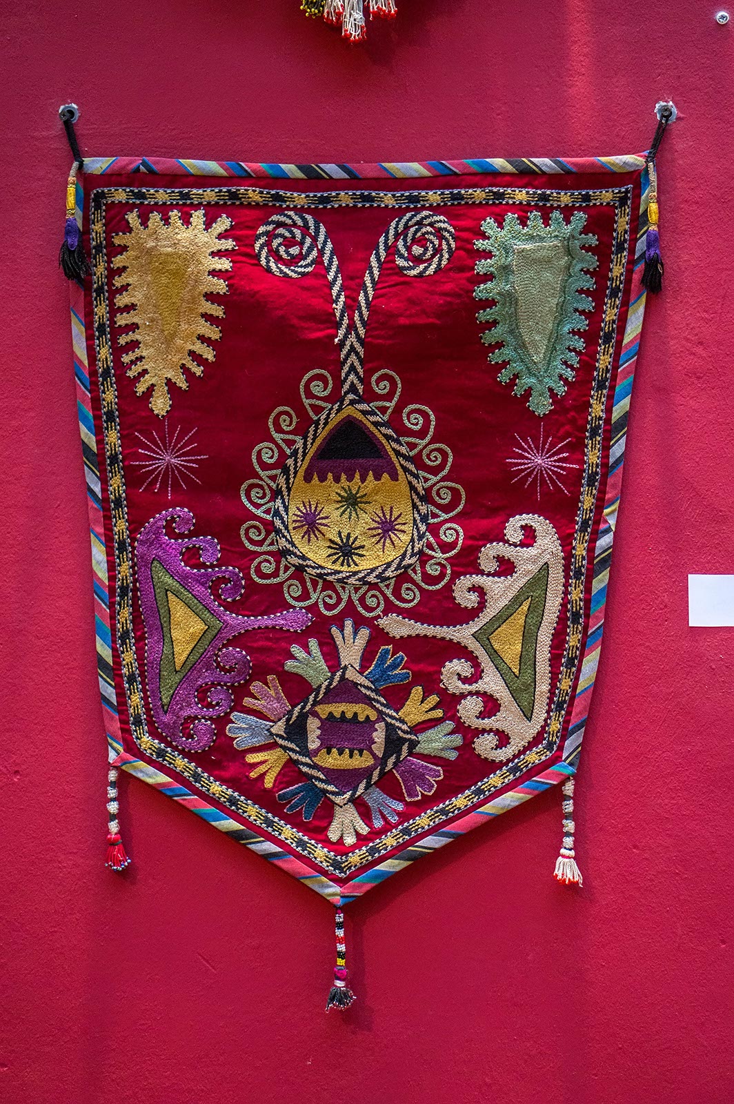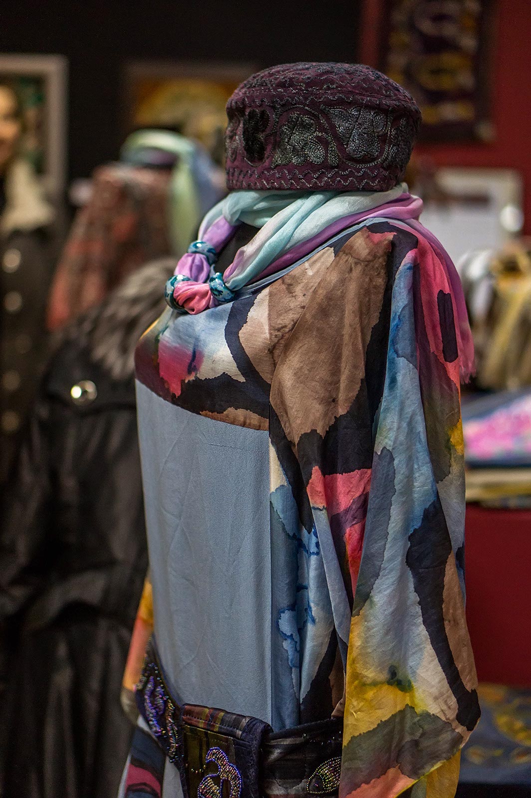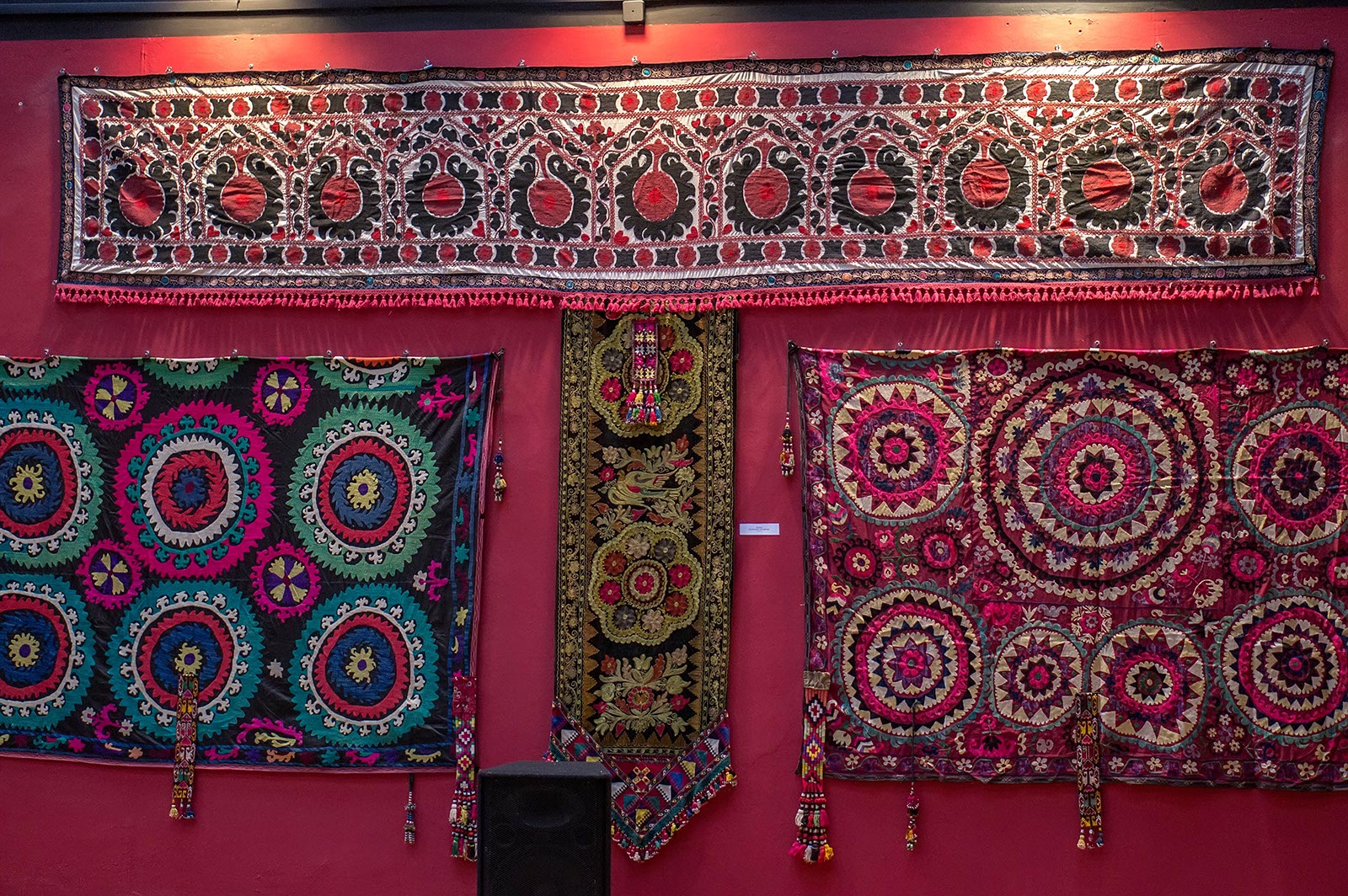 Фото №135803. Сюзане, элементы отделки На выставке экспонируется более 200 произведений искусства, также работает торговая лавка. В ней можно приобрести товары ферганских мастеров (платки, шарфы, головные уборы, сумки, украшения, текстиль и мн. др.). Возле торговой площадки стоит несколько манекенов в национальной узбекской одежде — авторская коллекция этнической одежды производства