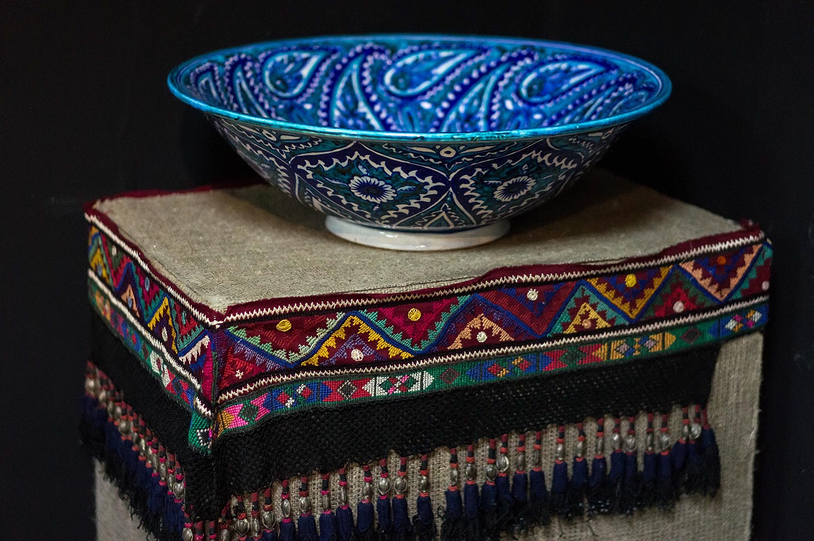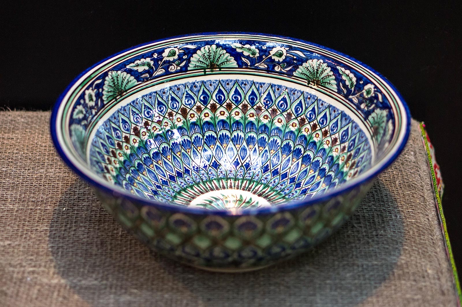 Фото №135671. Мастерская керамики Рустама УсмановаМастер из г. Риштана Рустам Усманов — один из лучших гончаров Узбекистана. На его родине, в доме, где он живет, располагается и мастерская, и музей риштанской керамики. Рустам Усманов с выставками объехал весь свет. Его произведения хранятся во многих музеях мира. В экспозицию выставки «Восточный караван» включены его пиалы, ляганы, тарелки.