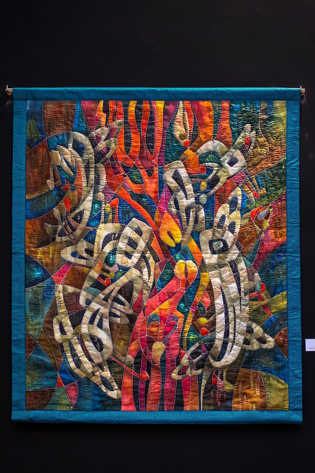 Фото №136001. ПАТЛАЙ ВЛАДИМИР АРЛЕКИН Чий, шёлк шерстьХудожники из Ферганы — супруги Владимир Пучковский и Светлана Шихова демонстрируют публике цикл работ, выполненных в технике гобелена и уникального авторского рельефного стеганого батика. Они используют технологию вышивки по верёвочному рельефу шёлковой нитью, подсказанную техникой бухарского золотого шитья. В работе мастера применяют: натуральные красители, изготовленные из местных растений; ручную набойку штампами, вырезанными из древесины фруктовых деревьев.