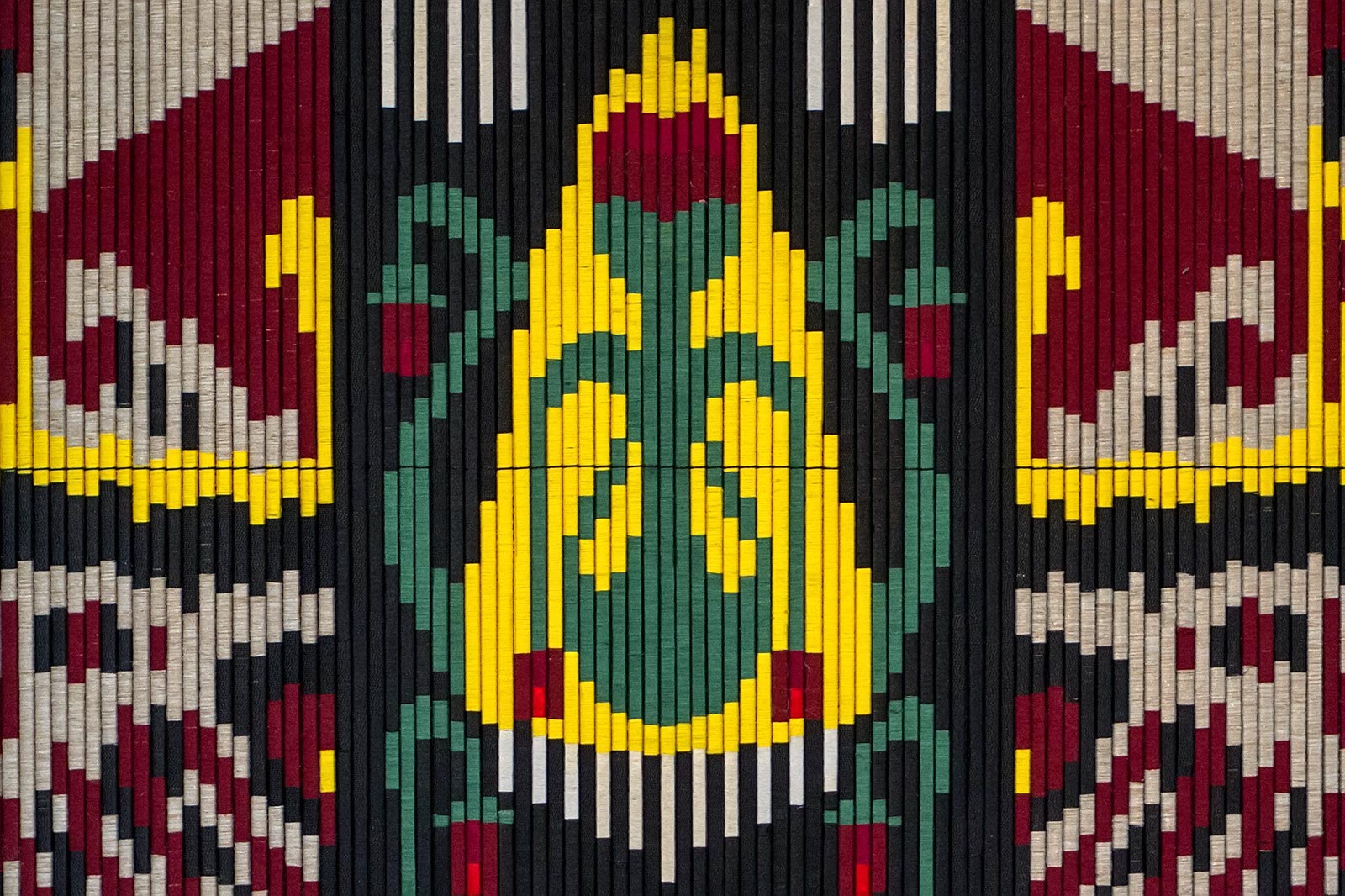 Фото №135965. ПАТЛАЙ ВЛАДИМИР ОБЕРЕГ Чий, шёлк, шерстьПлетение из чия — традиционная художественная техника среднеазиатского народного прикладного искусства, в котором, как материал используется растущий в степи тонкий тростник — чий. Высушенные стебли чия оплетают шерстью, окрашенной в разные цвета, в результате чего изделие покрывается узором.