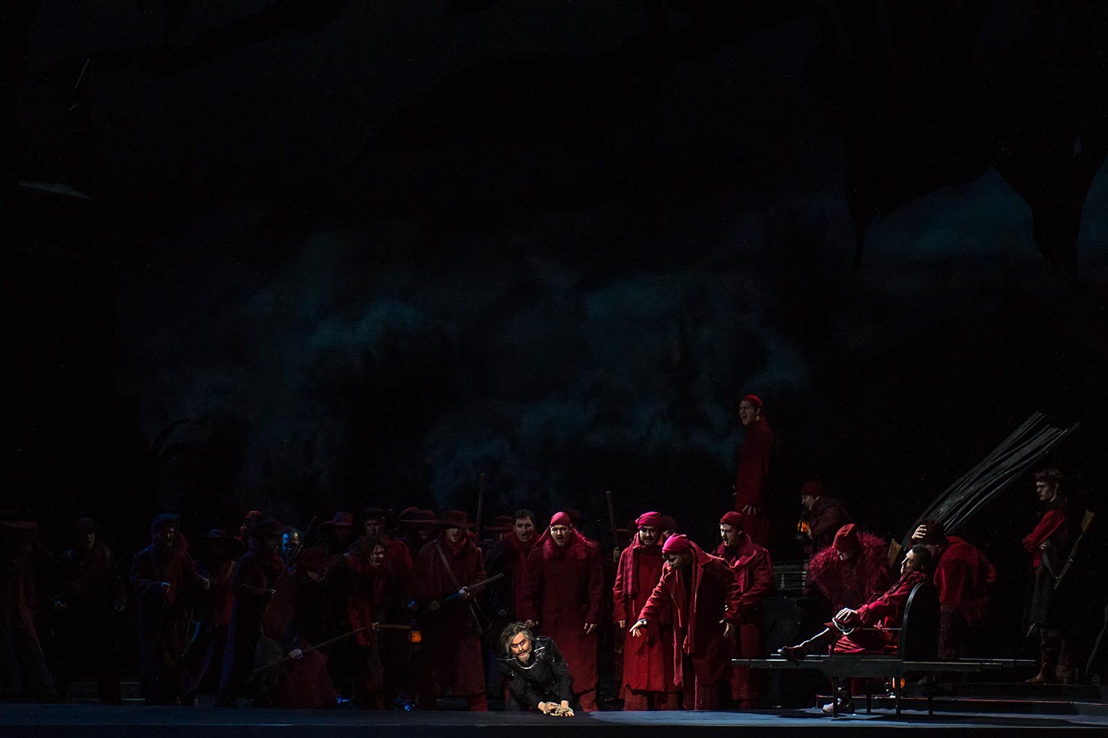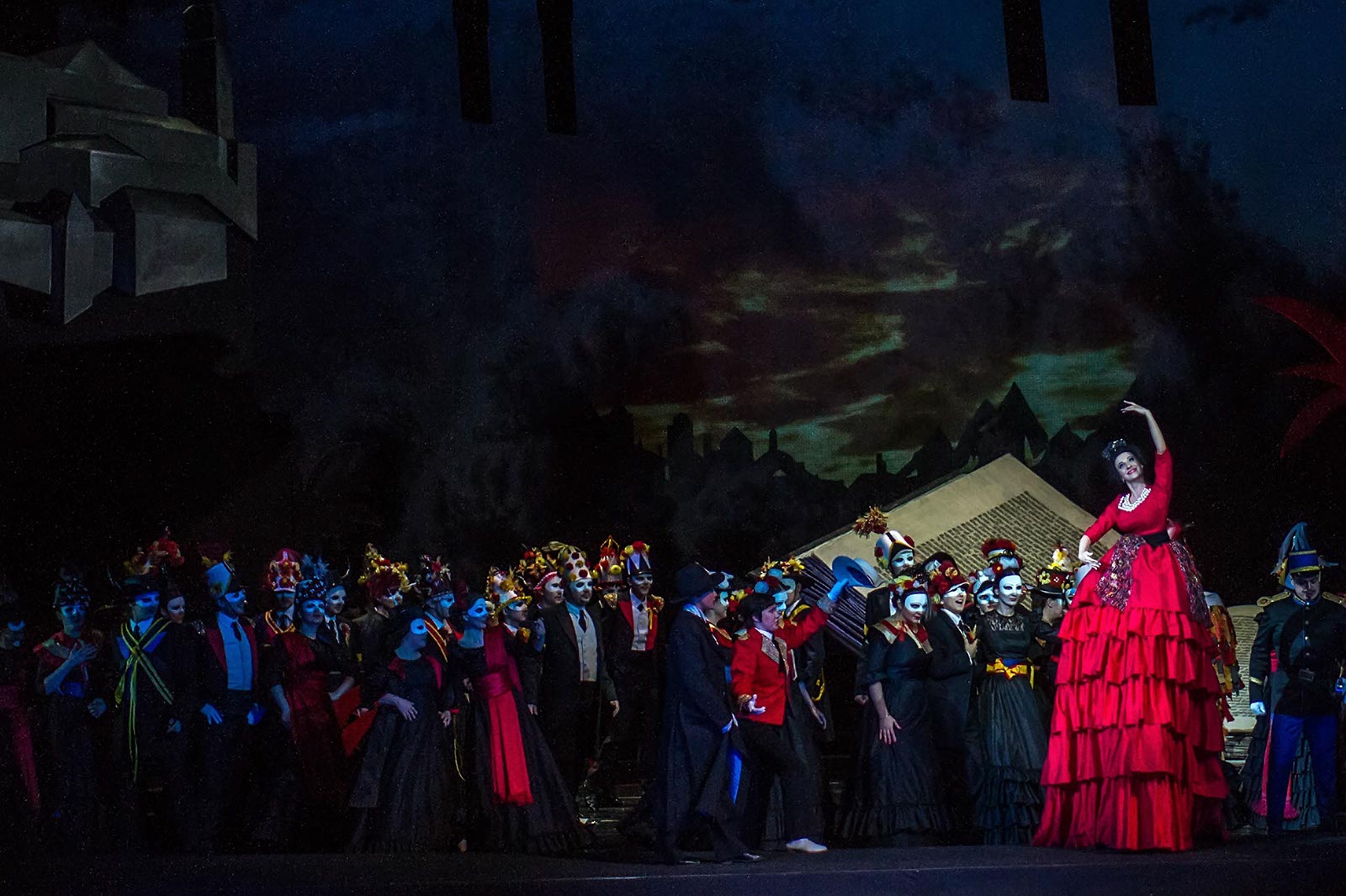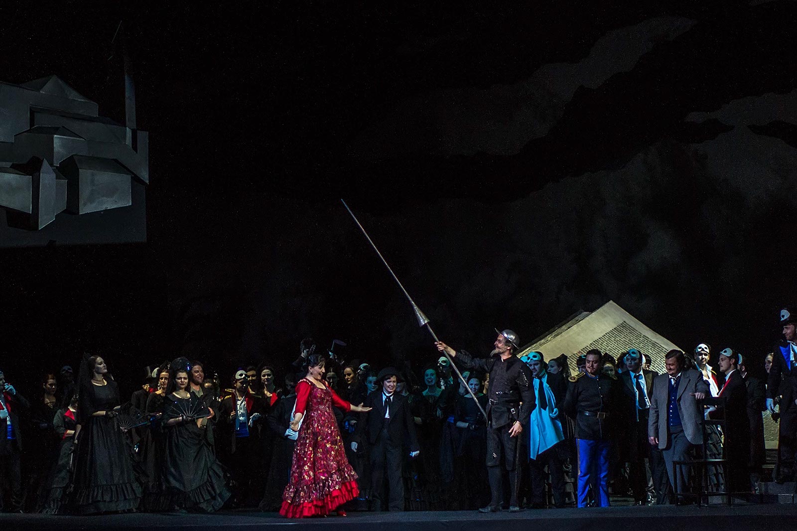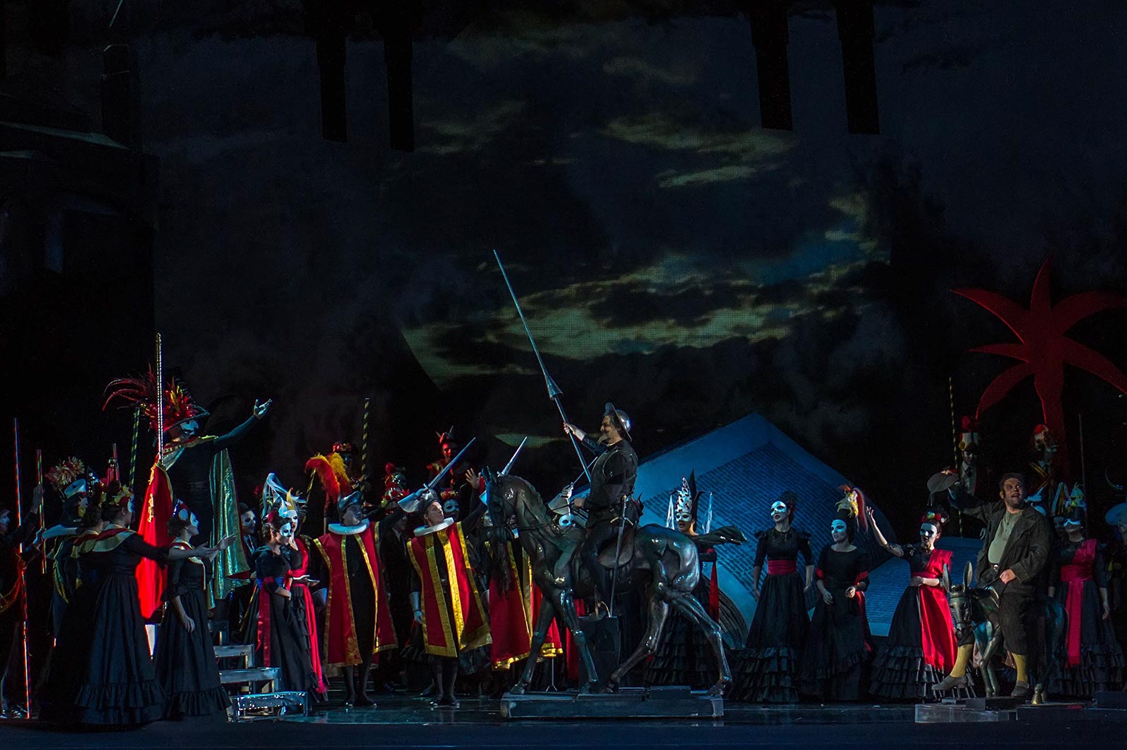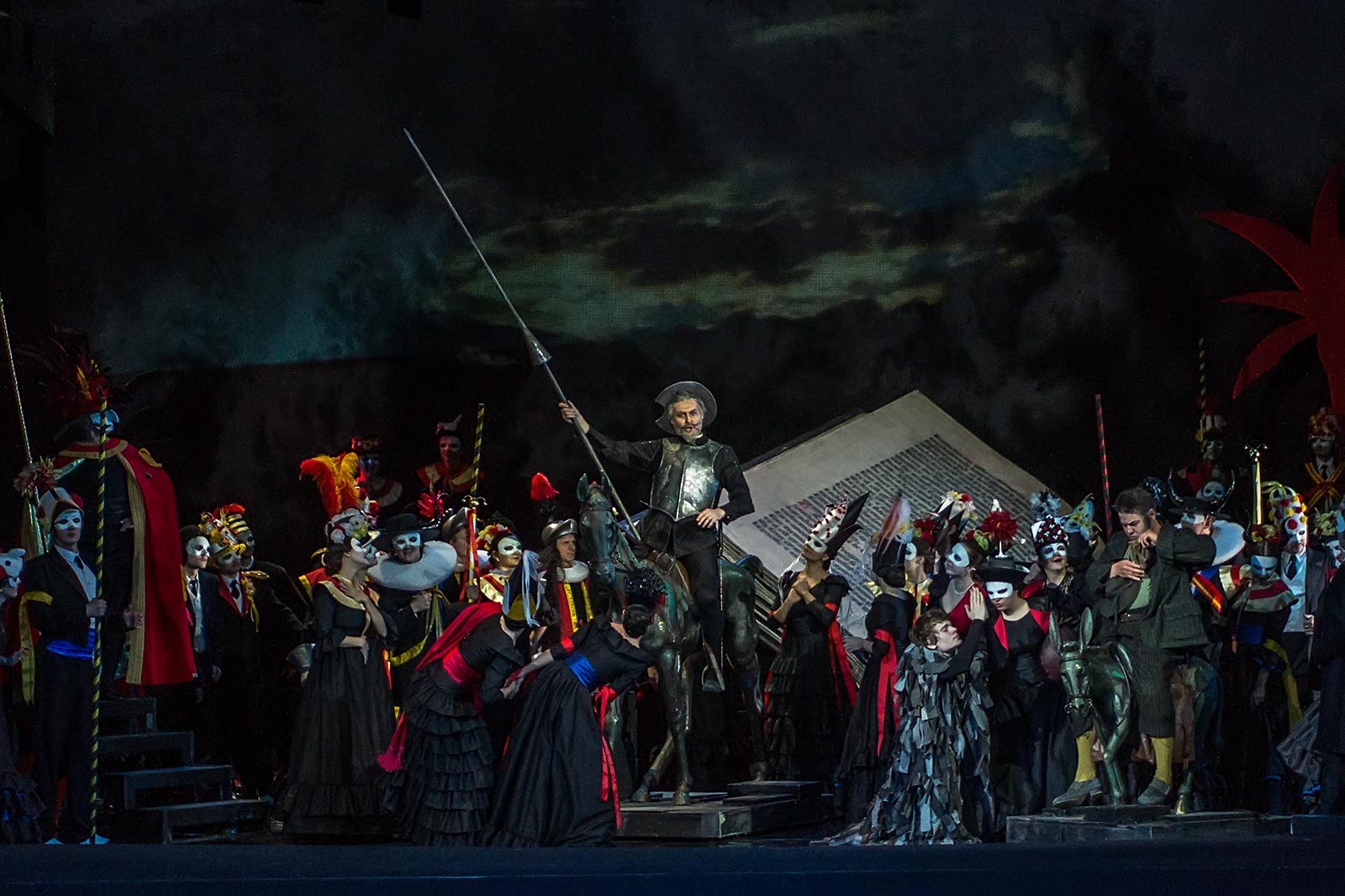 Фото №138694. Art16.ru Photo archiveДульсинея, вышедшая в первом акте на ходулях (не знаю точно, как это было реализовано), маски на лицах толпы, роднят постановку с комедией дель арте (комедией масок). Забываешь, что звучит французская речь, перед глазами является Италия.