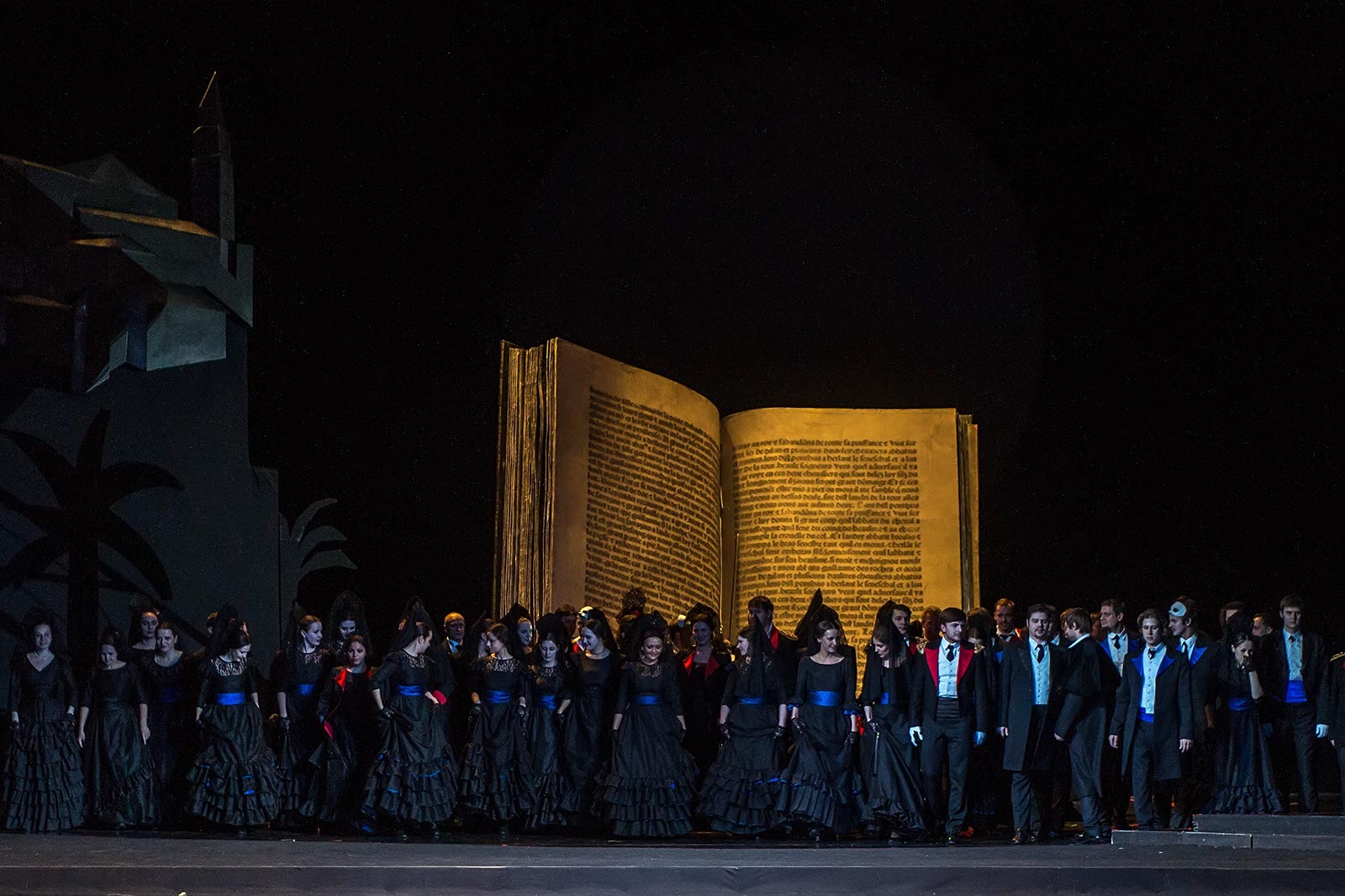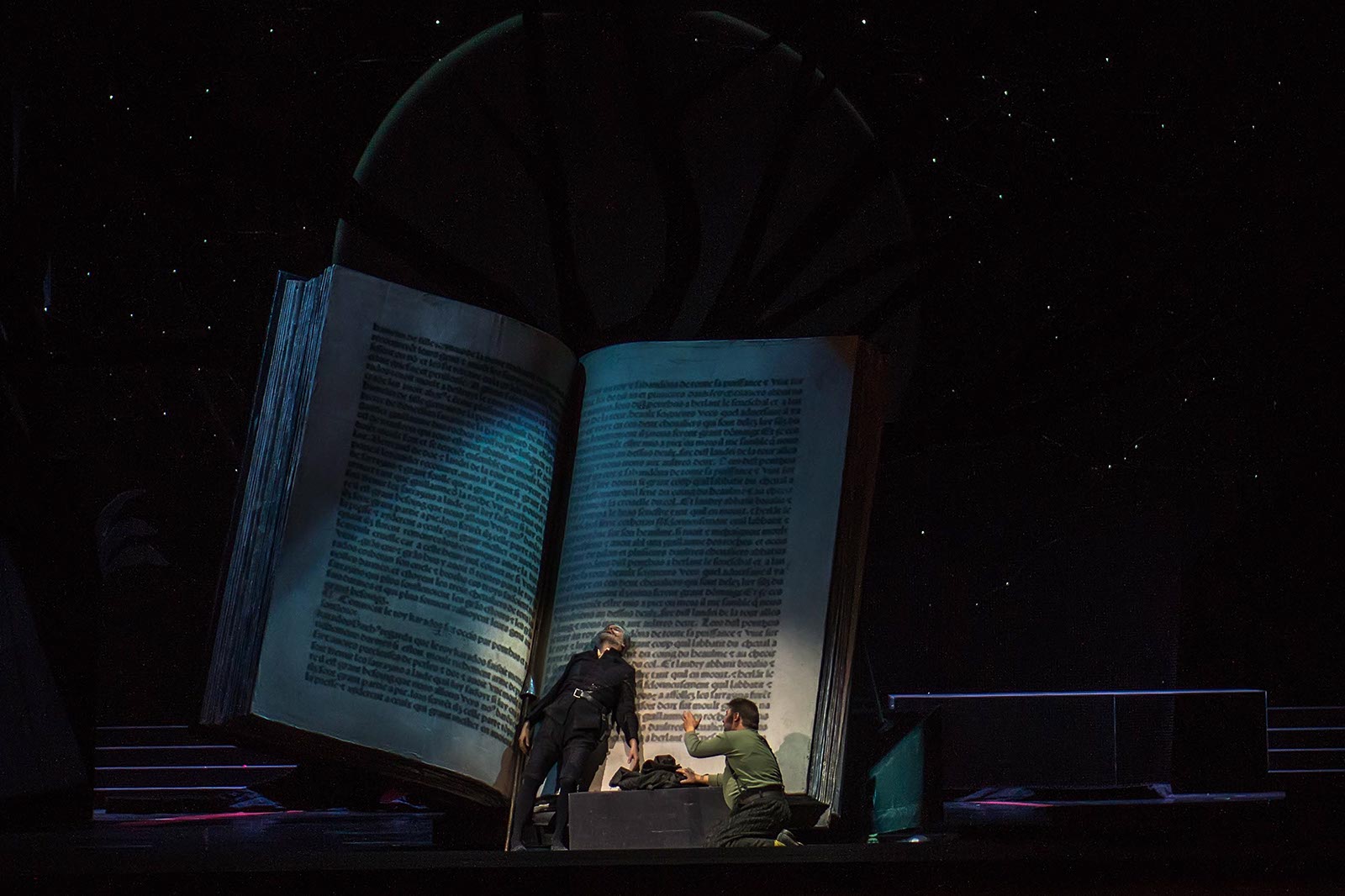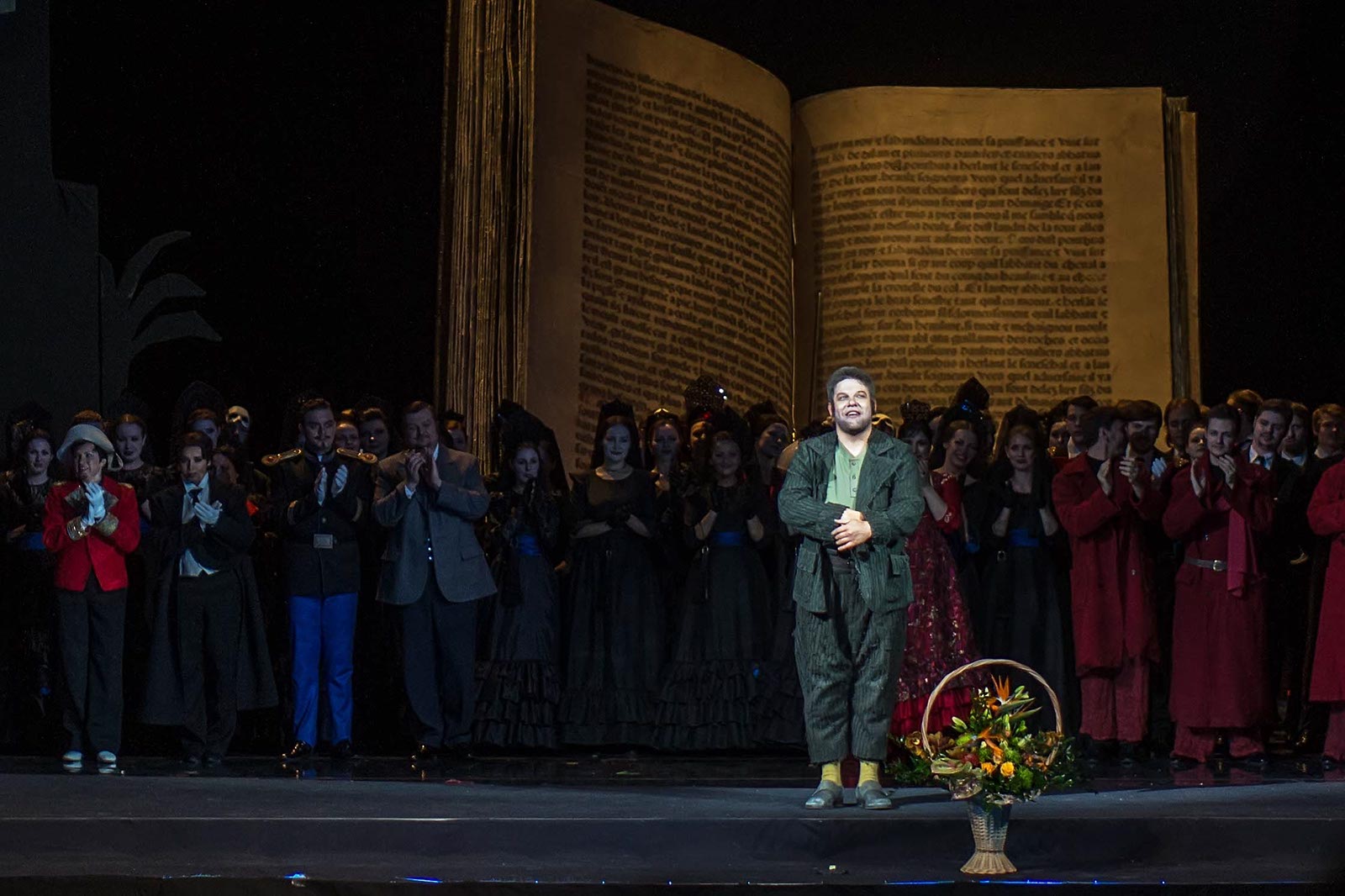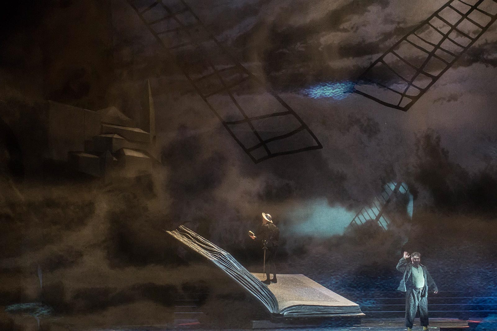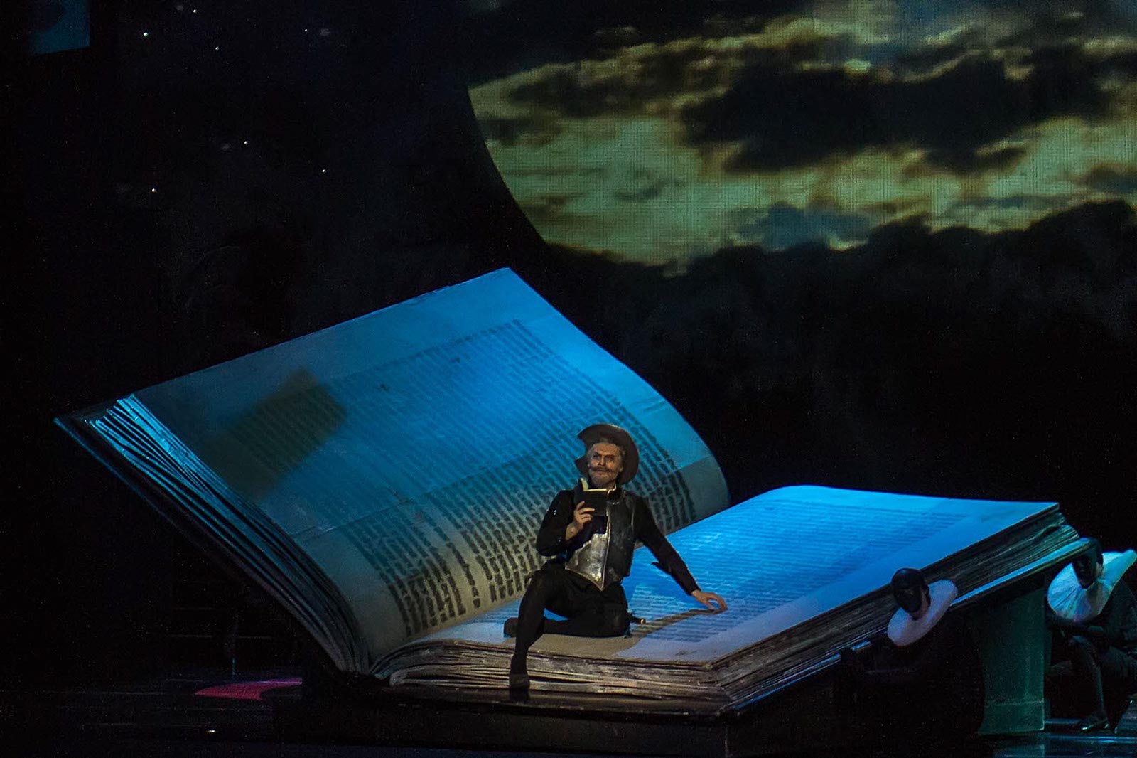 Фото №138700. Art16.ru Photo archiveКнига на сцене мне представляется, как фолиант Мигеля де Сервантеса Сааведры «Хитроумный идальго Дон Кихот Ламанчский». Правда, в основе либретто к опере лежат не события романа, а пьеса французского поэта Жака ле Лоррена «Рыцарь печального образа», прошедшей в Париже в 1904 году. А по задумке режиссера (Янниса Коккоса) является «Книгой жизни и судеб», «Основой и результатом человеческой фантазии».