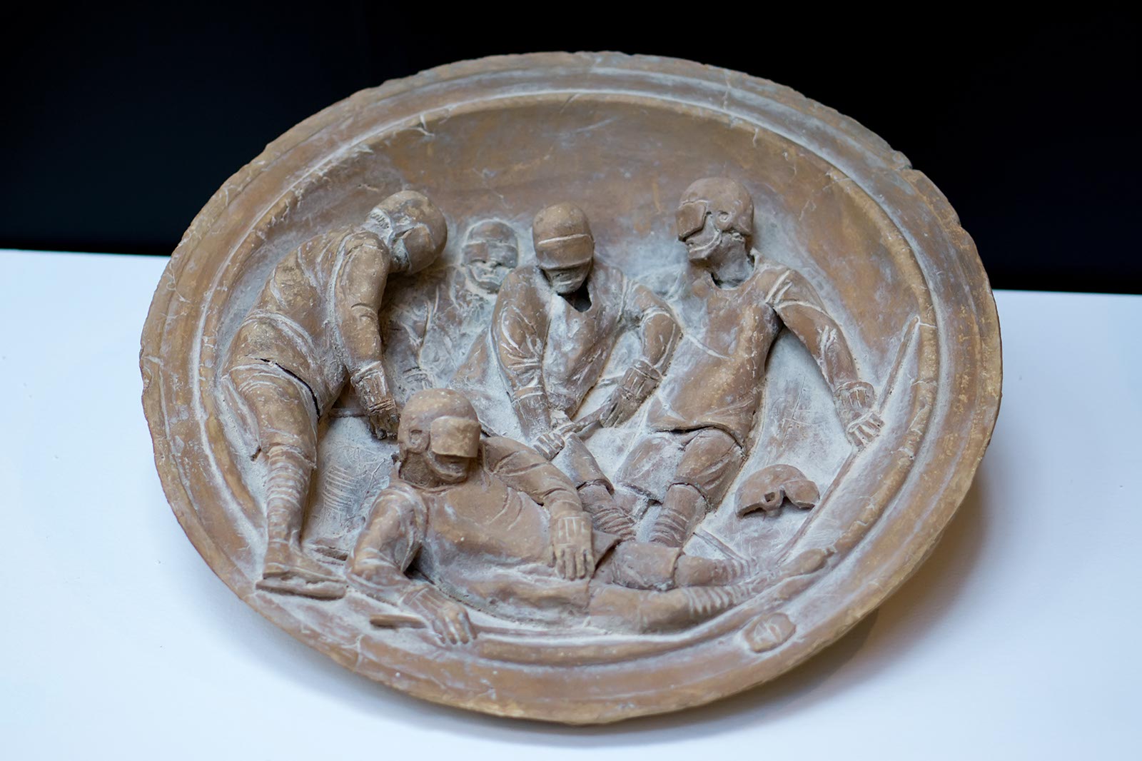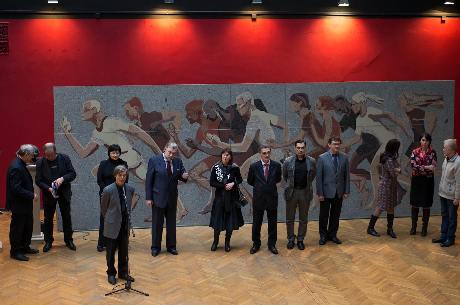 Центральное место занимает панно «Эстафета» народного художника России Сергея Витальевича Горяева, выполненное в технике флорентийской мозаики.