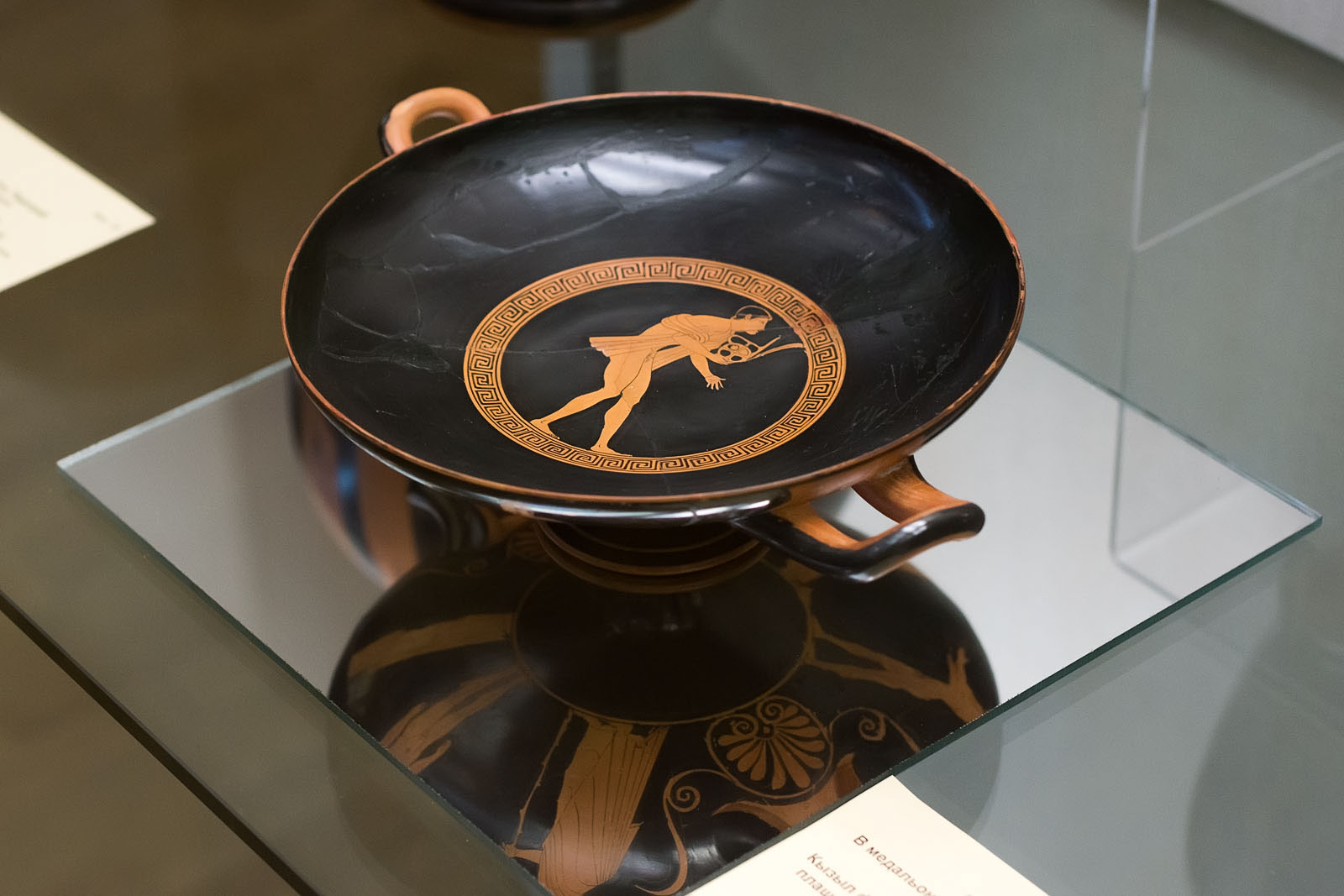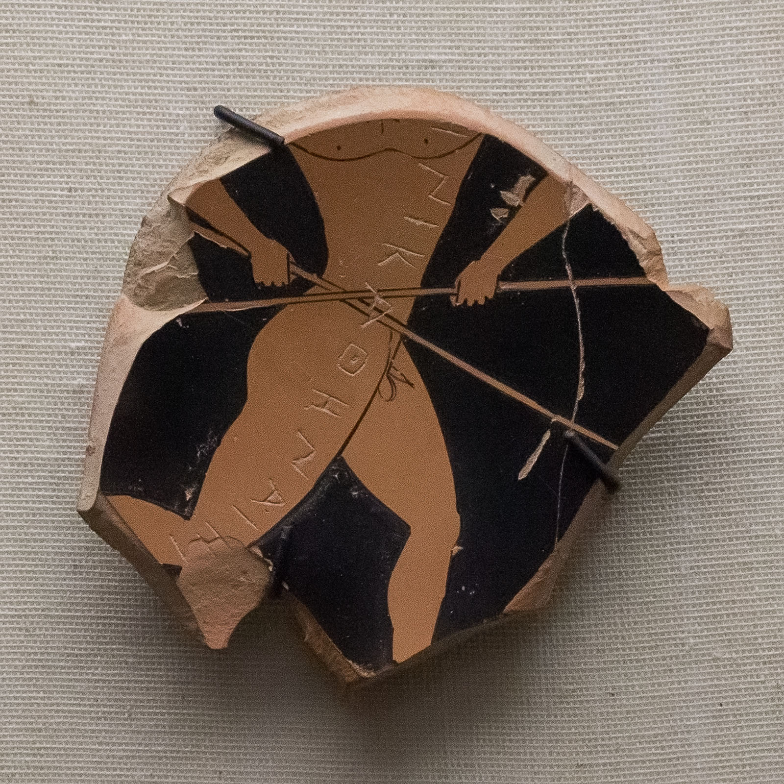 Фото №149747. Фрагмент краснофигурного килика с граффити Посвящение Зевсу и Афине нанесено поверх изображения фигуры атлета с копьями