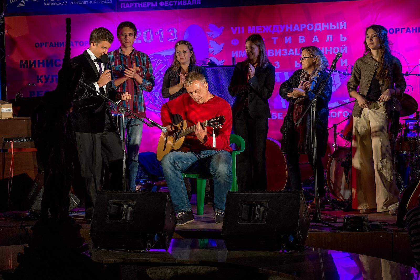 Фото №173403. Art16.ru Photo archiveВ перерыве Михаил Волконадский провел конкурсную программу с подарками от спонсоров. Занимательной показалась борьба шести зрителей за гитару, подарок от МузМаркета, партнера фестиваля. Причем, трое из желающих получить гитару, совершенно не владели инструментом. Гитара досталась сильнейшему.
