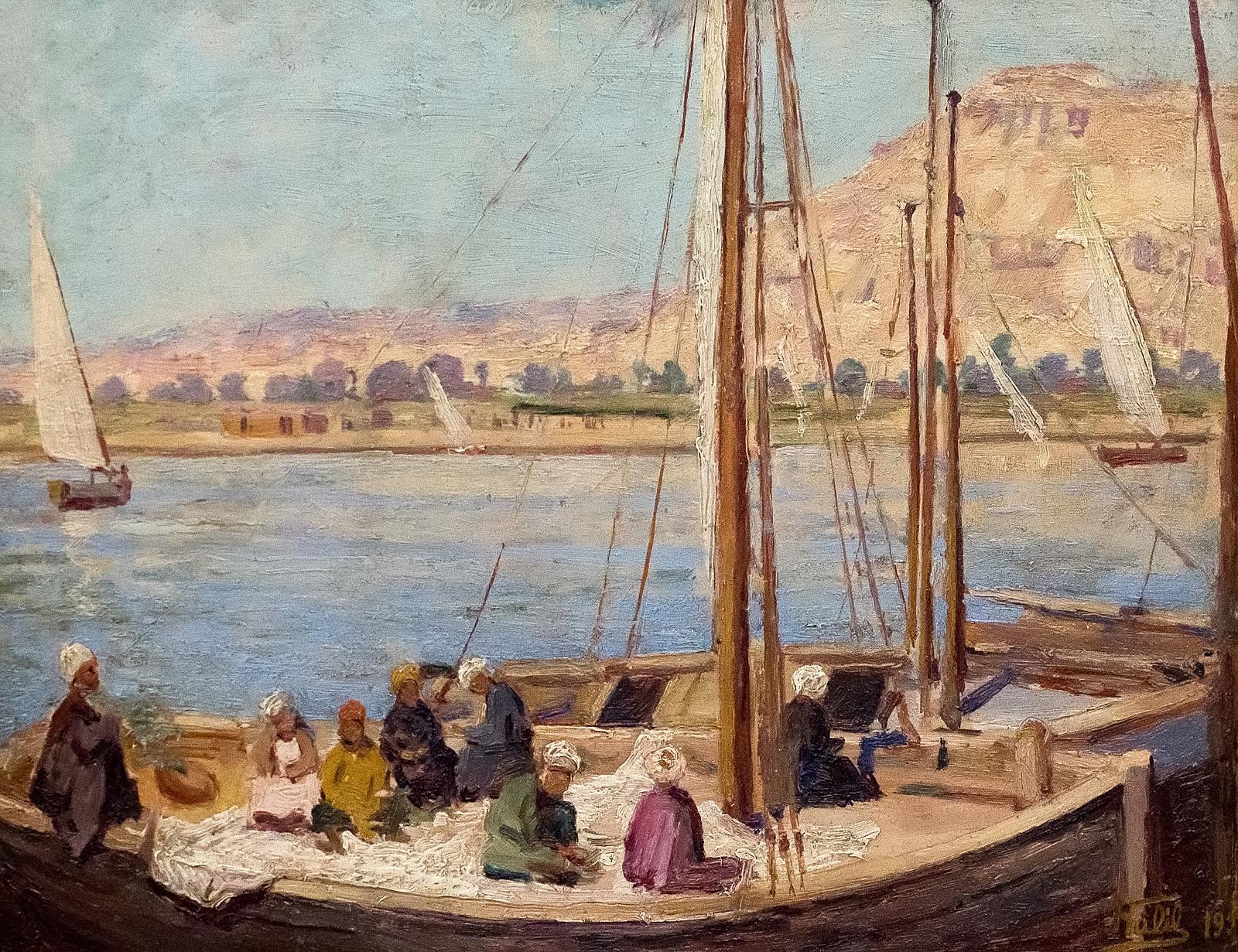 Самая ранняя работа, экспонируемая на выставке, находится в этом зале (Халил Паша (1852-1939). Парусники в Египте. Картон, масло, 1925 г.).