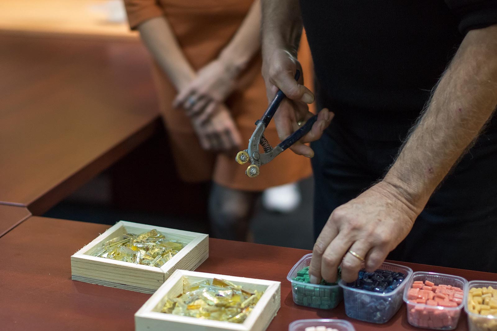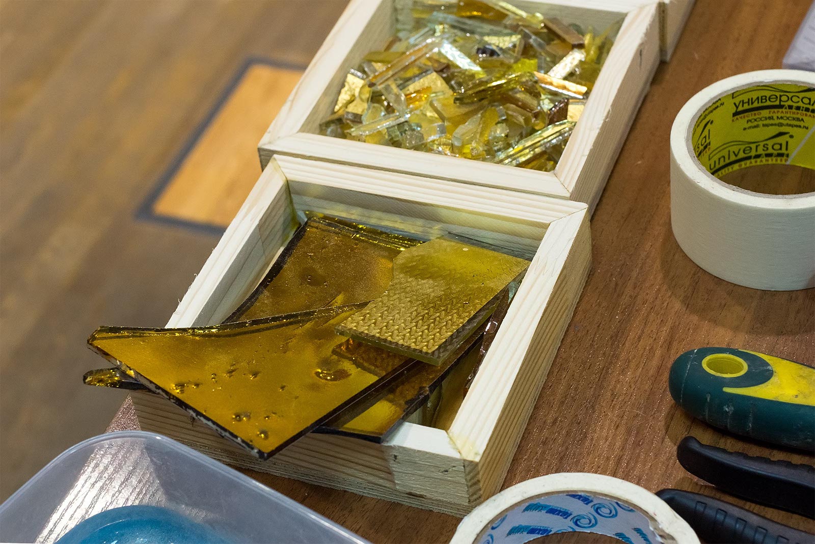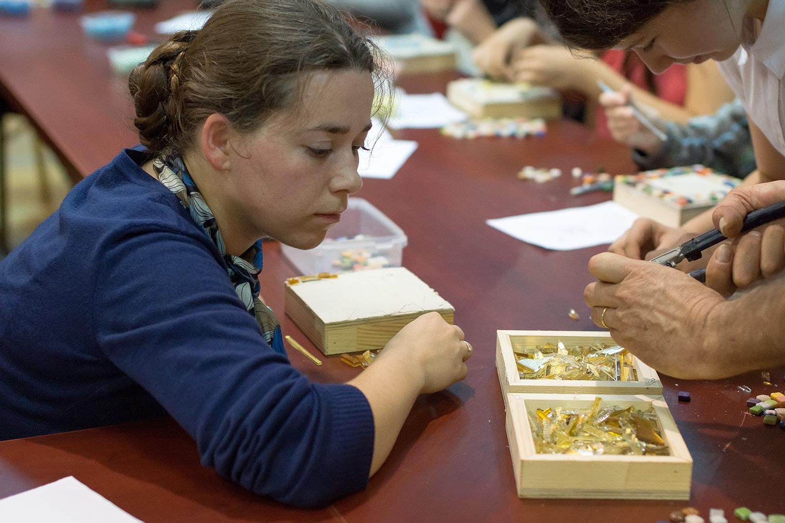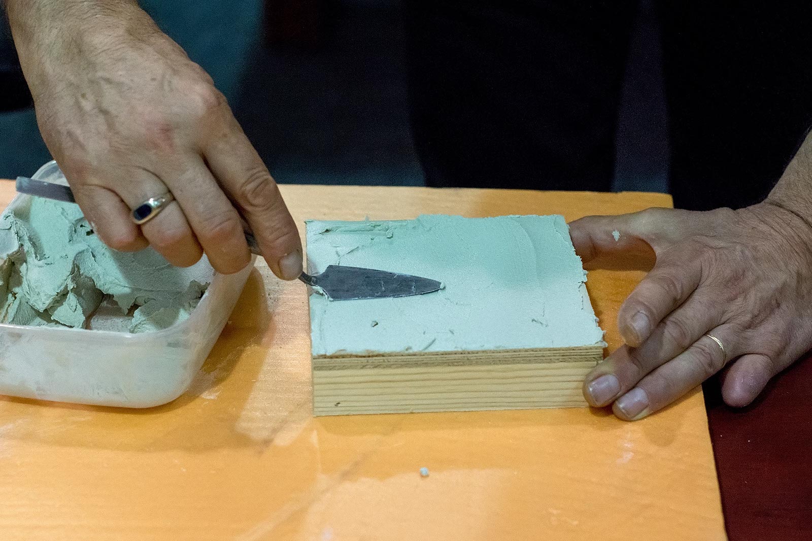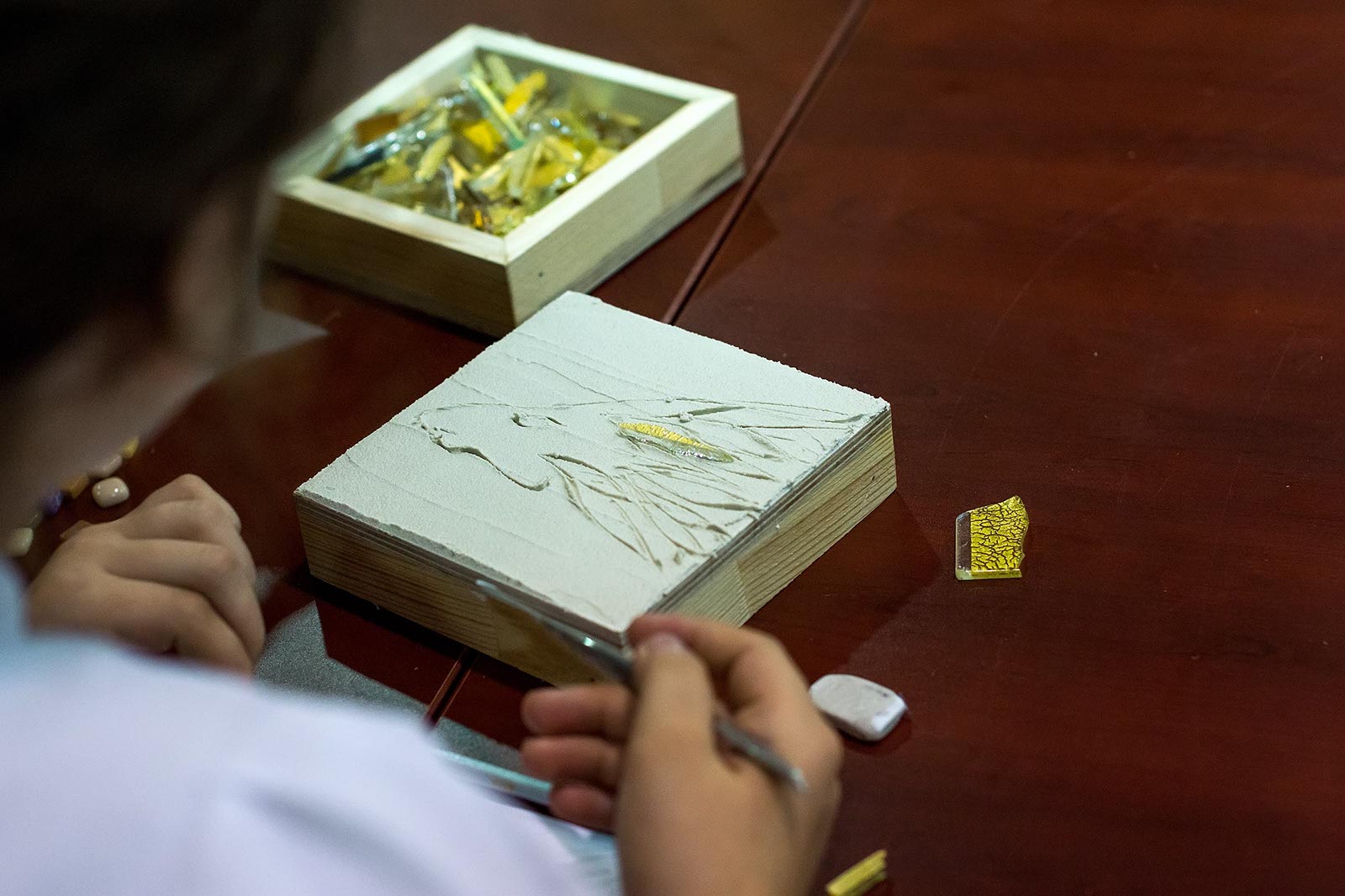 Фото №175540. Art16.ru Photo archiveПока Марко Бравура дает интервью, его помощники грунтуют поверхность деревянной коробки, наносят 5 мм. слой клея для керамики. Такие коробочки, стекла и камушки раздаются участникам мастер-класа: Зарине, Юли, Зульфату, Ландыш, Диане, Аделе, Элине.