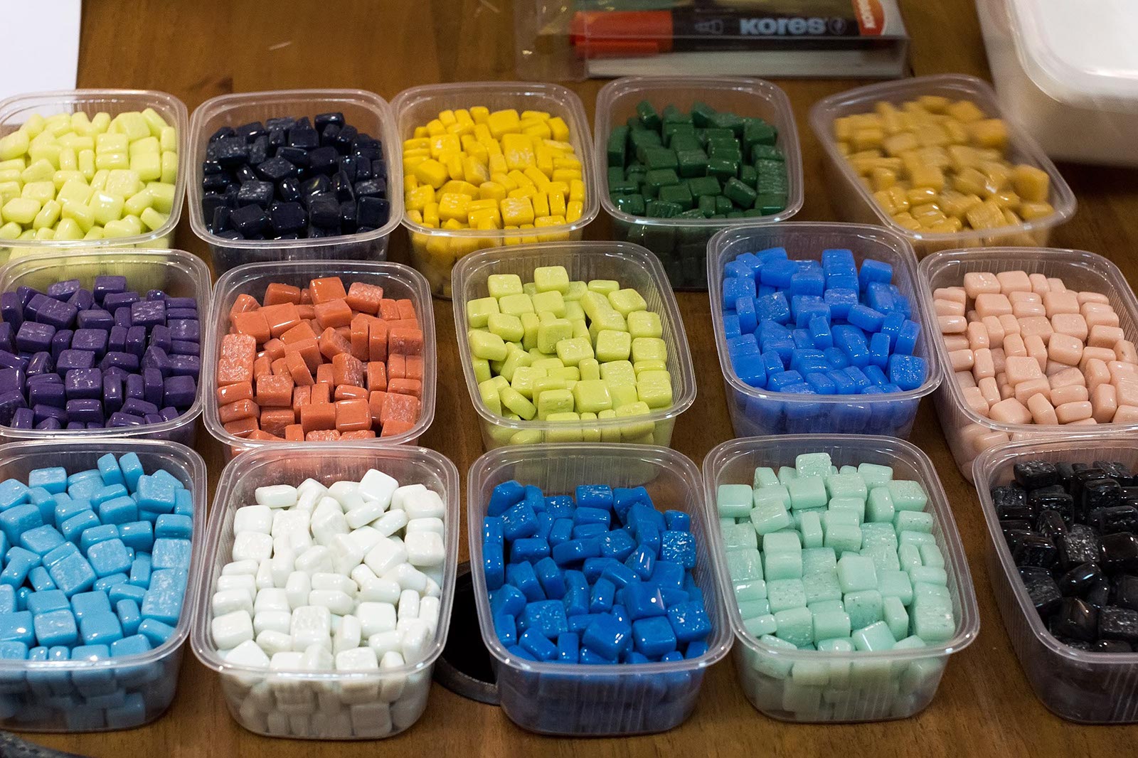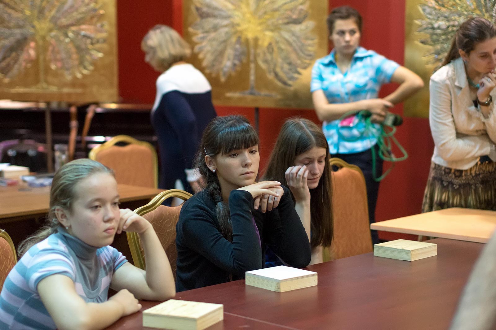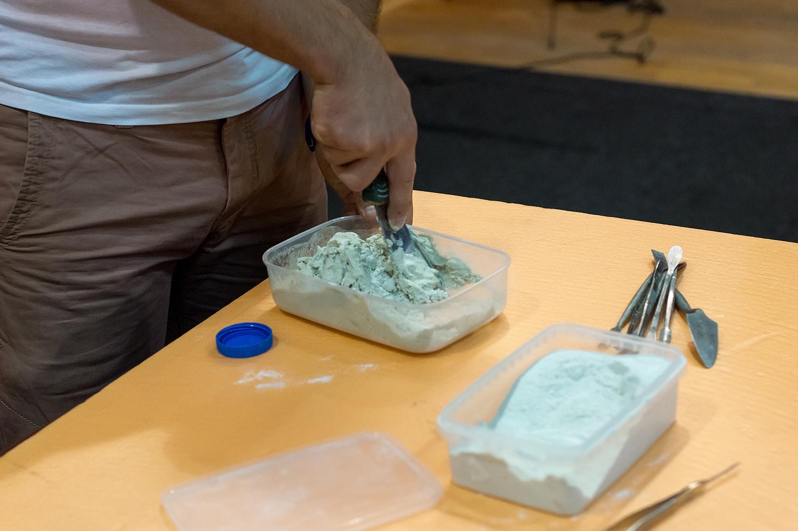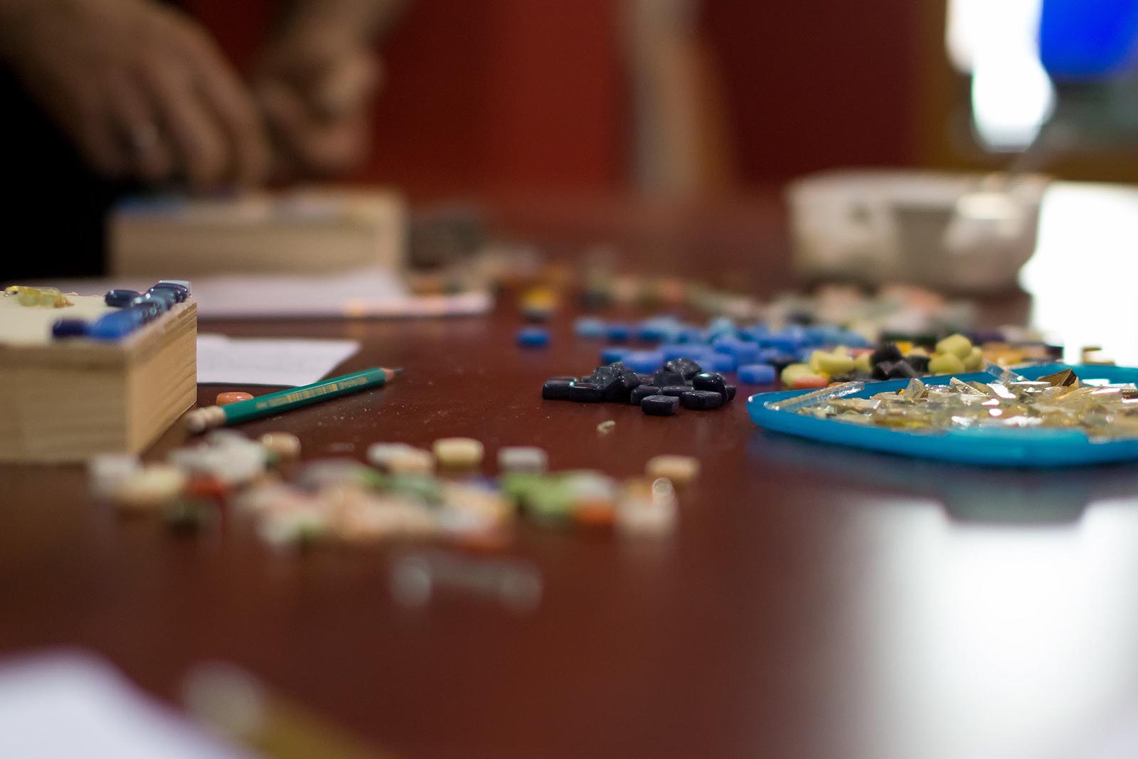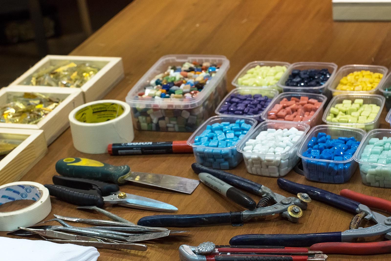 Фото №175540. Art16.ru Photo archiveПока Марко Бравура дает интервью, его помощники грунтуют поверхность деревянной коробки, наносят 5 мм. слой клея для керамики. Такие коробочки, стекла и камушки раздаются участникам мастер-класа: Зарине, Юли, Зульфату, Ландыш, Диане, Аделе, Элине.