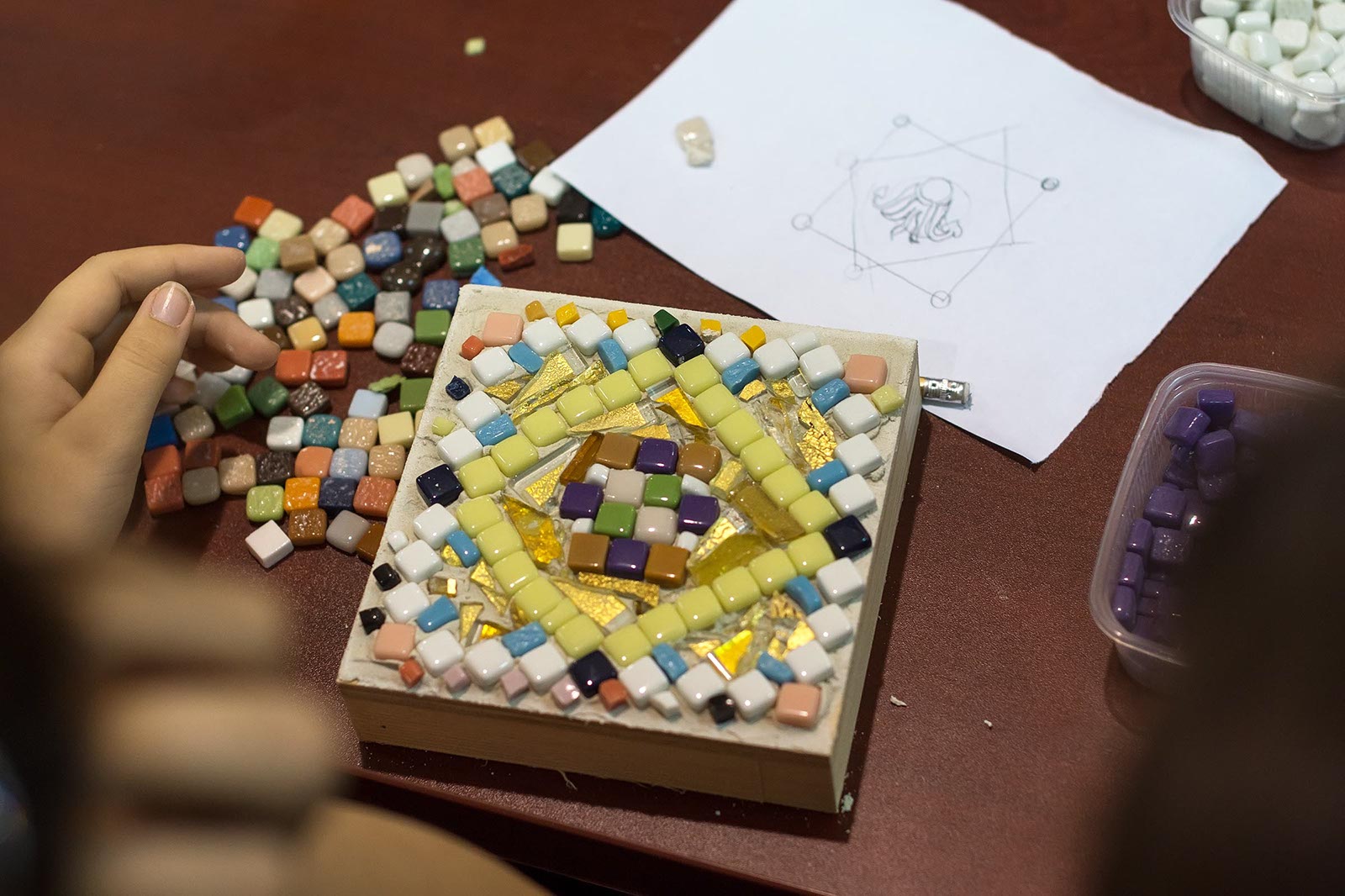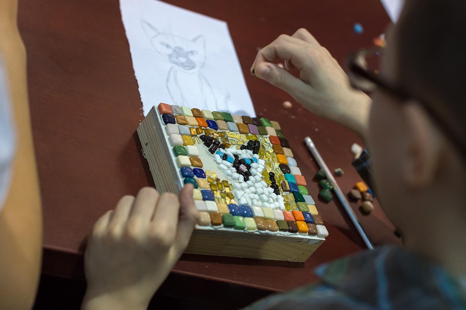 Фото №175612. Art16.ru Photo archiveДети разрабатываю эскизы будущих мозаичных панно. Нарисовали то все быстро. А вот как выложить камушки и стеклышки на клейкую поверхность и не исказить рисунок?