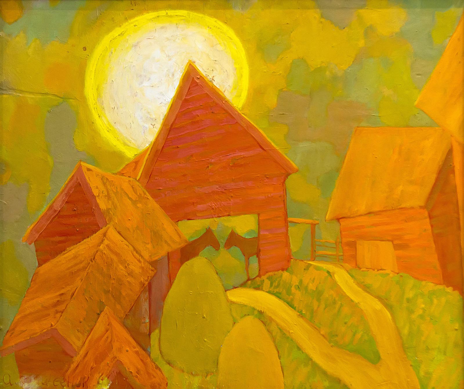 Фото №210613. Аникеенок А.А. 1925 - 1984 ИЗБЫ С КОНЮШНЕЙ. 1966 Картон, масло