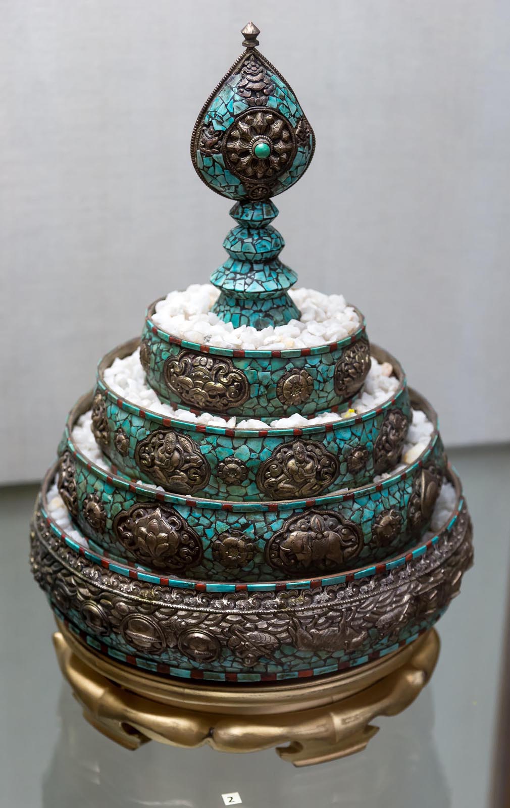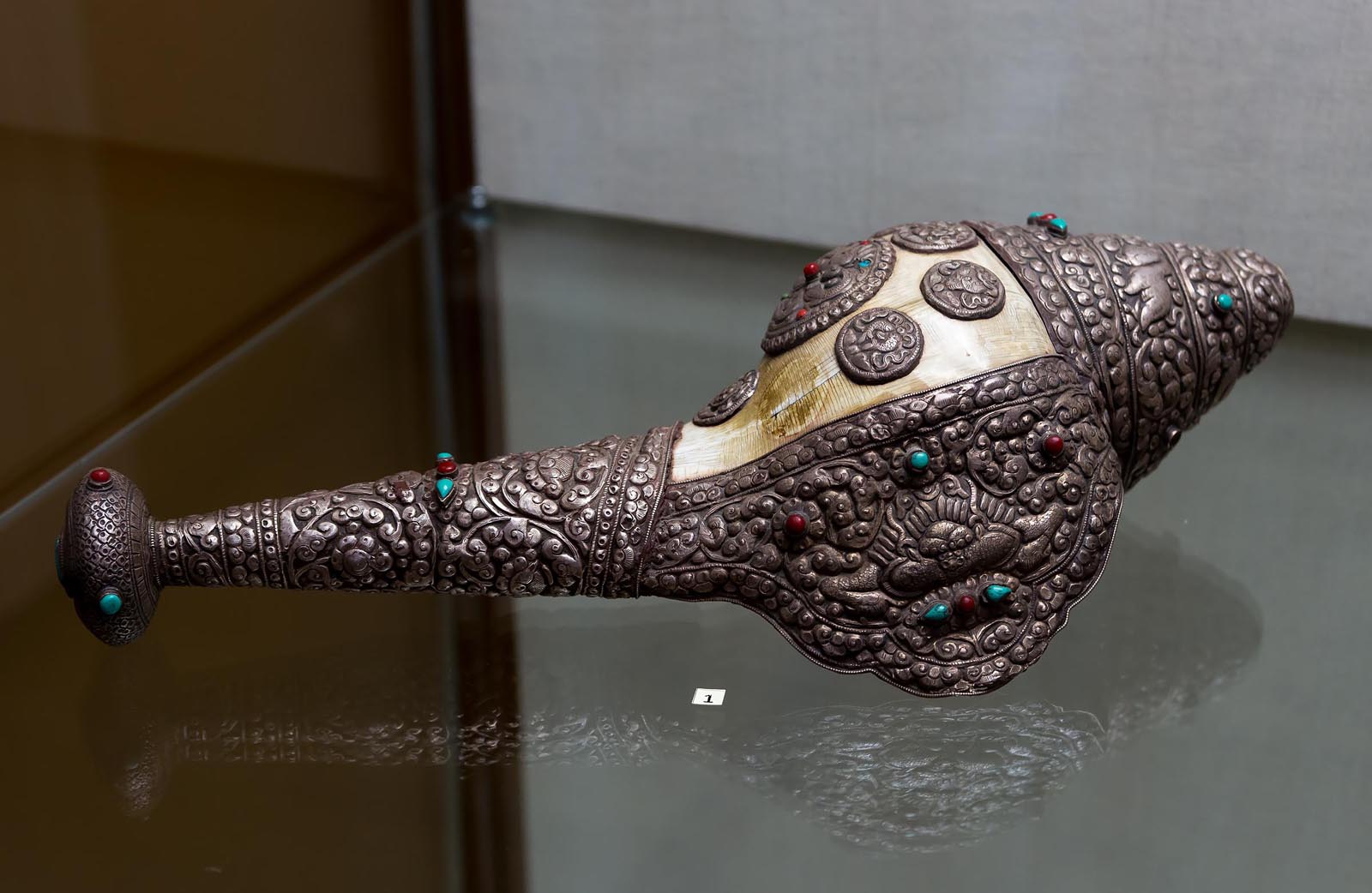 Другой интересный предмет, не понятный для европейцев — ритуальная раковина «шанкха». Это раковина крупного морского моллюска, обитающего в Индийском океане. Священная раковина украшена тибетским серебром (сплав меди, серебра и других металлов), инкрустирована бирюзой. В тибетском буддизме её шанкху называют дунг. Шанкха входит в список восьми благоприятных символов буддизма, аштамангала. В индуизме шанкха является одним из атрибутов Вишну. В шанкху трубят в ходе индуистских храмовых ритуалов, а в прошлом её также использовали на поле боя для созыва войска, оповещения об атаке или начале битвы.