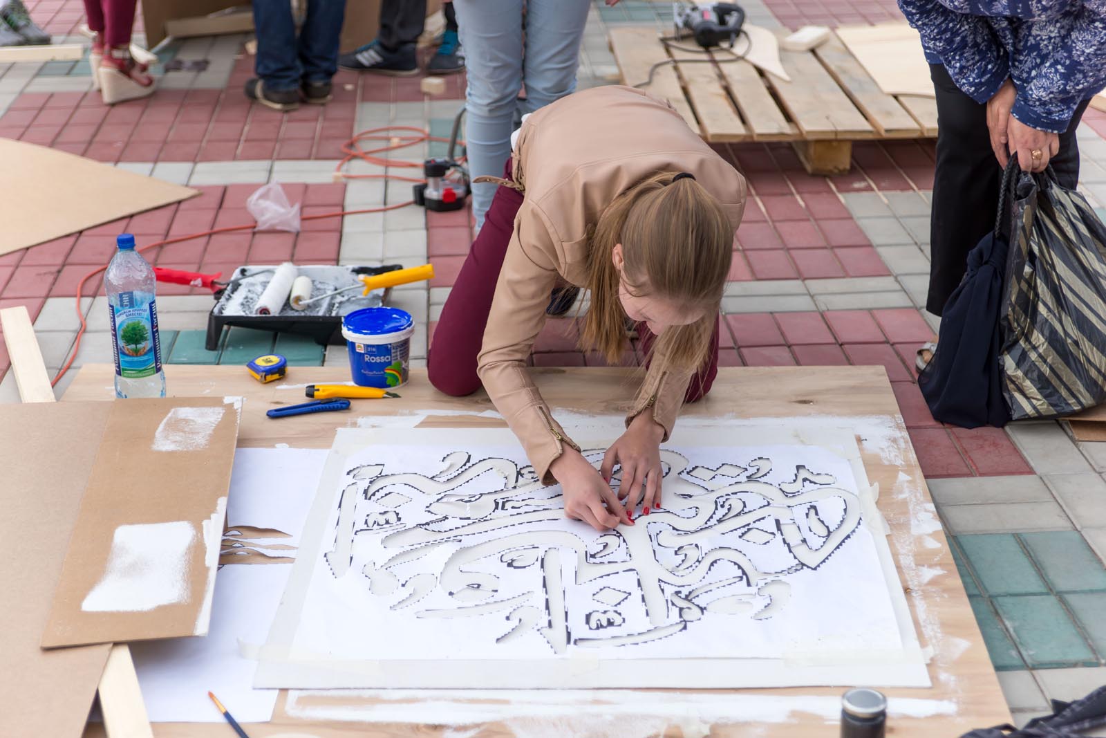 Фото №305228. Art16.ru Photo archiveХеппенинг от центра «Эрмитаж-Казань». На брусчатке выложена фраза «Премия Джамиля 3» из старых газет и журнальных страниц.