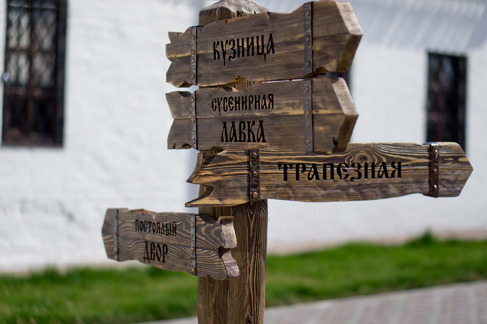 Фото №104352. Указатель на конном дворе: " Постоялый двор, трапезная, сувенирная лавка, кузница"Свияжск, июль 2012