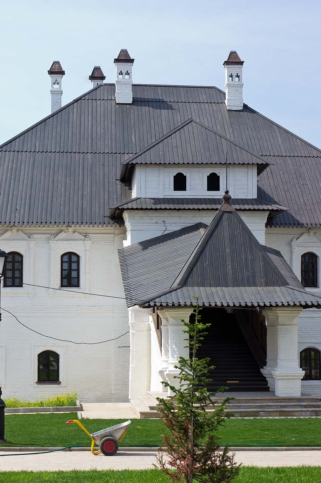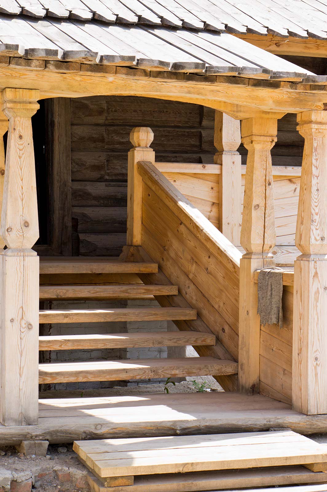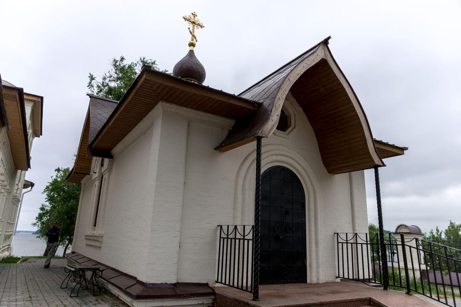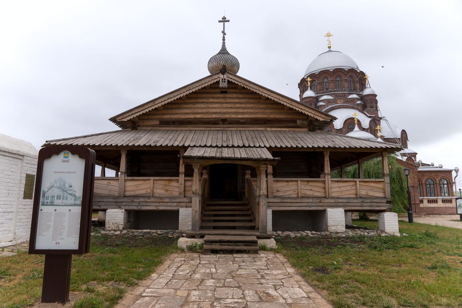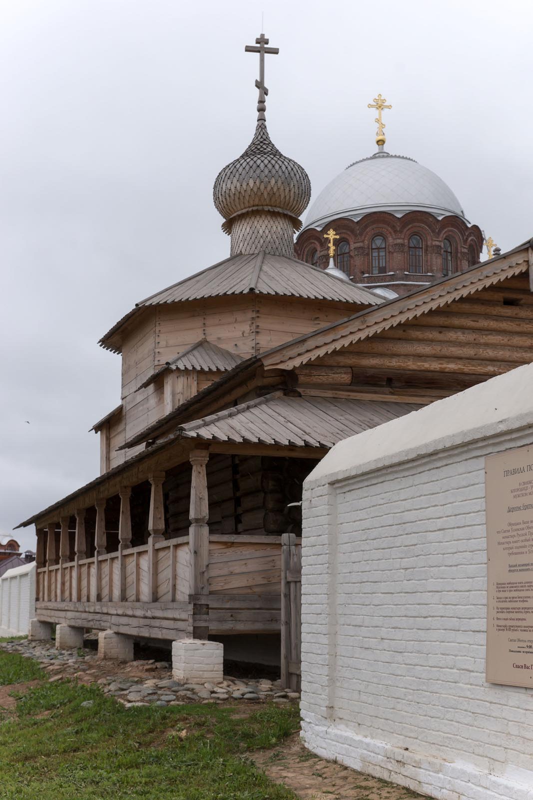 Фото №104448. Крыльцо перед деревянной церковью. Свияжск, июль 2012. Иоанно-Предтеченское подворье Свияжского Успенского монастыряХрам срублен зимой 1550 г. под Угличем. Двухярусный храм в виде креста. Внесены изменения в о второй полю XVII в. Достраивалась неоднократно в XIX в.