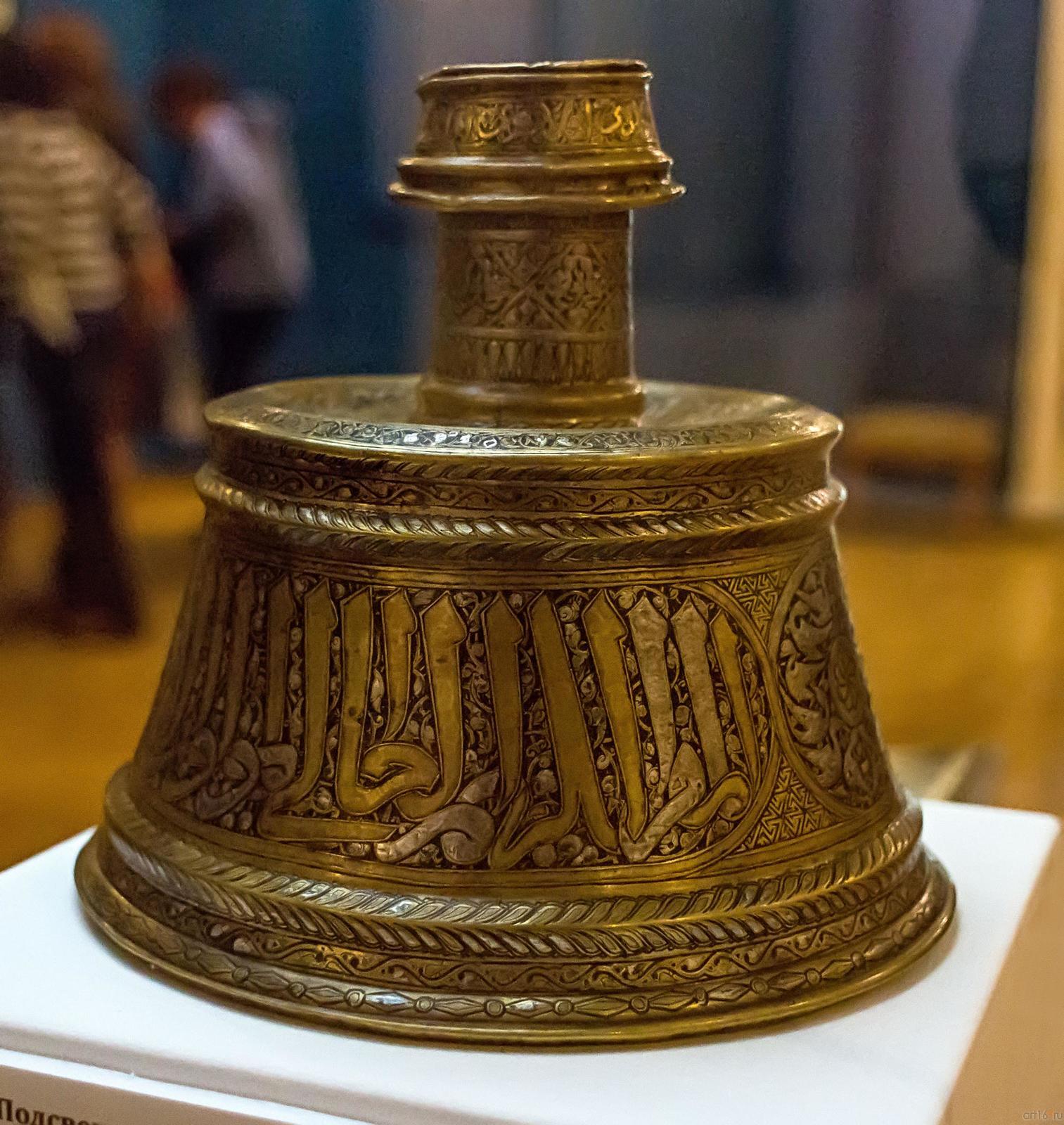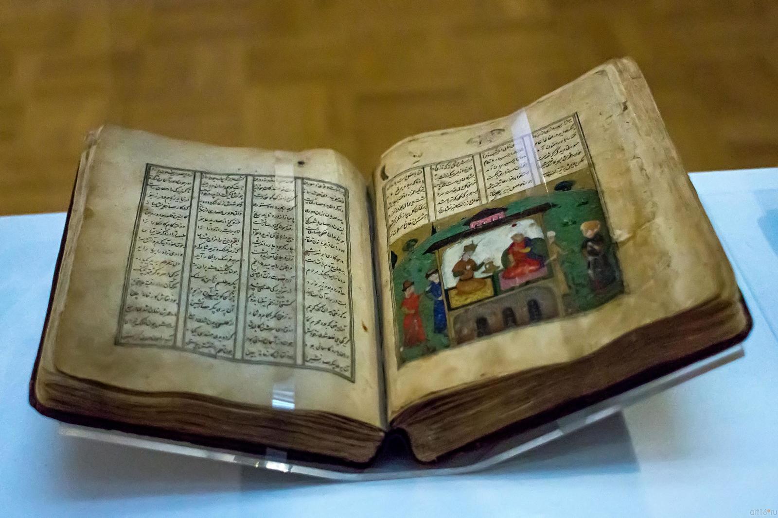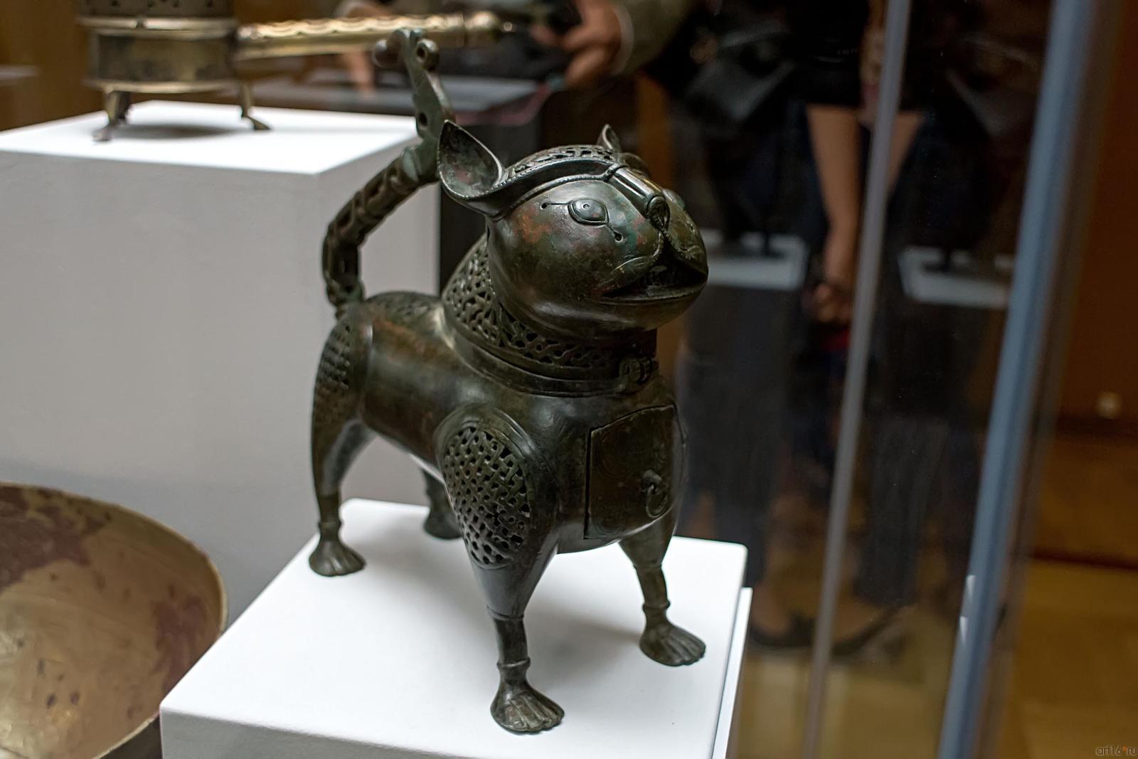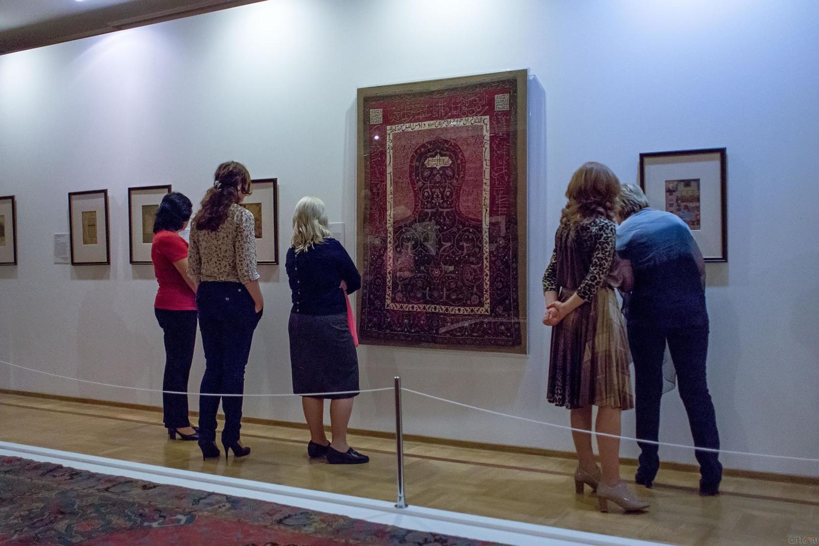 Фото №482123. Art16.ru Photo archiveВ экспозиции представлено 99 шедевров мирового искусства из Северной Африки, Сирии, Ирака, Ирана, Средней и Малой Азии. Среди них: поясной набор, состоящий из 27 предметов, выполненный в Китае в конце ХIV-нач. XVвв.; бокка (головной убор замужней монгольской женщины) из златотканого шелка на каркасе из бересты, изготовленный в конце XIII—XIV вв.; двухслойное и резное стекло; роспись по металлу; керамические чаши с изображением людей и животных; бронзовые курильницы; листы Коранов; рукописи и манускрипты, украшенные изысканными миниатюрами; иранский молитвенный ковер середины XVI в., на котором вытканы девяносто девять имен Всевышнего и др.