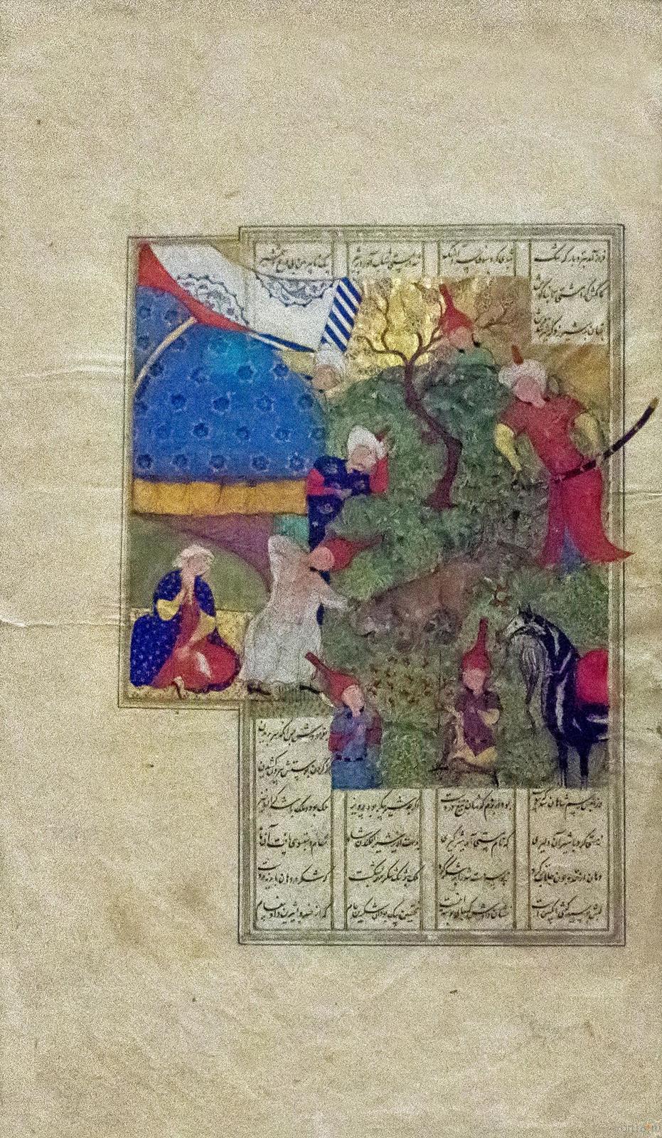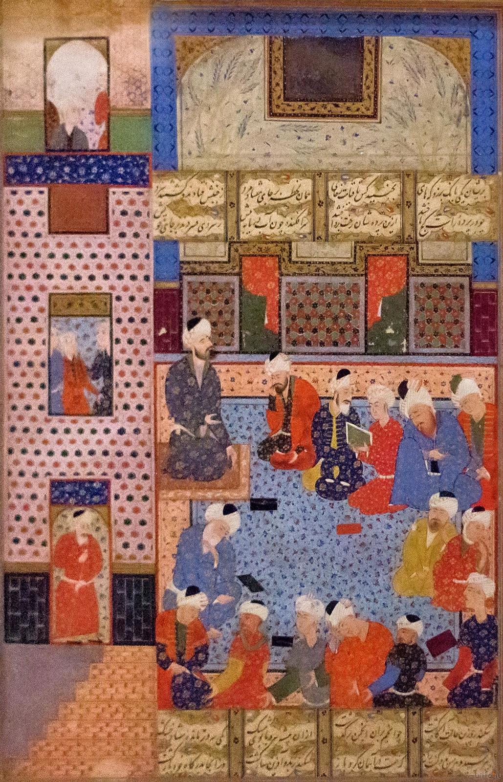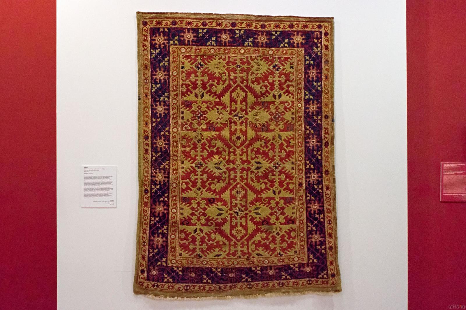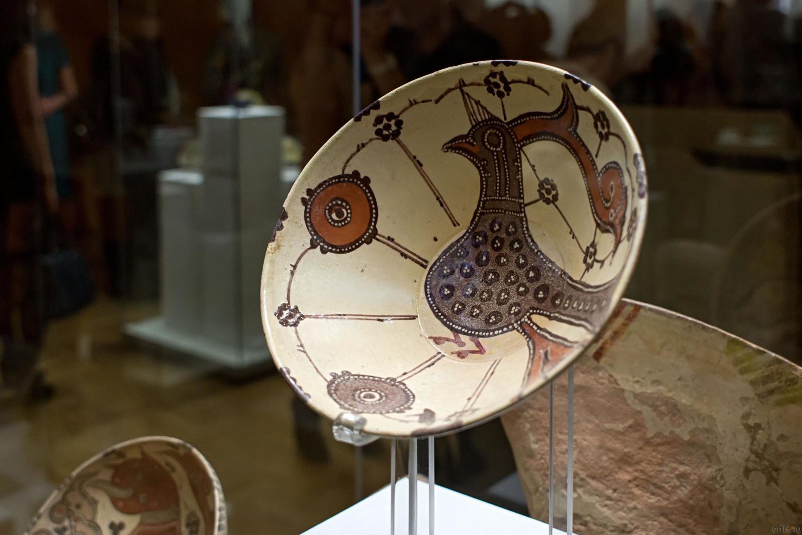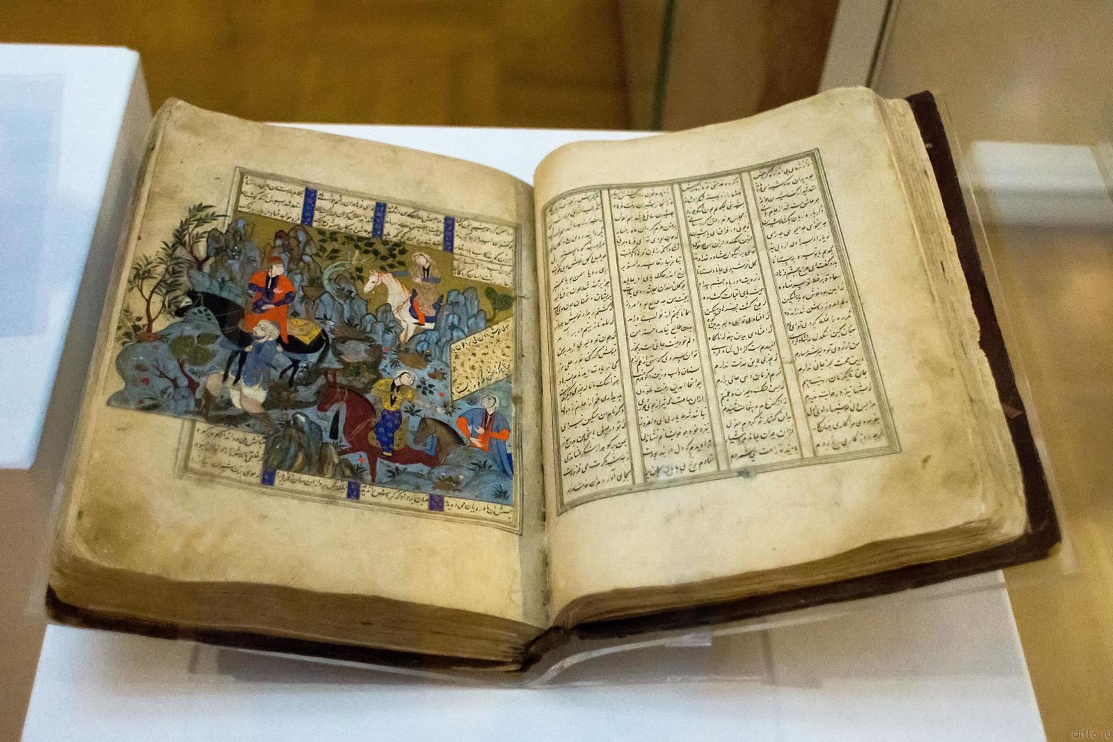 Фото №482123. Art16.ru Photo archiveВ экспозиции представлено 99 шедевров мирового искусства из Северной Африки, Сирии, Ирака, Ирана, Средней и Малой Азии. Среди них: поясной набор, состоящий из 27 предметов, выполненный в Китае в конце ХIV-нач. XVвв.; бокка (головной убор замужней монгольской женщины) из златотканого шелка на каркасе из бересты, изготовленный в конце XIII—XIV вв.; двухслойное и резное стекло; роспись по металлу; керамические чаши с изображением людей и животных; бронзовые курильницы; листы Коранов; рукописи и манускрипты, украшенные изысканными миниатюрами; иранский молитвенный ковер середины XVI в., на котором вытканы девяносто девять имен Всевышнего и др.