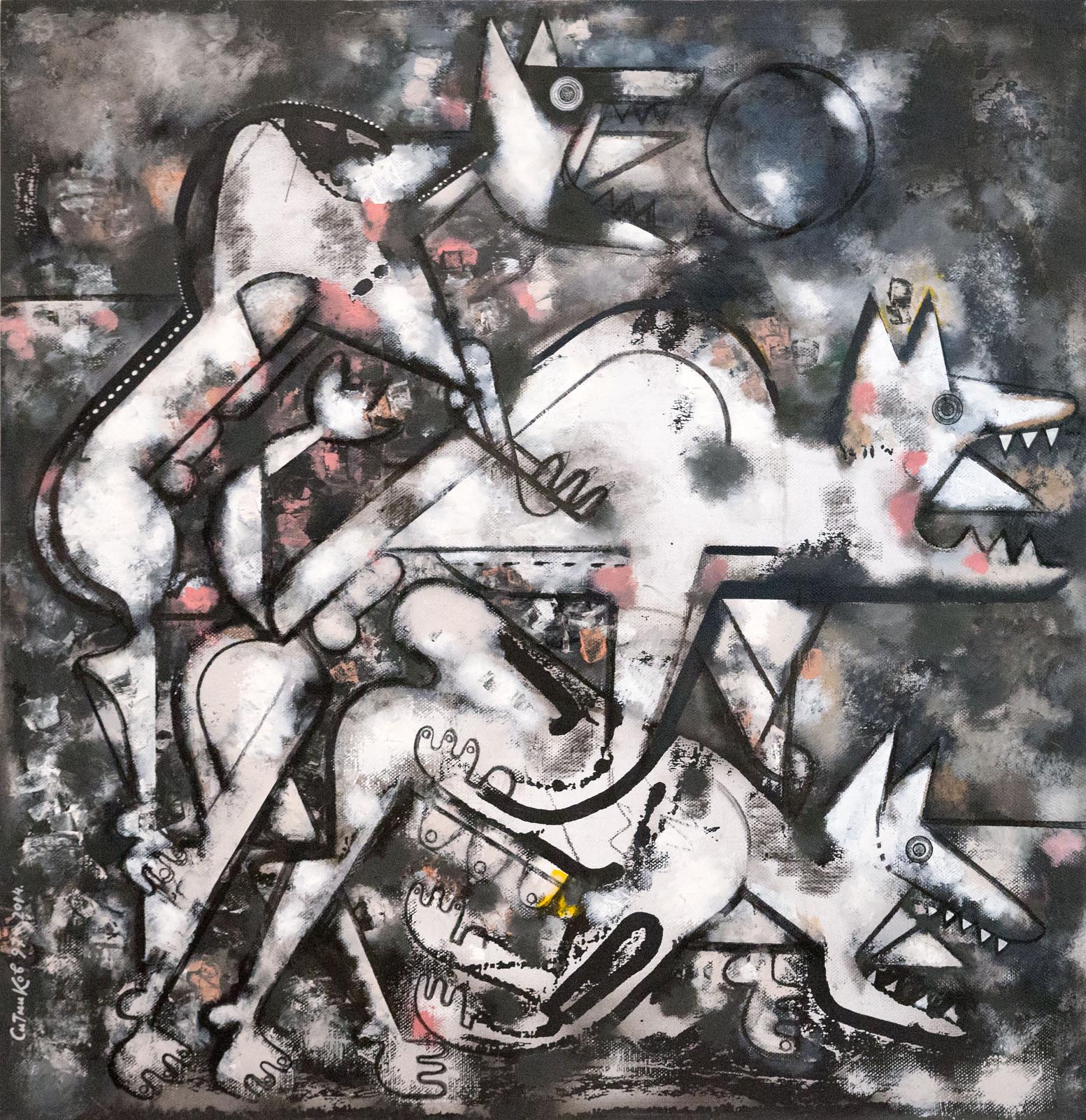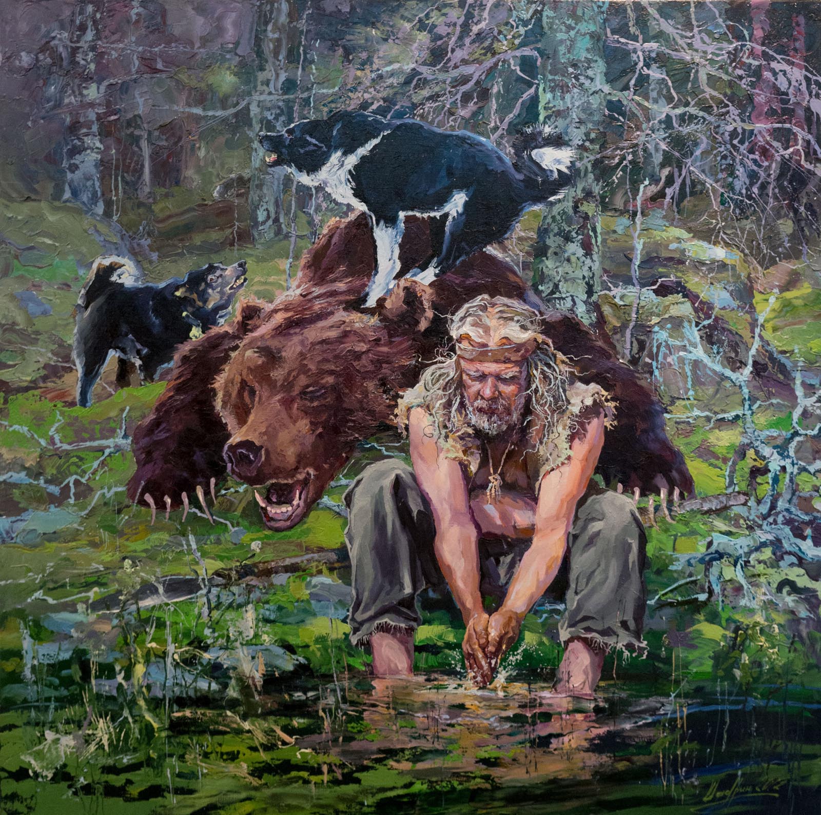 Или стремительно несущаяся сквозь метель «Охота с загоном» Ирика Мусина, где люди-охотники преследуют убегающих волков - прирождённых лесных охотников, выступающих в этой темпераментно написанной картине в роли жертвы. Чёткое распределение жестоких охотников и безвинно гибнущих жертв наглядно и убедительно показаны в символико-аллегорическом полотне И.М.Са-макаева «Безумие» - центральной части его триптиха «Ад нашего времени». А вот впечатляющая мощь и бешеная экспрессия, словно сорвавшейся с цепи боевой собаки, ринувшейся на предполагаемую жертву, но лишённой её в пределах композиции холста, вынужденно превращается из потенциального охотника в «просто в животное»» а спало быть, переходит в другую номинацию (картина Ольги Тобрелутс «Красная собака»).