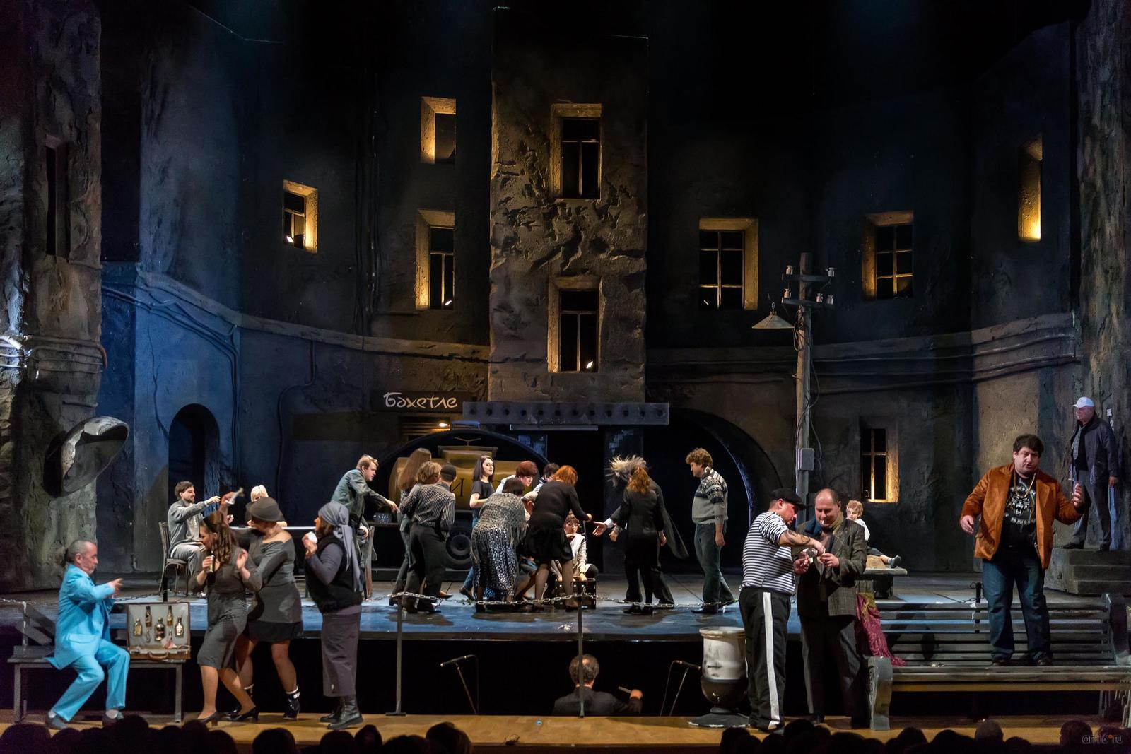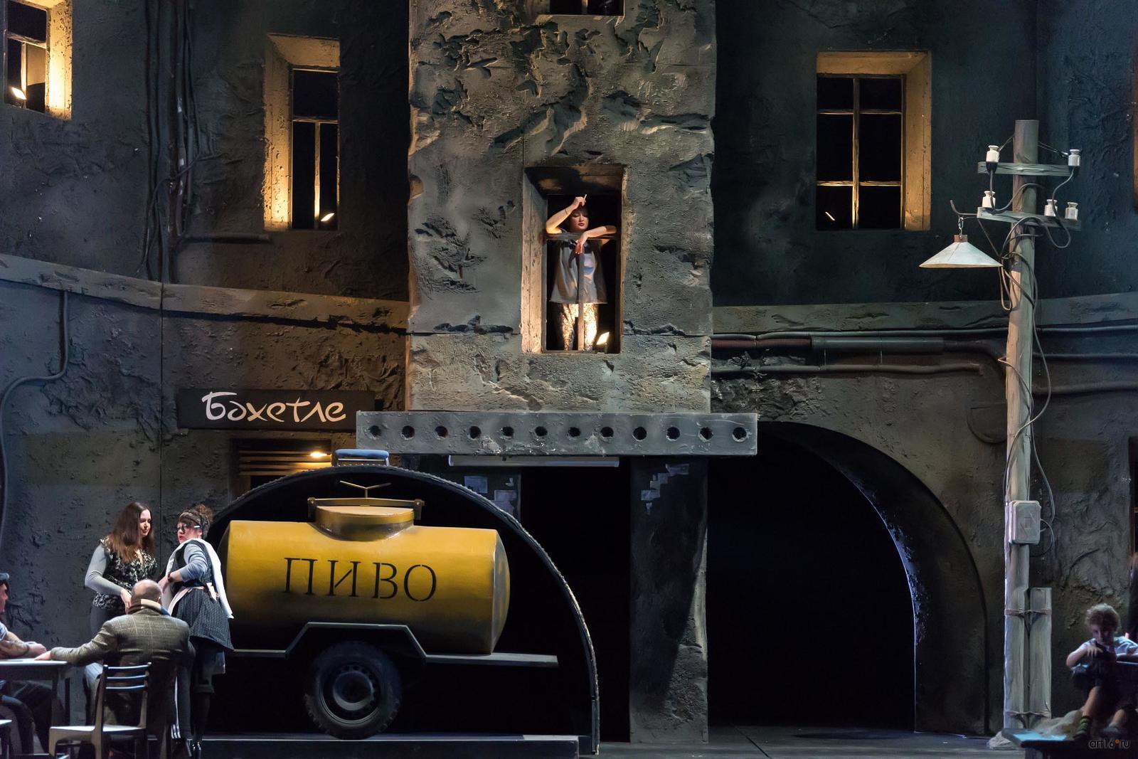Фото №782111. Art16.ru Photo archiveВо второй картине декорации меняются, на сцене симпатичный старый дом с двором в серо-синих тонах, песочницей, магазином с узнаваемой вывеской. Декорации отдалённо напоминают знаменитый мультфильм Ю.Норштейна «Сказка сказок» по стилистике, костюмам, персонажам. Всё очень близко и хорошо узнаваемо, никакой другой фантастической реальности с её воздушными замками и инопланетными кораблями.