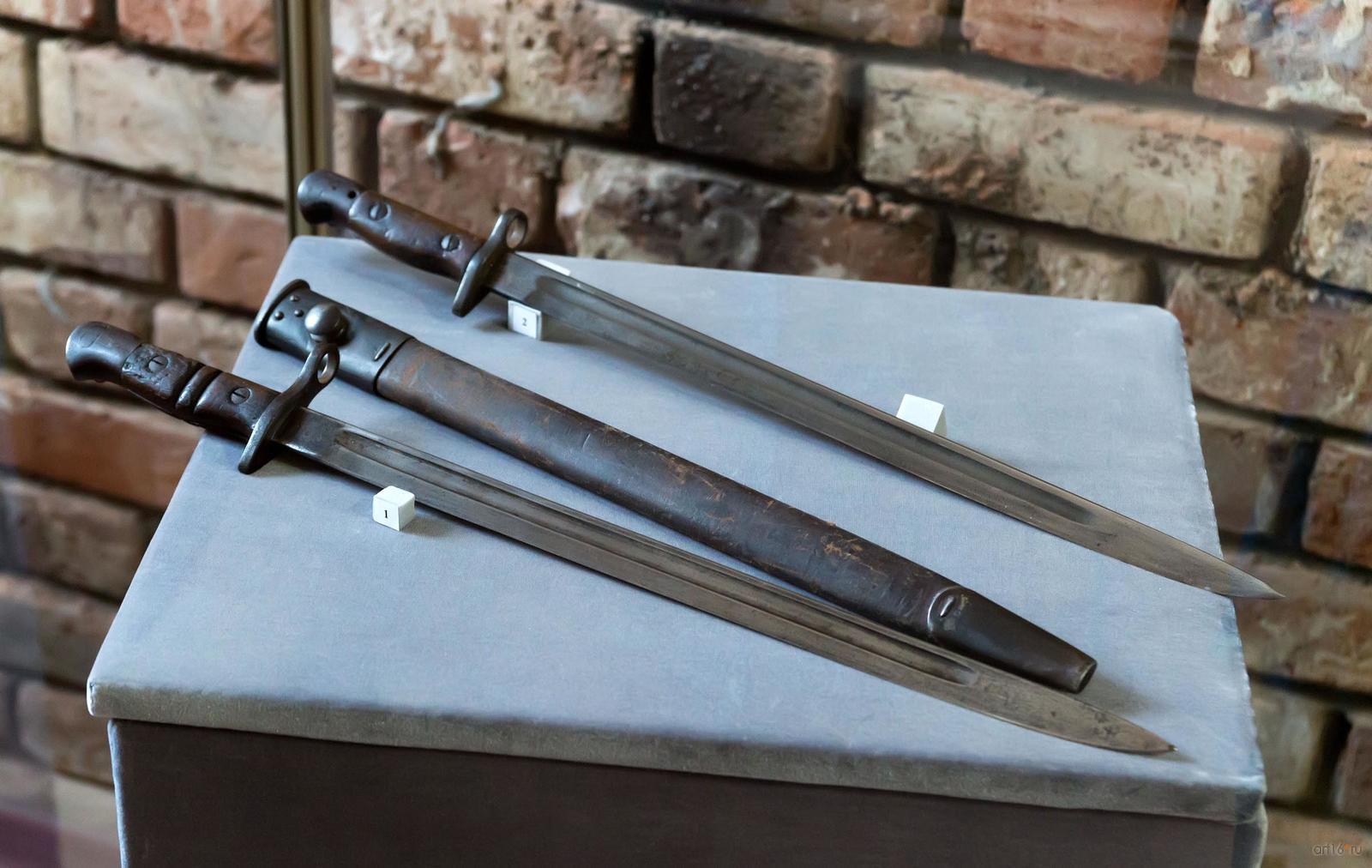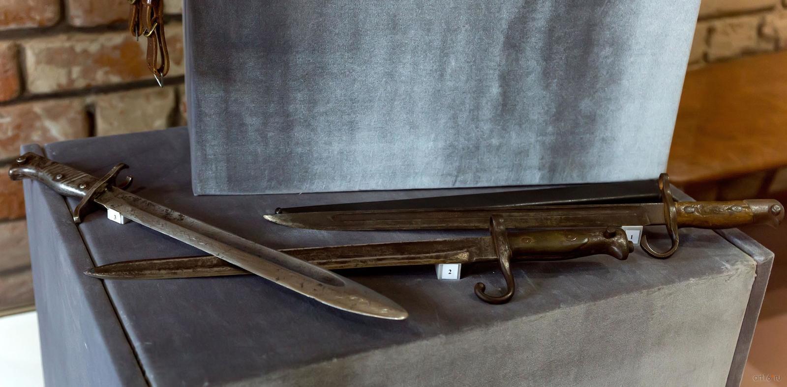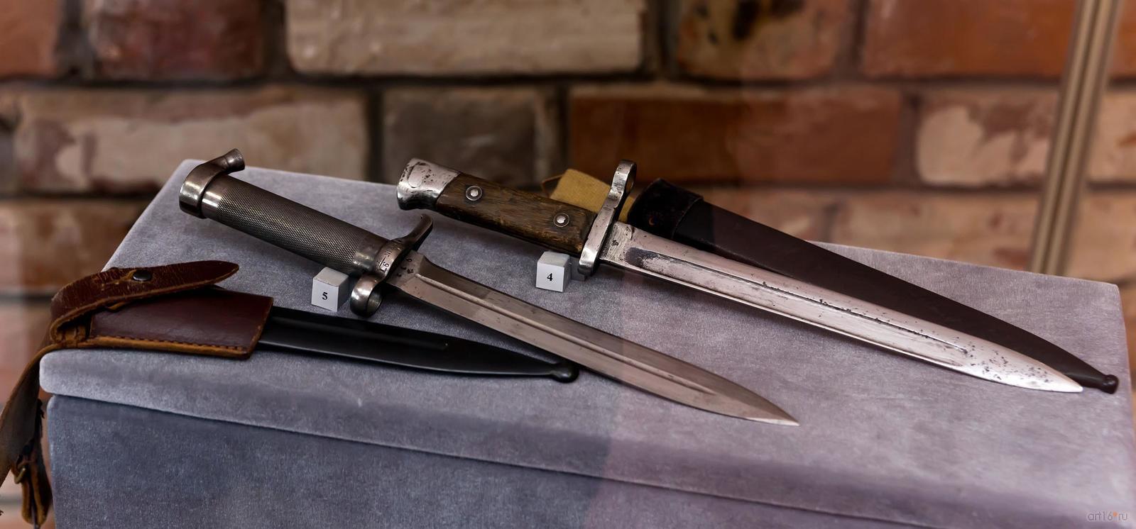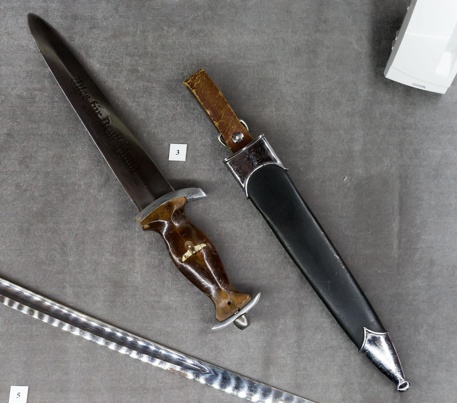 Фото №794751. Art16.ru Photo archiveДля штурмовиков, десантников разработан облегченный вариант штык-ножа. В другой витрине интерес представляет экземпляр под № 3, обоюдоострый кинжал под штурмовых отрядов СА.