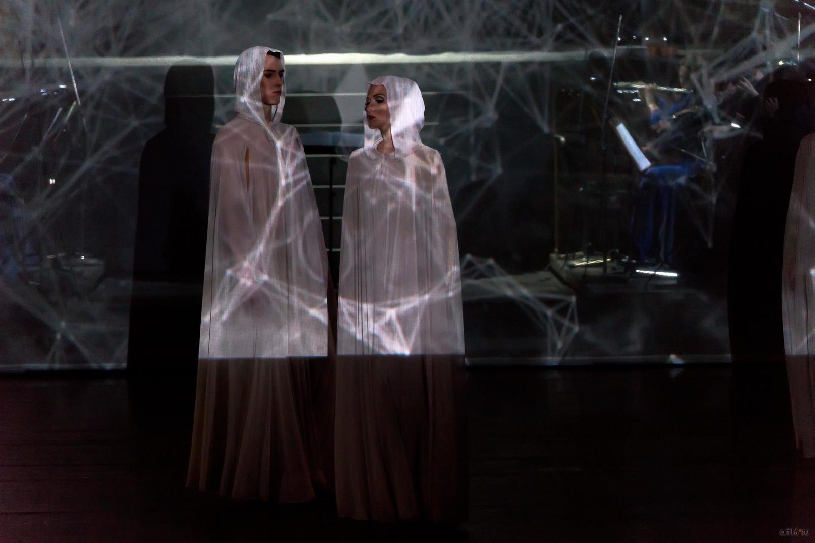 Фото №807744. Art16.ru Photo archiveСценография решена очень изящно, просто, минималистично, в тоже время, достаточно выразительно, в традиционной манере. На сцене создана модель вселенной, микрокосм, краски сдержанные, не раздражающие, превалируют цвета космоса, синий во всех его оттенках, белый, серый и чёрный.