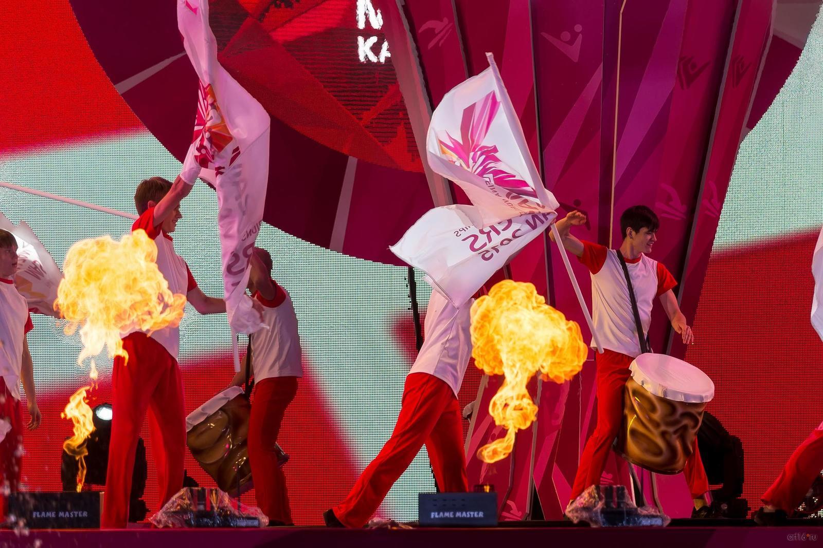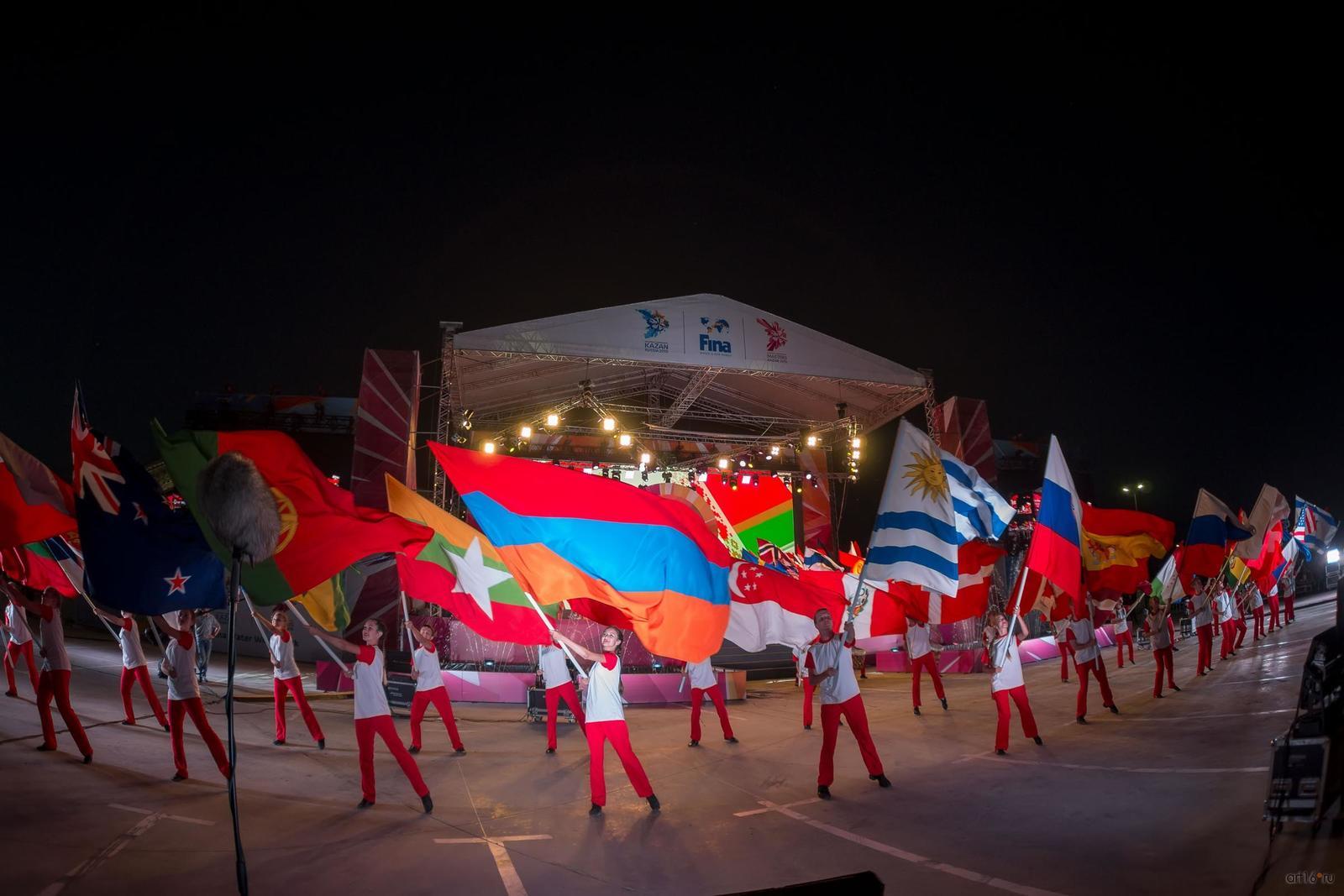 Фото №843591. Art16.ru Photo archiveЗатем началось шествие флагов стран-участниц этого спортивного события: довольно таки красочная и массовая сцена. Надо отметить, что лазерное и пиротехническое шоу, вкупе с двумя работающими фонтанами, гармонично наполнило церемонию непревзойденным ароматом торжества.