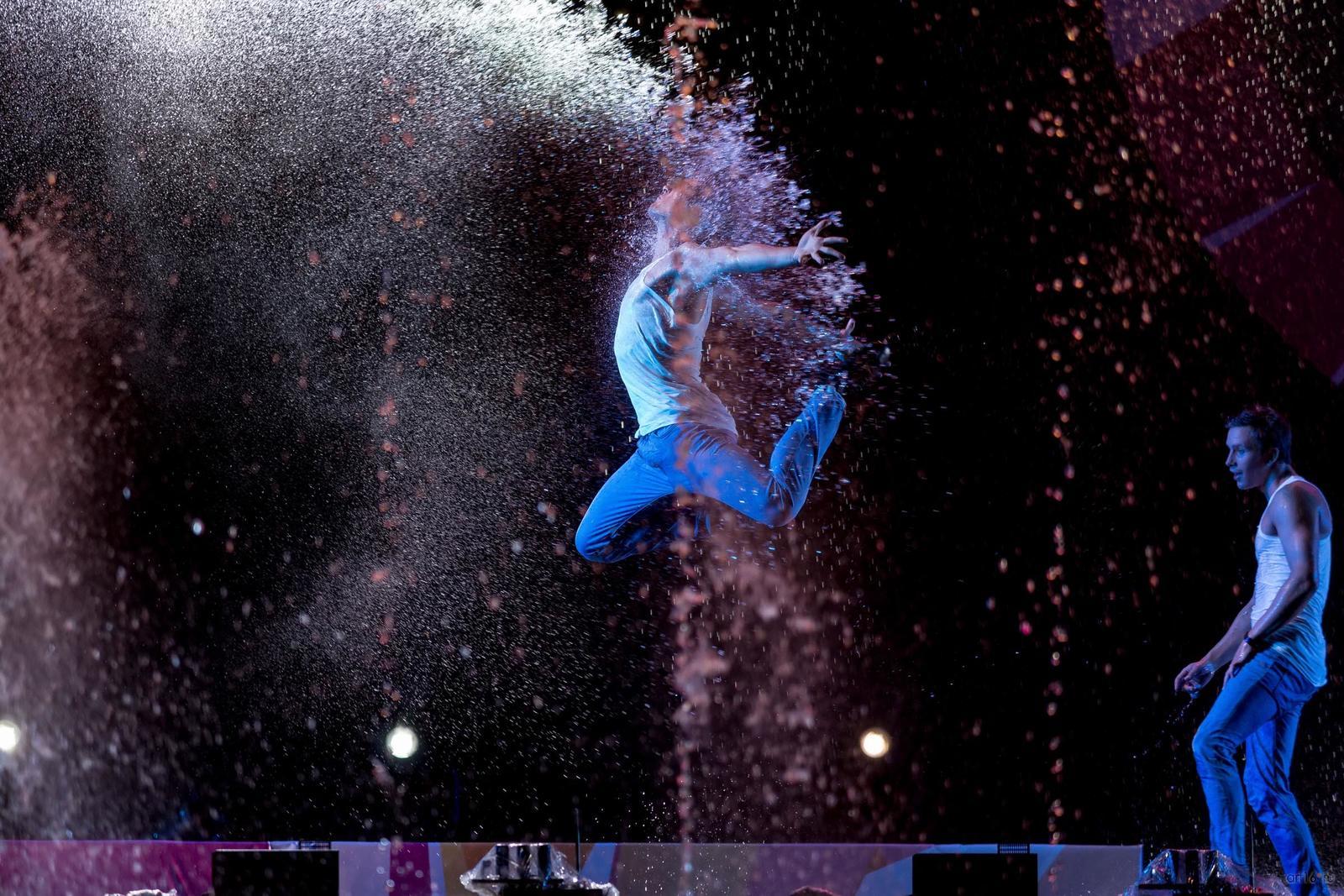 Фото №843783. Art16.ru Photo archiveА завершился — выступлением Санкт-Петербургского театра танца «Искушение», то было шоу под дождем. Исполнители, молодые люди, с оголенным торсом, от души обливались водой, весело шлепали по лужам, исполняя танцевальные и акробатические па, одним словом «искушали».