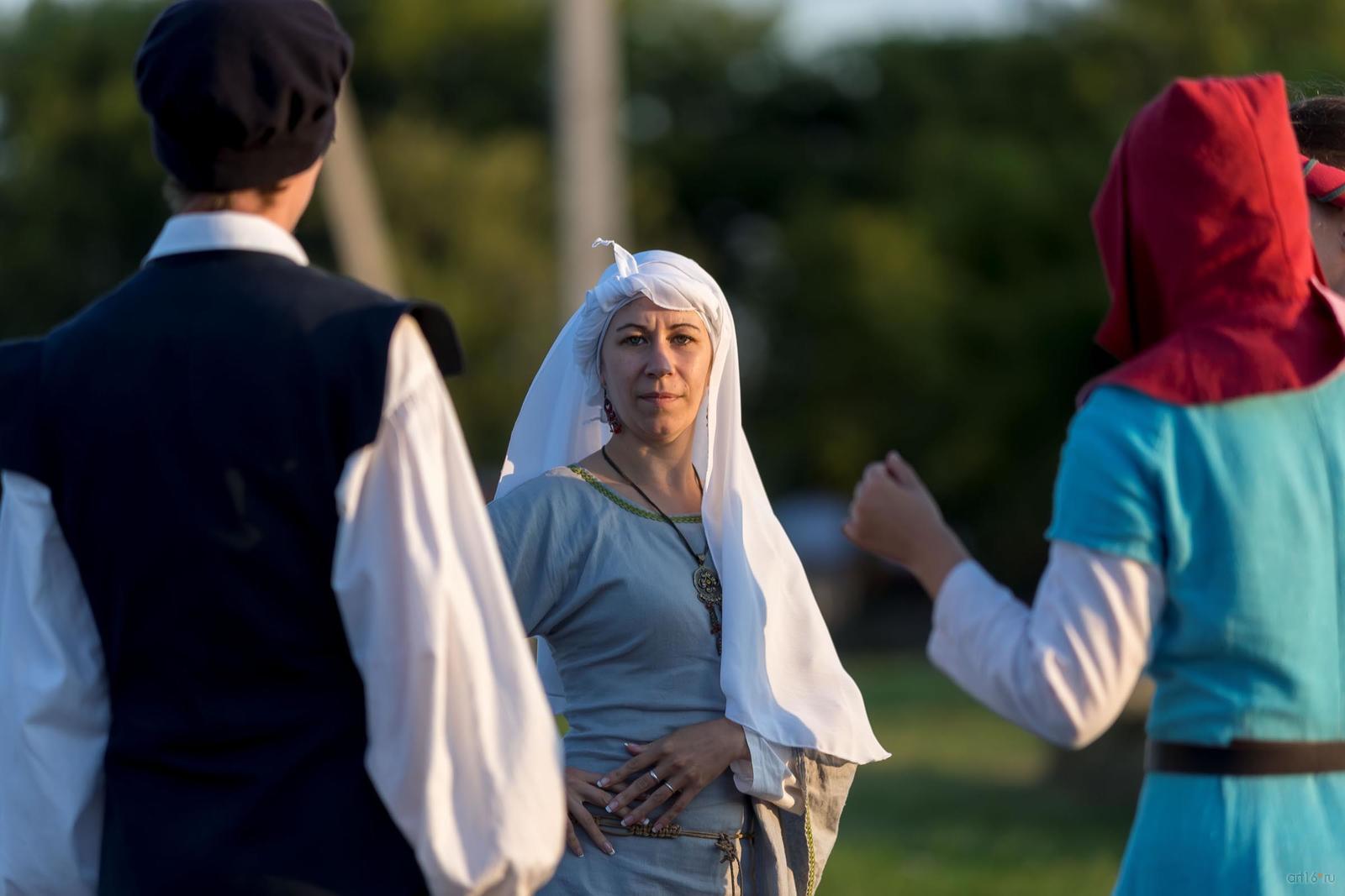 Фото №844509. Art16.ru Photo archiveРядышком две дамы в платьях, стилизованных под средневековые, дают урок по историческим танцам.