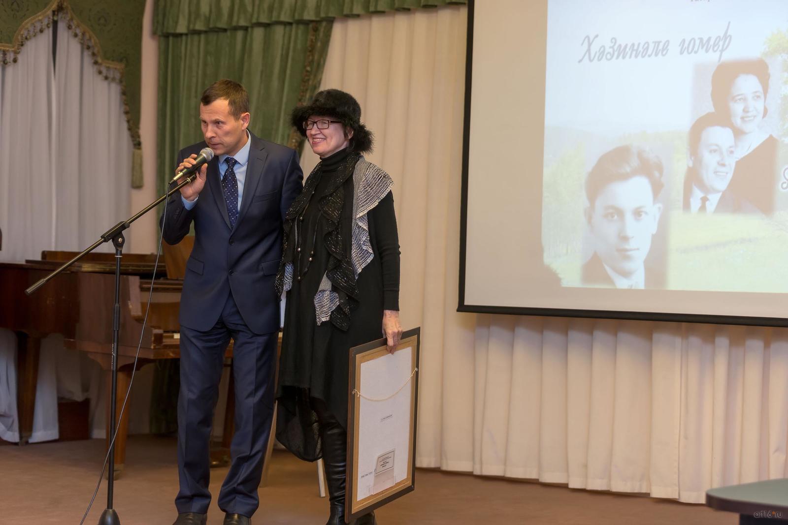 Наиля Гарифовна Ахунова, поэтесса, заслуженный работник культуры Республики Татарстан, лауреат премии имени М.Горького, лауреат премии им. С.Сулеймановой, руководитель ЛИТО КГМУ «Белая ворона», дочь писателя подарила администрации Арского района портрет Гарифа Ахунова, написанный Эротом Зариповым.