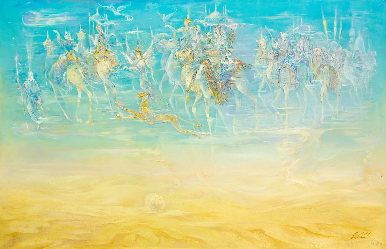 Фото №836761. Мираж. Озад ХабибуллинБыло это в студенческие годы. Сбылась мечта Озада, он увидел пустыню Кызылкум. Жара 50 градусов, в небе висит марево. Неожиданно на небосклоне, где-то над Афганистаном, появился караван. Пустыня сфокусировалась и дала людям диковинное изображение. Трансляция движущего каравана была моментальной, сродни поплавку на воде: вот, он есть и вот, его уже нет! Видение нашло воплощение в картине Озада «Мираж», которую он написал, вернувшись из путешествия по пустыне в Ташкент. Пустыня Озада — это океан, по которому плывет караван. От картины веет щемящим, знакомым и безвозвратно ушедшим временем: принц с дарами, сказочная принцесса, снисходительно принимающая эти дары; ушедшая Цивилизация, унесшая с собой культуру своего времени.
