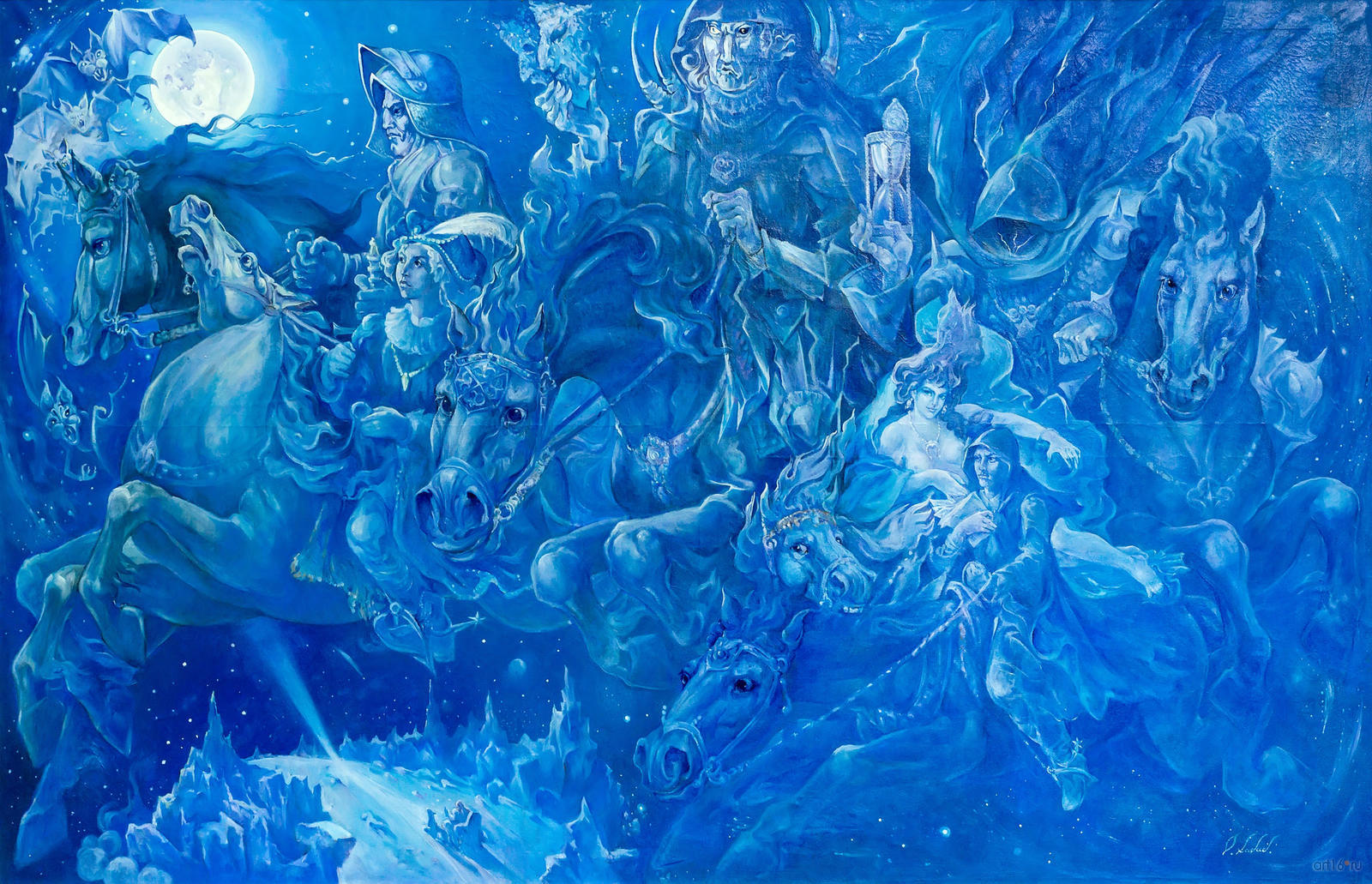 Фото №836767. Мастер и Маргарита. Озад ХабибуллинКартина «Мастер и Маргарита» вынашивалась художником три года, а написана им за 25 дней. Образ женщины занимает главенствующее место на полотне художника. Маргарита ради любви к Мастеру, идущая на сделку с Дьяволом и со Смертью — героиня работы О. Г. Хабибуллина. Все остальные персонажи второстепенные. Смерть, подчеркнуто написана без лица, с песочными часами в руках, показывающими, что время пришло, пора! Дьявол с масками в руках. Придет время и маски рассыпятся, открыв истинные лица персонажей романа.