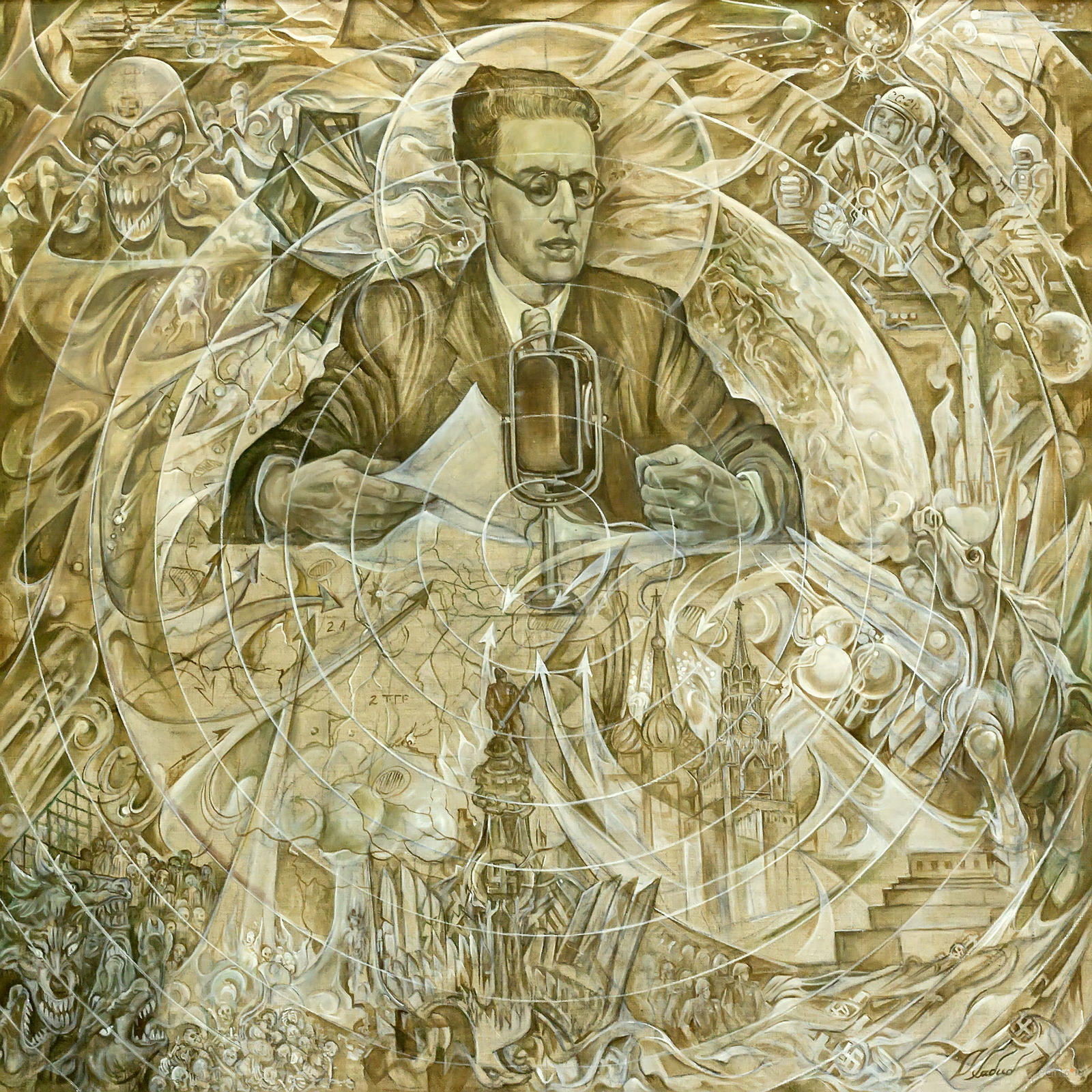 Фото №836786. Левитан. 70 лет Победы. Озад ХабибуллинСам художник, рожденный в 1949 году, не мог быть свидетелем тех грозных событий. Рассказы отца, ушедшего на фронт из Казани молодым офицером, не дали посыла к написанию картины. И Озад вспомнил про голос Левитана, звучащий в эфире. С этим голосом у О.Хабибуллина ассоциируются все победы Советского Союза в послевоенный период: запуск первого спутника, полет Юрия Гагарина и др. В центре полотна — Левитан Юрий Борисович у микрофона, читает сводку новостей. От микрофона исходят радиоволны и ими накрыта вся поверхность картины, наполненная разноплановыми событиями. Здесь карты военных действий, фашисты в виде оскалившихся собак, поверженный орел, салют на красной площади и многочисленные победы советского народа.