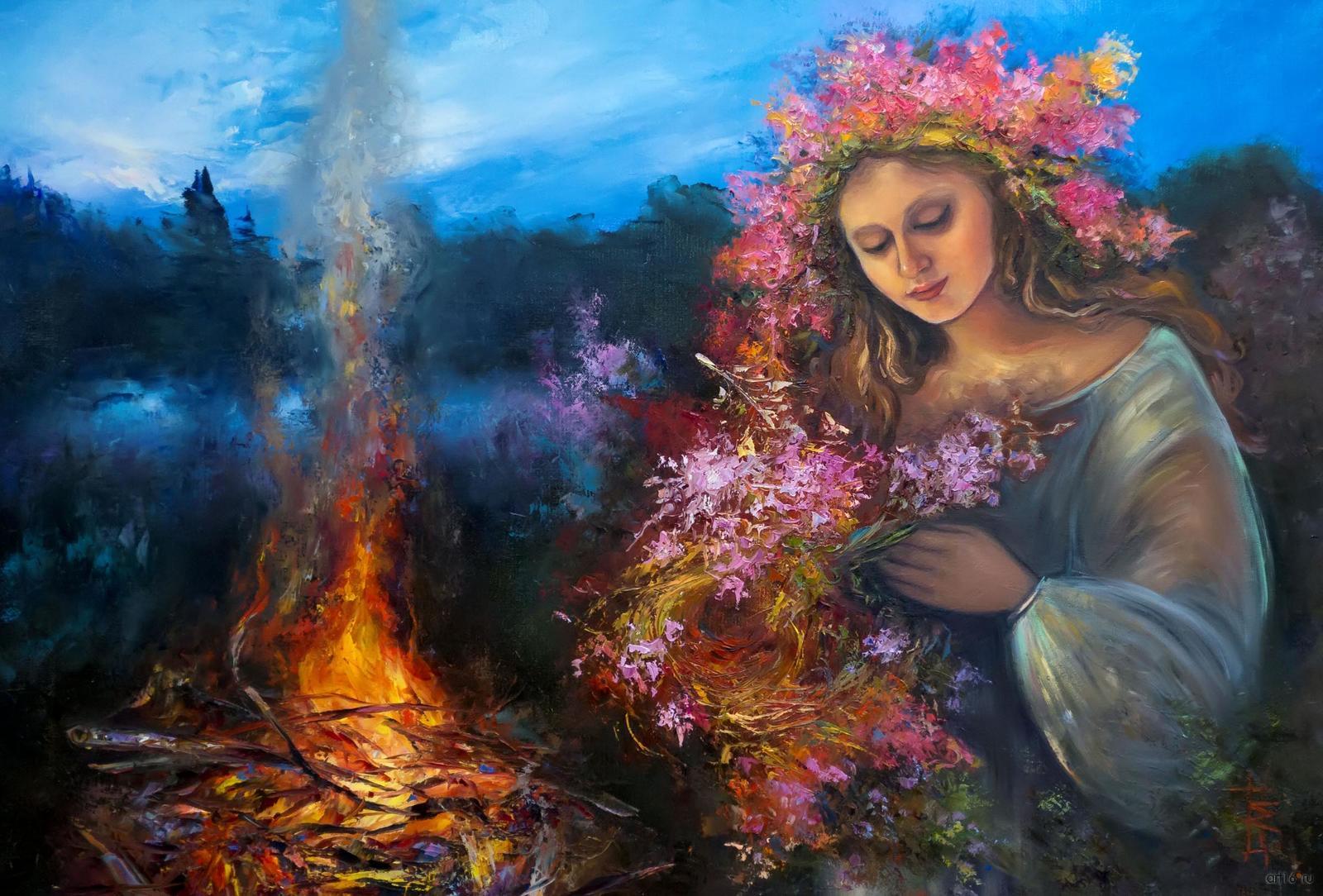 С тщательно и с любовью прописана героиня картины «Веночек на рассвете»: утренний туман, дымок от костра подчеркивают мечтательный и нежный образ девушки, грезящей о любви.