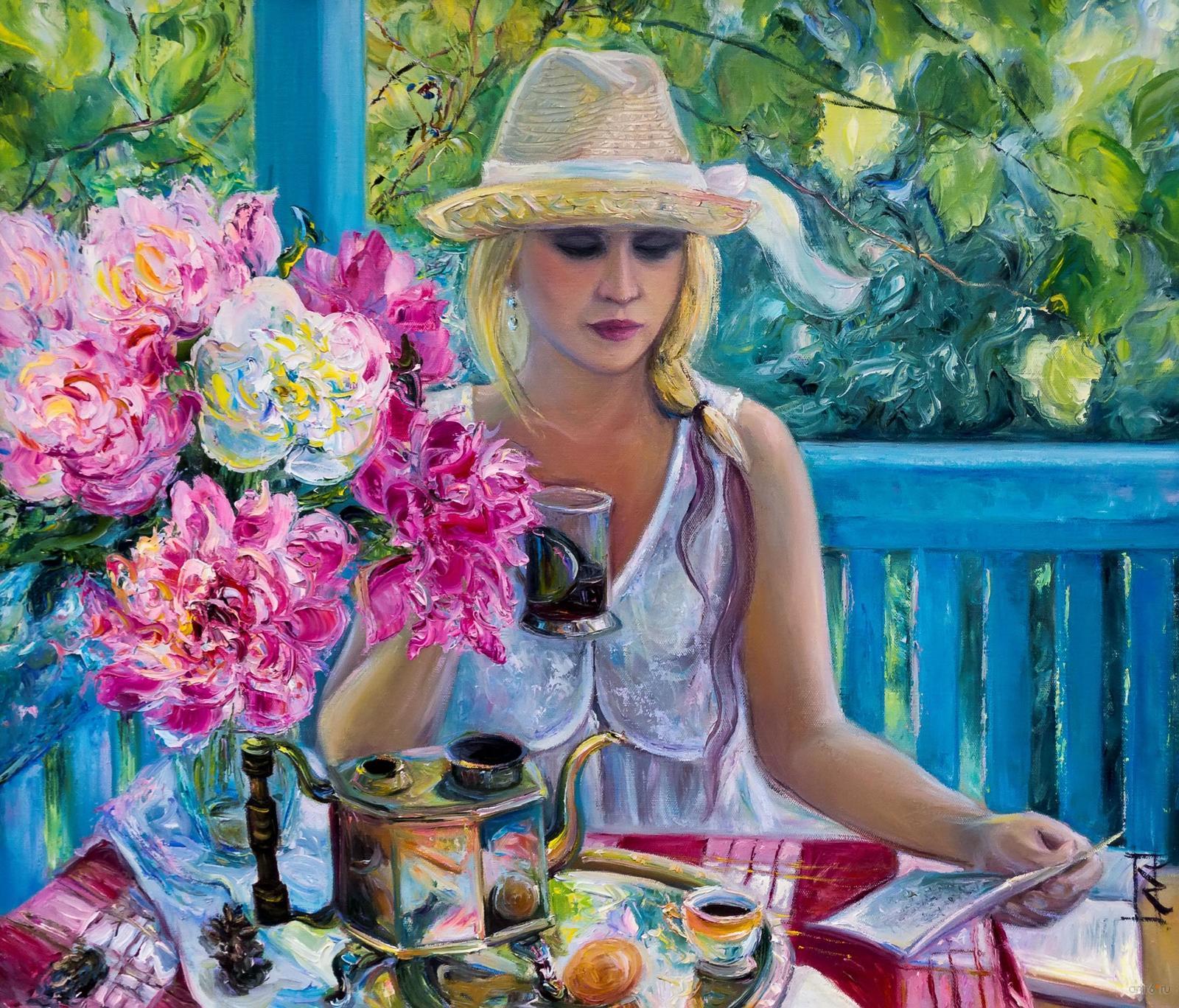 Чувствуешь сосредоточенность девушки в шляпке, читающей письмо на веранде дачи.
