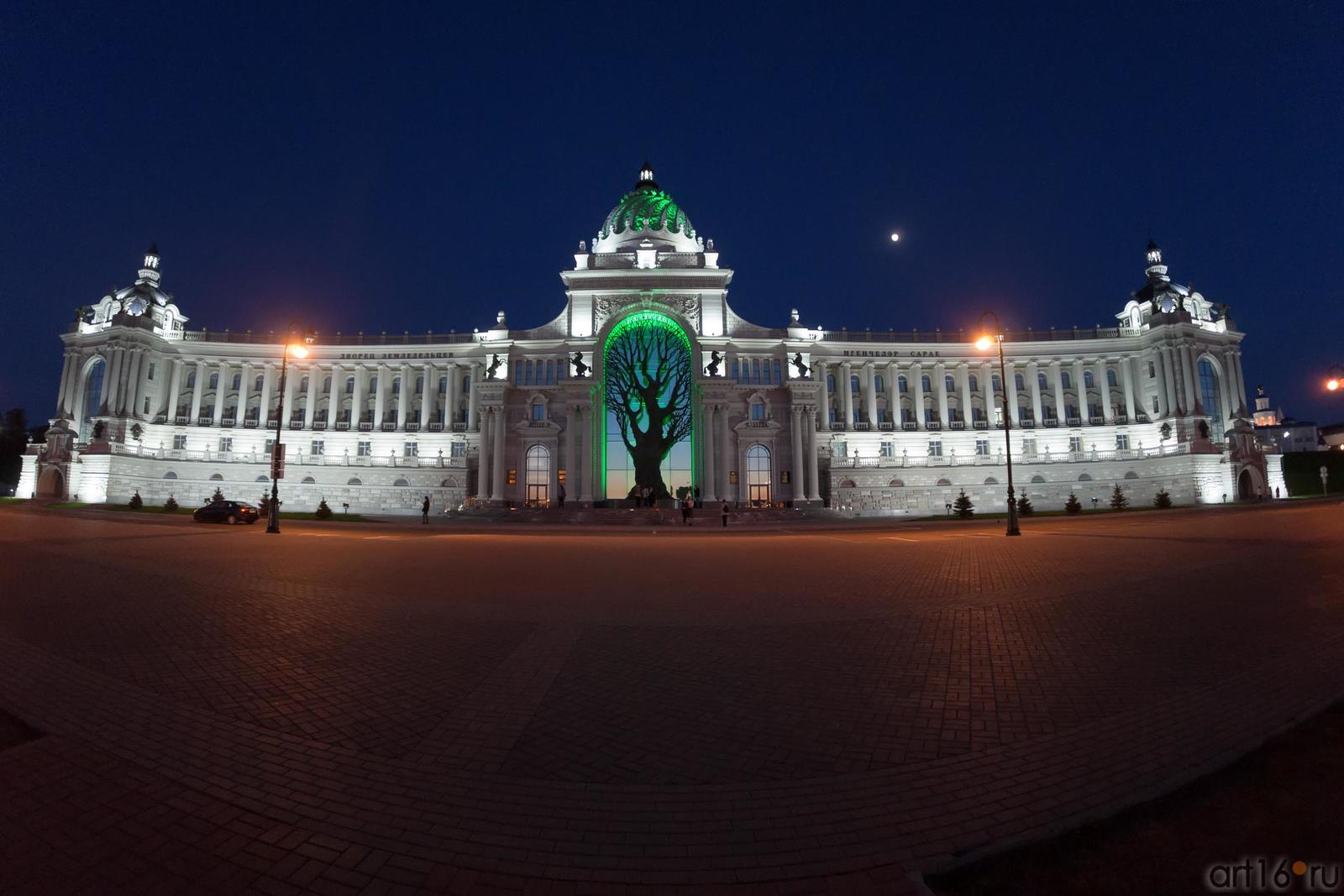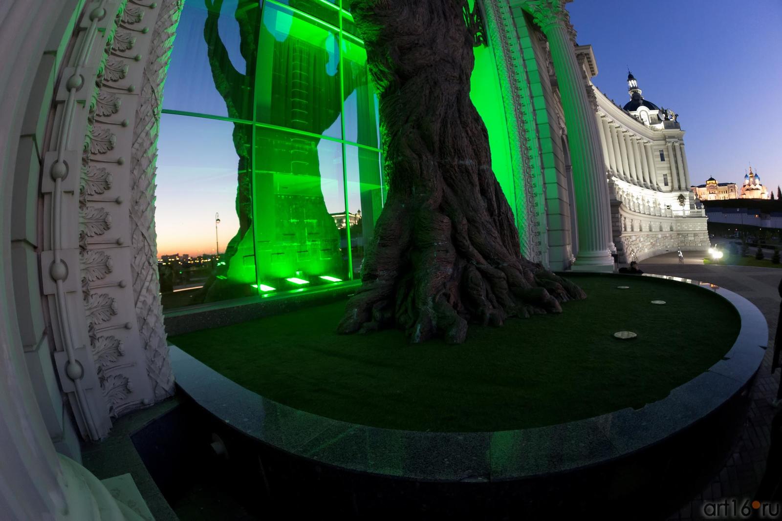 Фото №887050. Отражение. Дерево из бронзы, 20 метров с подсветкой. Дворец земледельцев. КазаньИсторически здесь была малогабаритная жилая постройка, максимум в 3 этажа. Сейчас стоят монстрические высотки, явно несоизмеримые с Кремлем. Правило, что масштаб новых построек должен подчиняться кремлю, в Казани не работает. Кремль теряется на фоне зданий на Дворцовой площади. Все это современная Казань, с Акбарсами, похожими на Грифонов, и превосходящими своим размером коней на фасаде. Туристы и казанцы по-разному относятся к этому месту. Кто-то видит в нем красоту, достойную восхищения, кто-то ругает на чем свет стоит. Время рассудит.