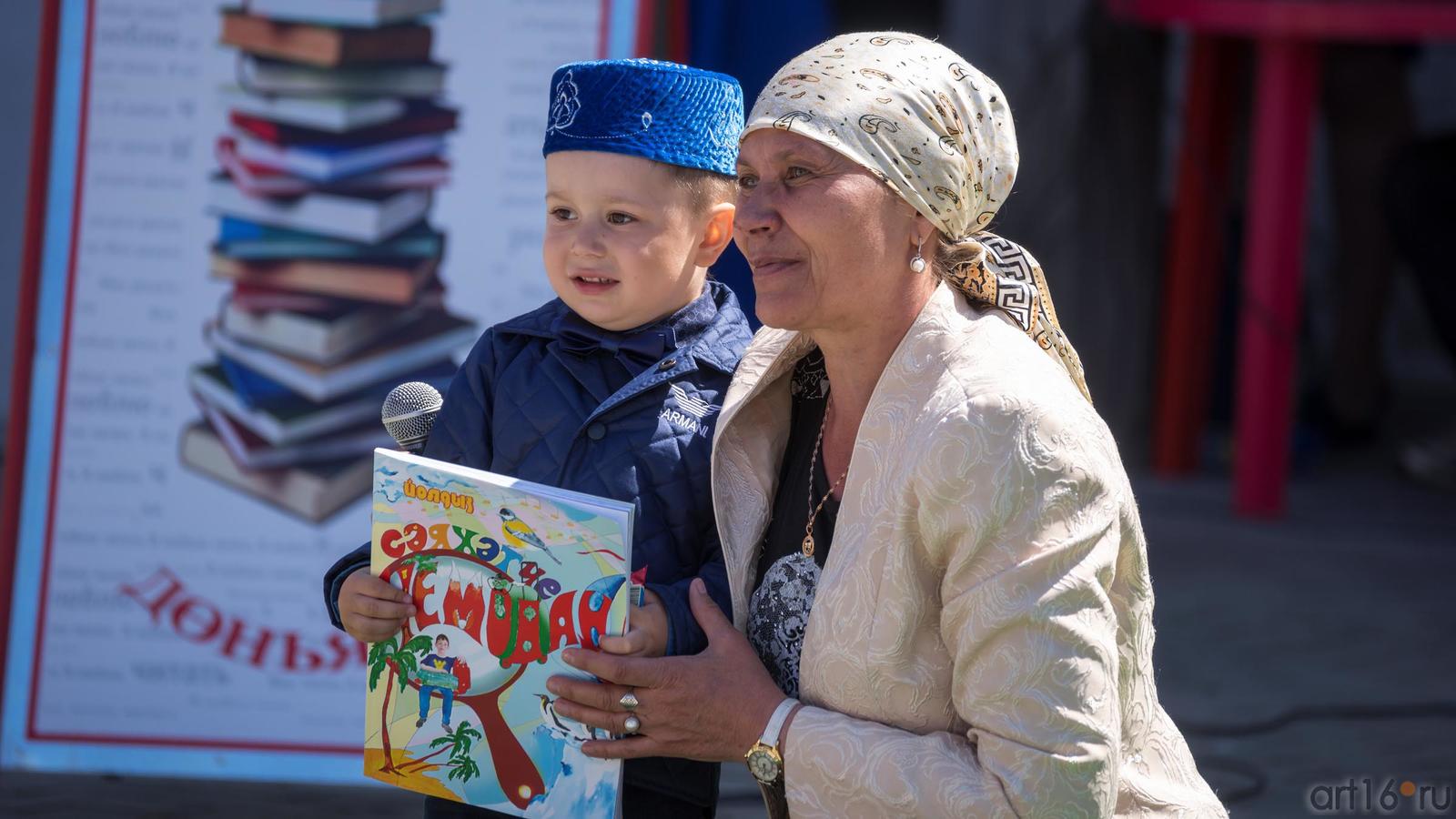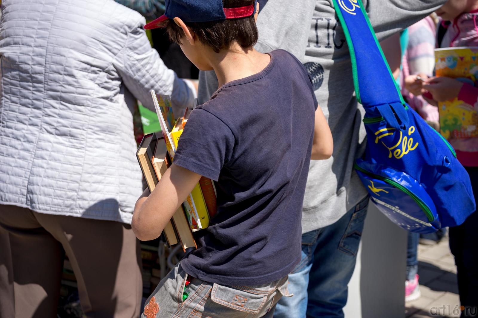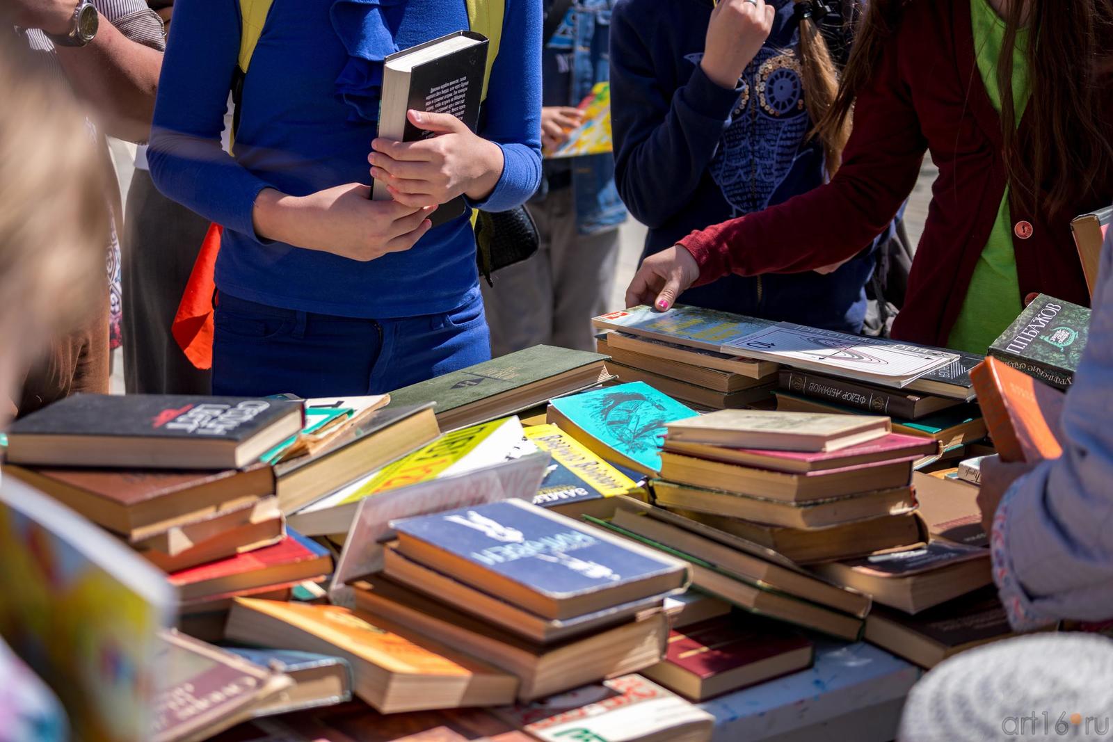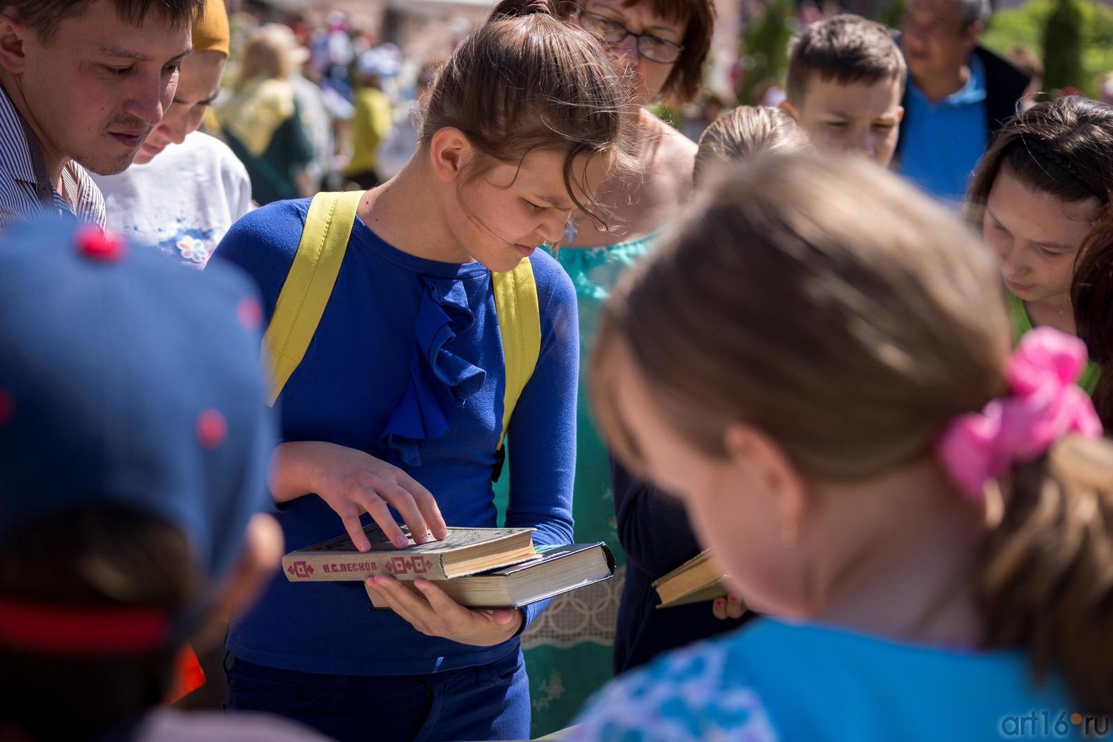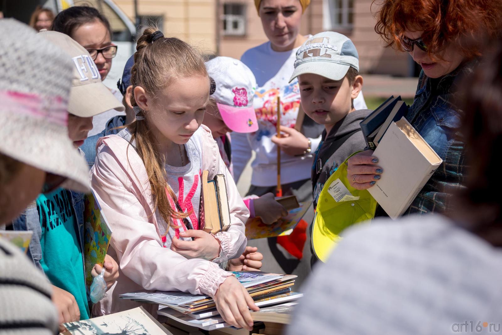 Фото №889462. Art16.ru Photo archiveРаботает припаркованный «Билиобус» (библиотека на колесах). Устроена выставка-продажа книг и журналов, фотовыставка «Читающая Казань». Дети рисуют, читают по ролям, отвечают на вопросы викторины.