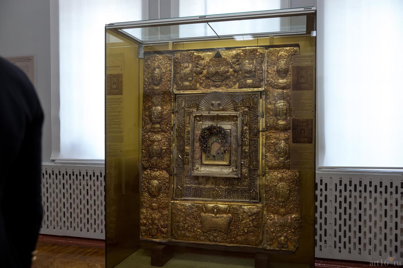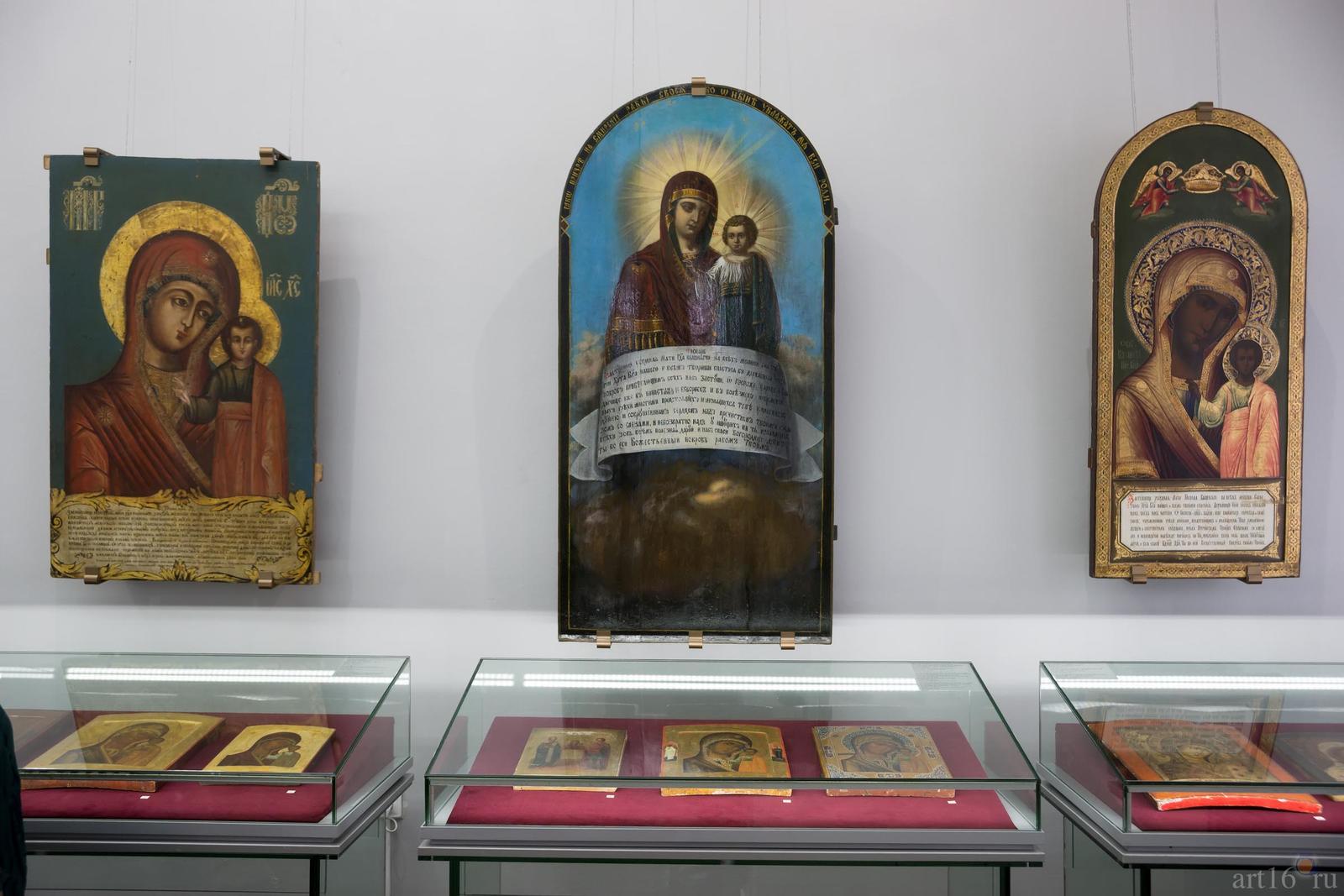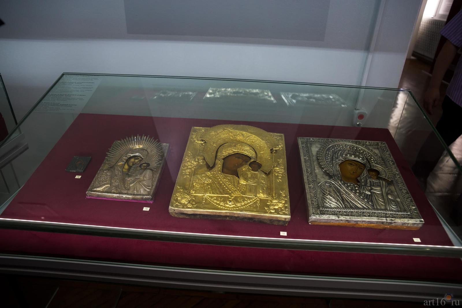 Фото №891802. Art16.ru Photo archiveЗнаменательные образы Богоматери: Всеблаженнейшая (Паммакариста) из собрания НМ РТ, Иверская («Вратарница») из собрания ГМИИ РТ, а также позолоченная серебряная риза - оклад с Чудотворной Казанской иконы Богородицы из собрания НМ РТ впервые выставлены вместе как особенные святыни Казанского Богородицкого монастыря. Целостное и масштабное по репрезентативности собрание икон в драгоценных окладах и произведений декоративно-прикладного искусства из казанских частных коллекций представляет образ Казанской Богородицы в разновременных почитаемых списках Чудотворной иконы, распространенных на территории России. Впервые экспонируются иконы, созданные в живописной мастерской Казанского Богородицкого девичьего монастыря (1867-1928 гг.), являвшейся крупным центром иконописания.